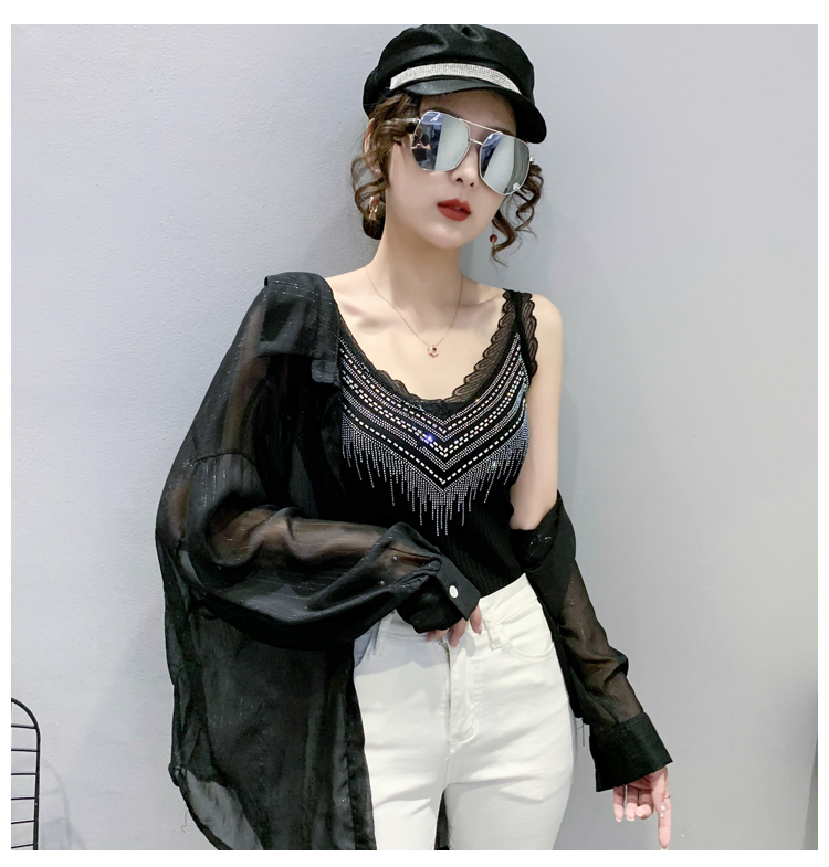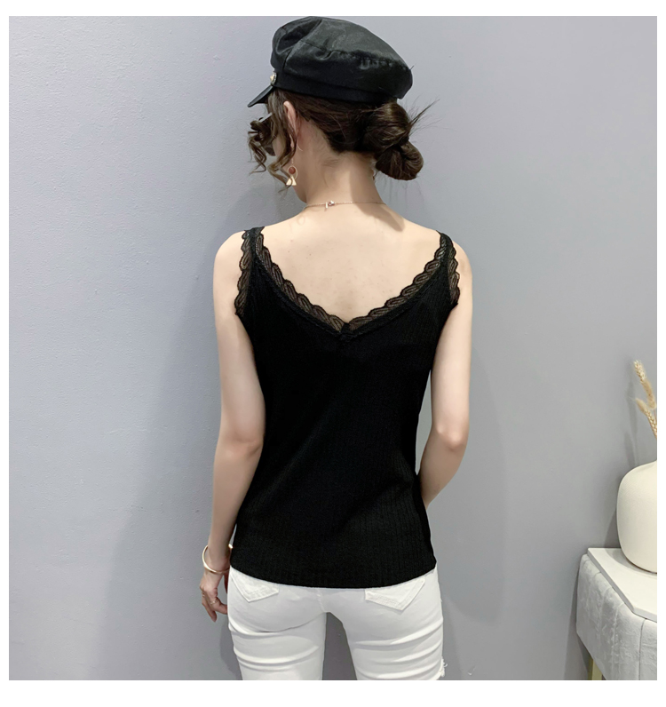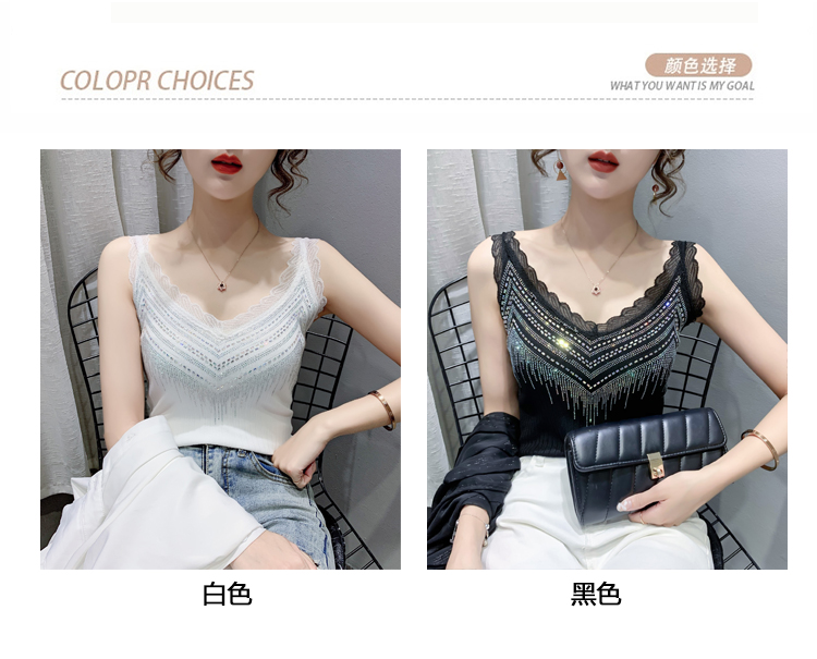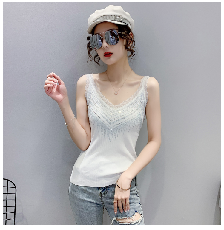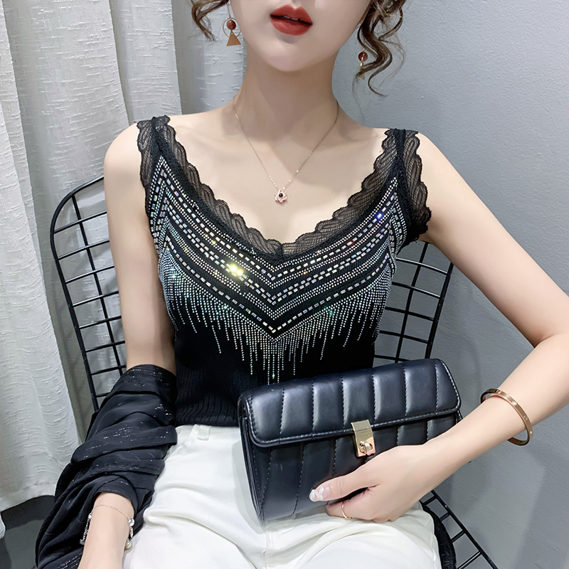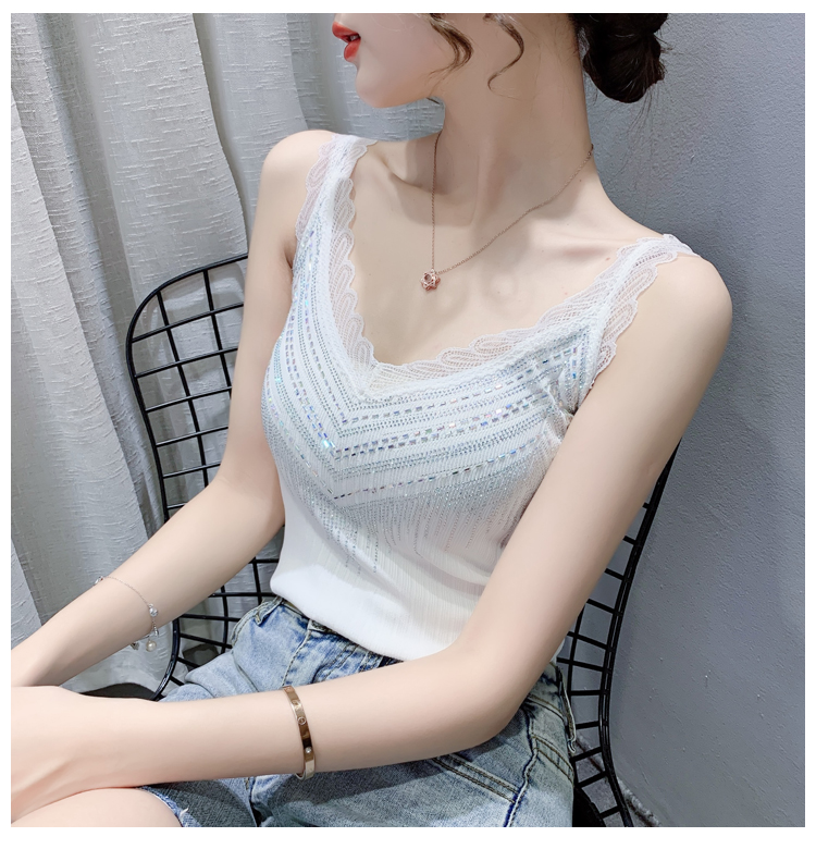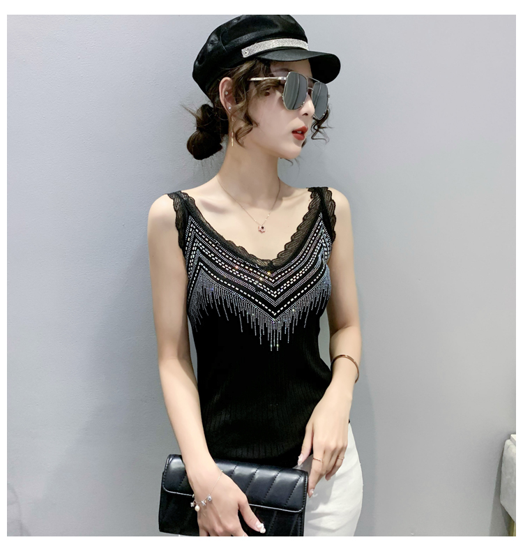 PF1528#春夏新款V领烫钻蕾丝花边无袖打底衫修身套头上衣女背心吊带