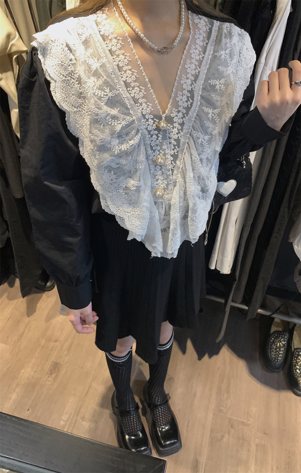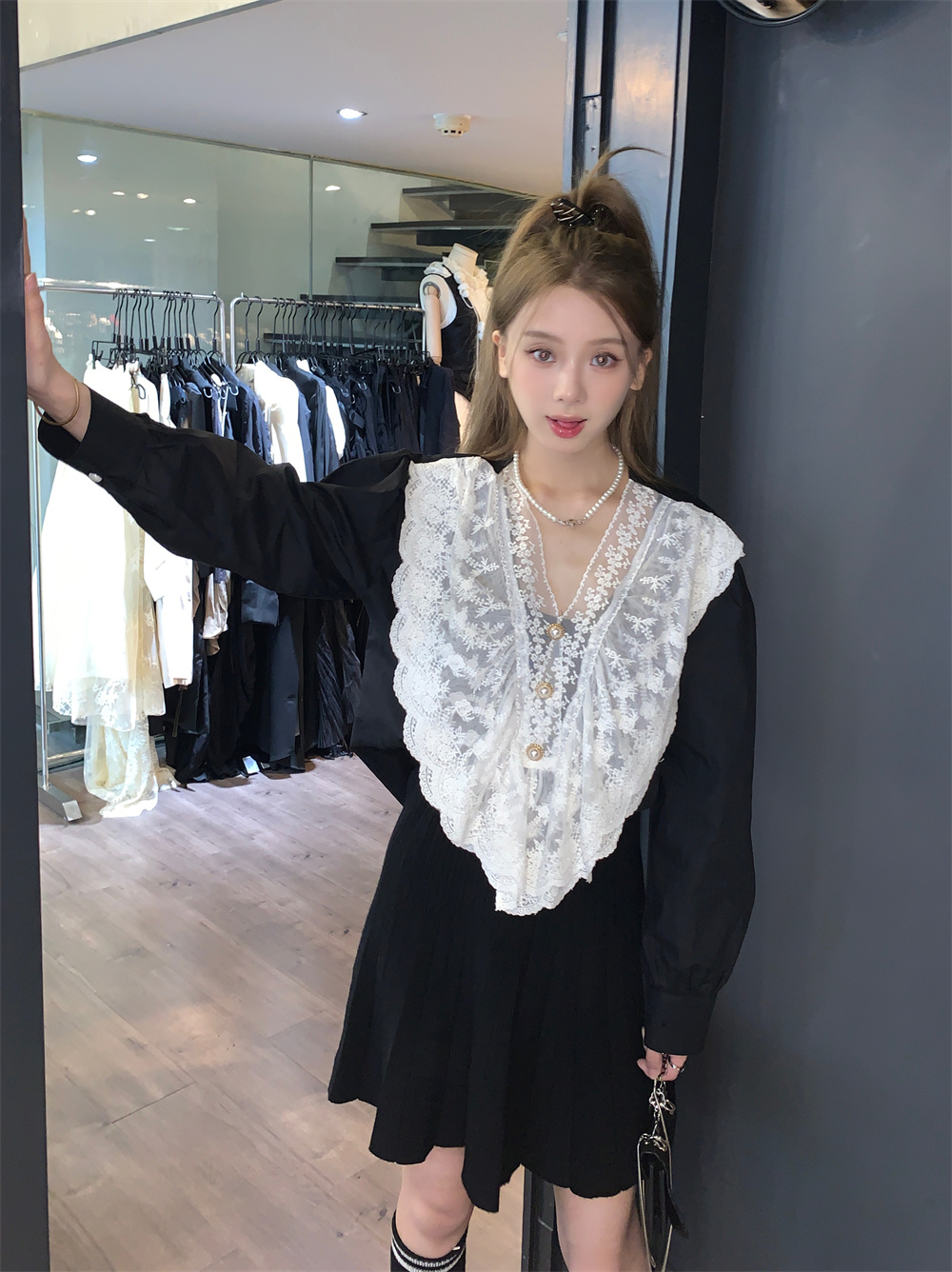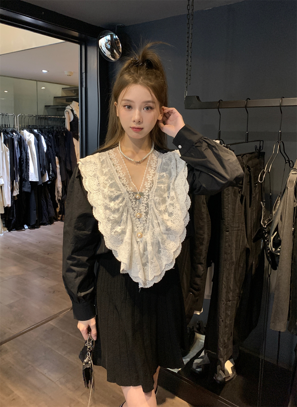 PF1589#新款荷叶边蕾丝拼接v领衬衫女设计感小众百搭上衣