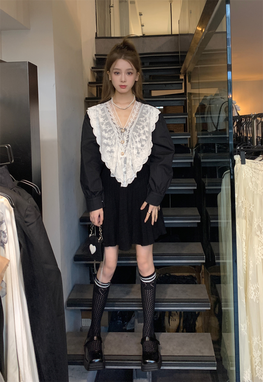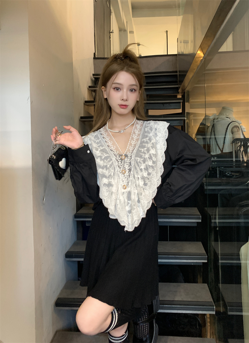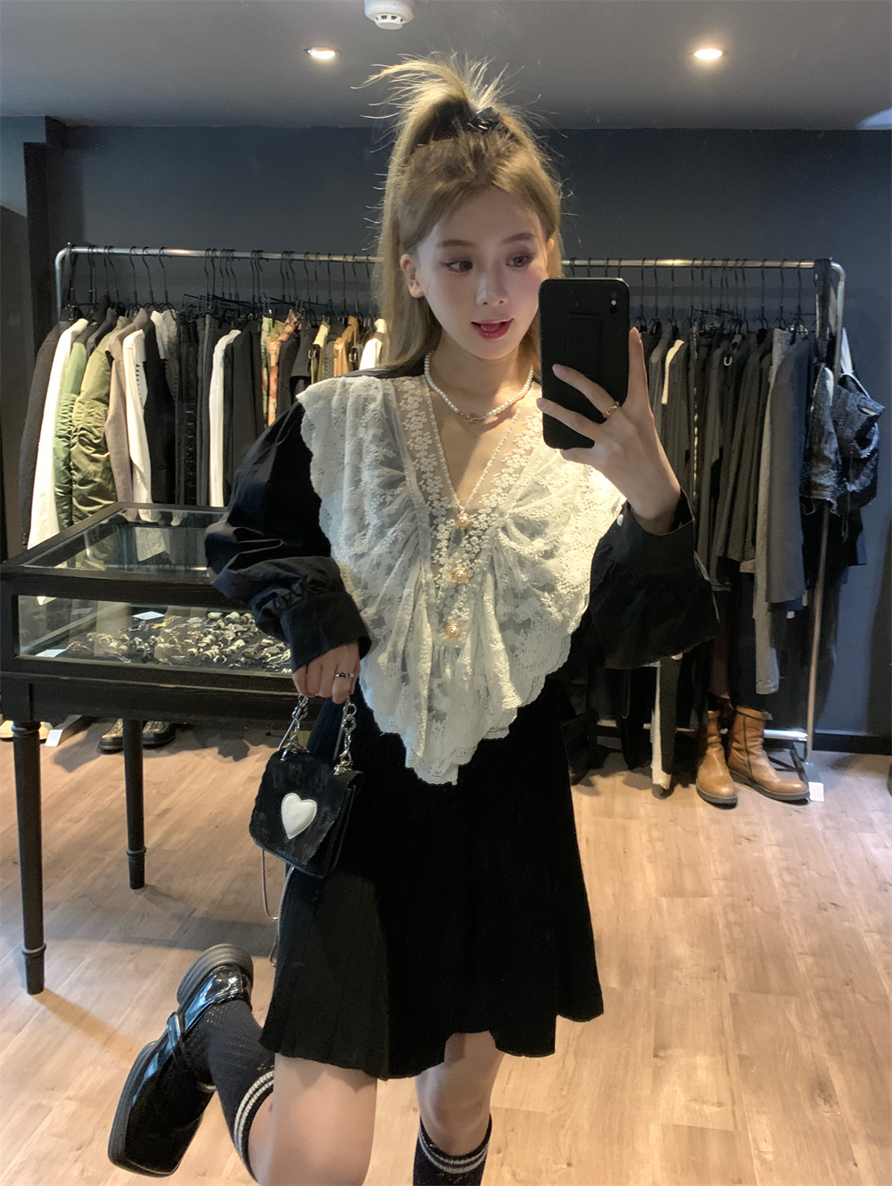 PF1589#新款荷叶边蕾丝拼接v领衬衫女设计感小众百搭上衣