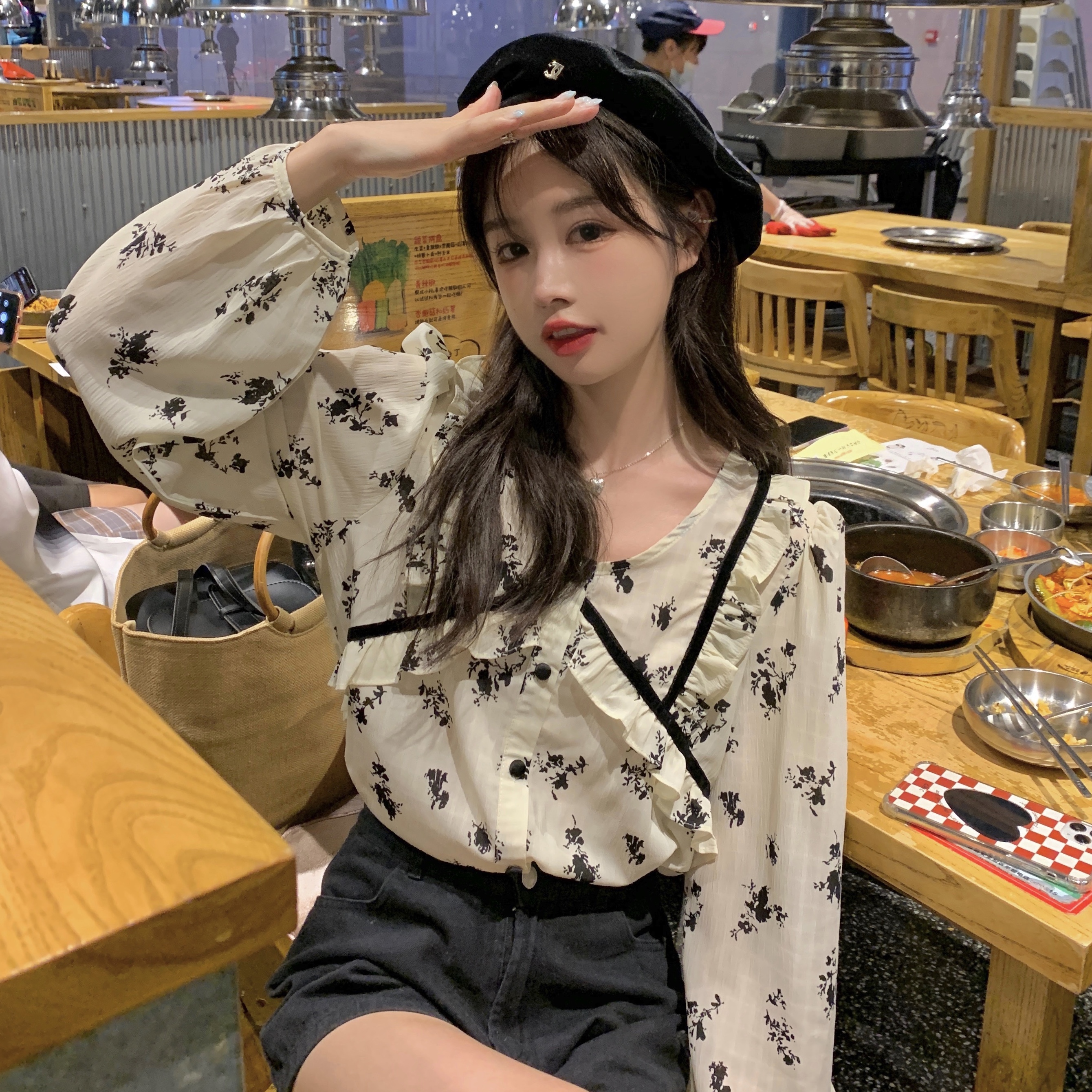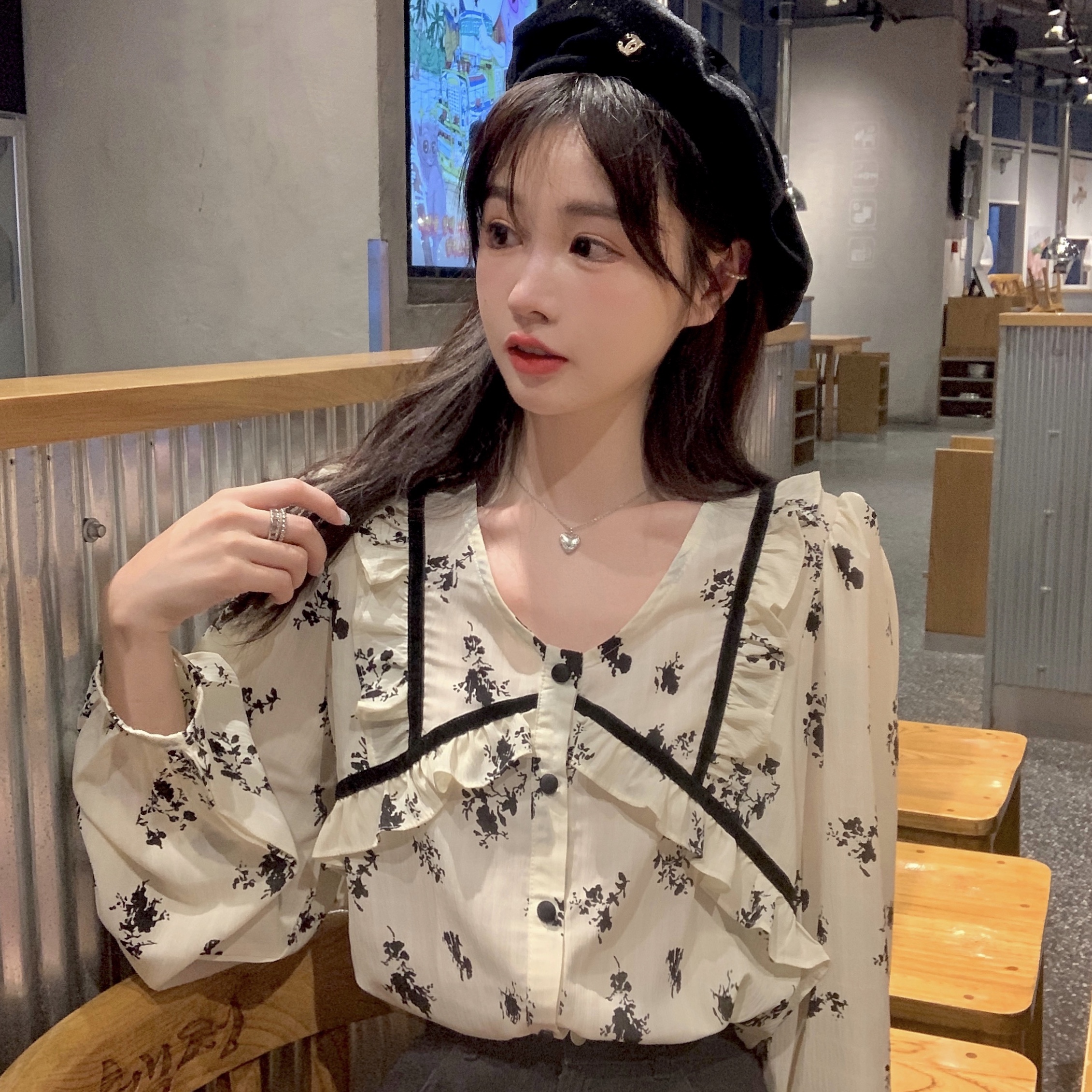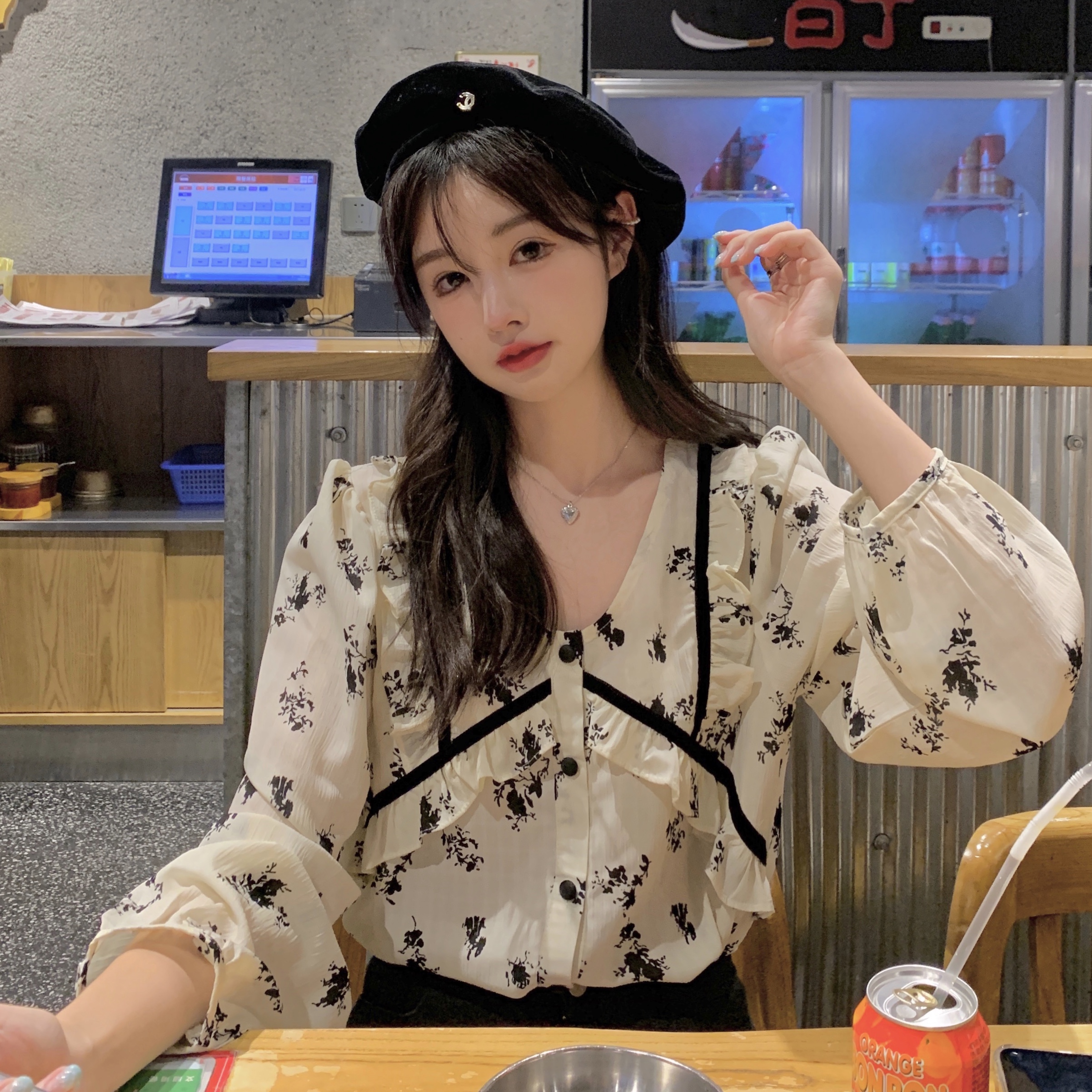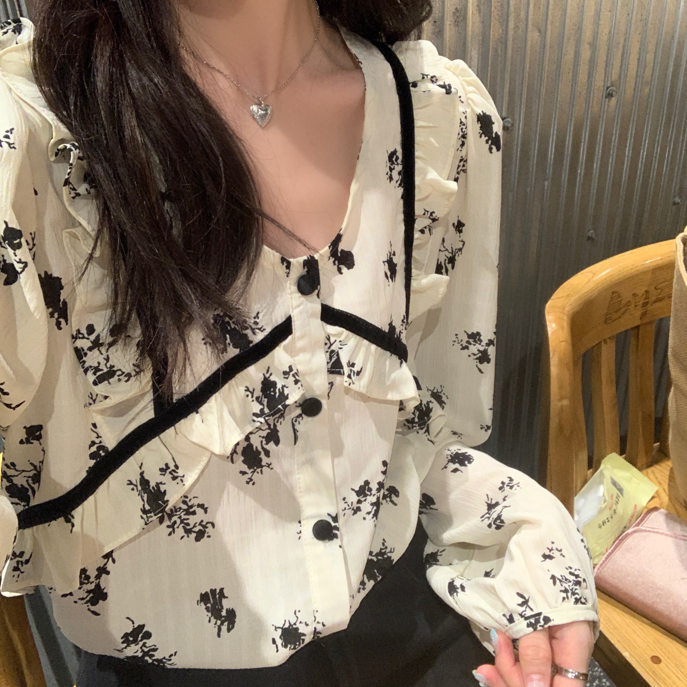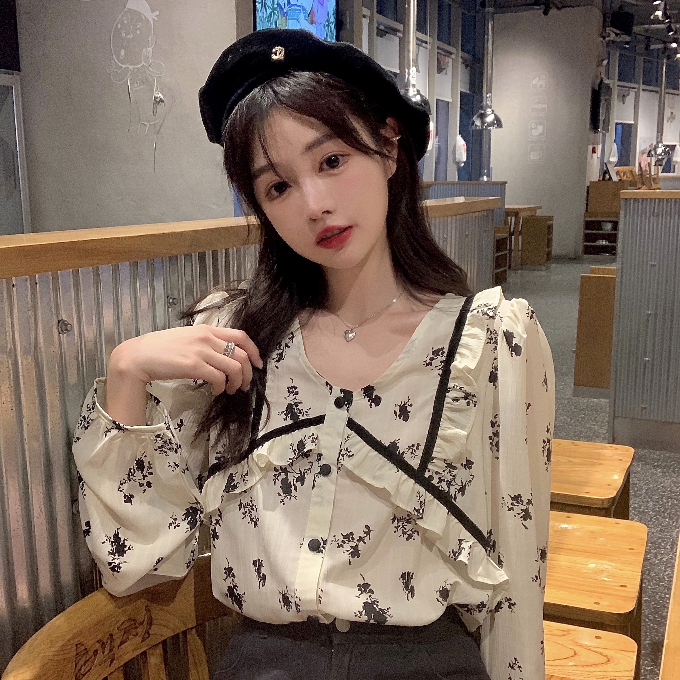 PF1594#大码女装春季胖妹妹设计感木耳边V领碎花长袖衬衫显瘦