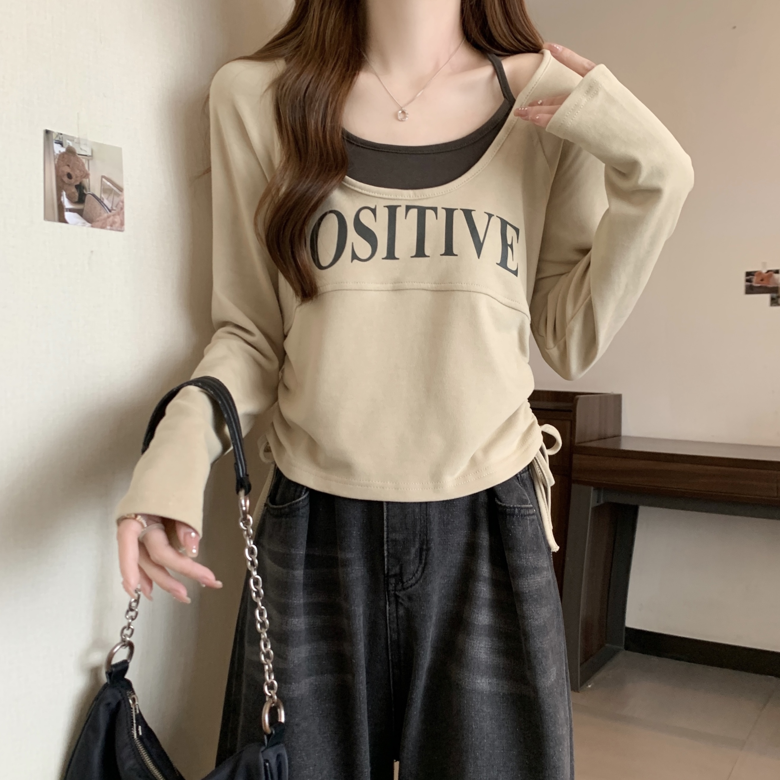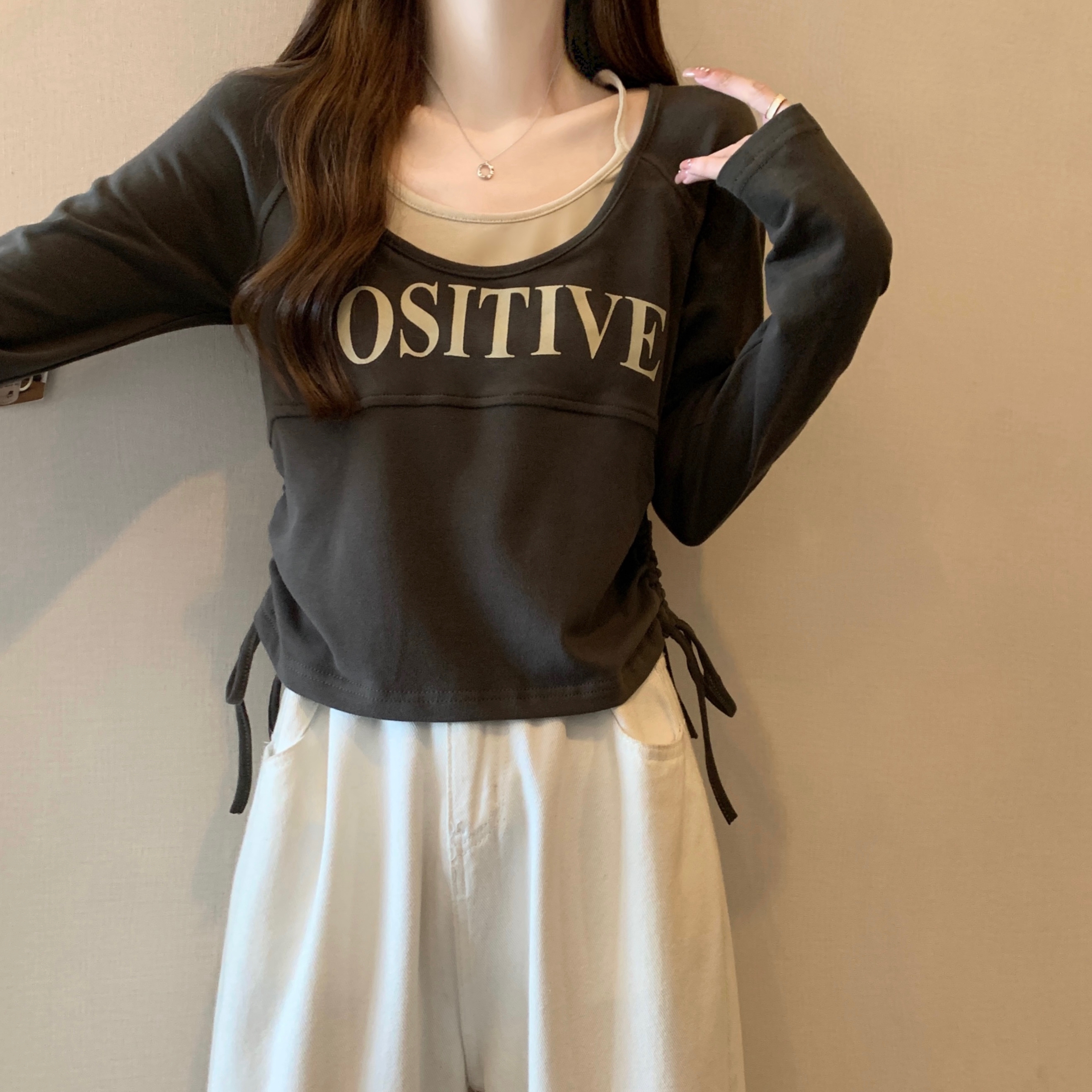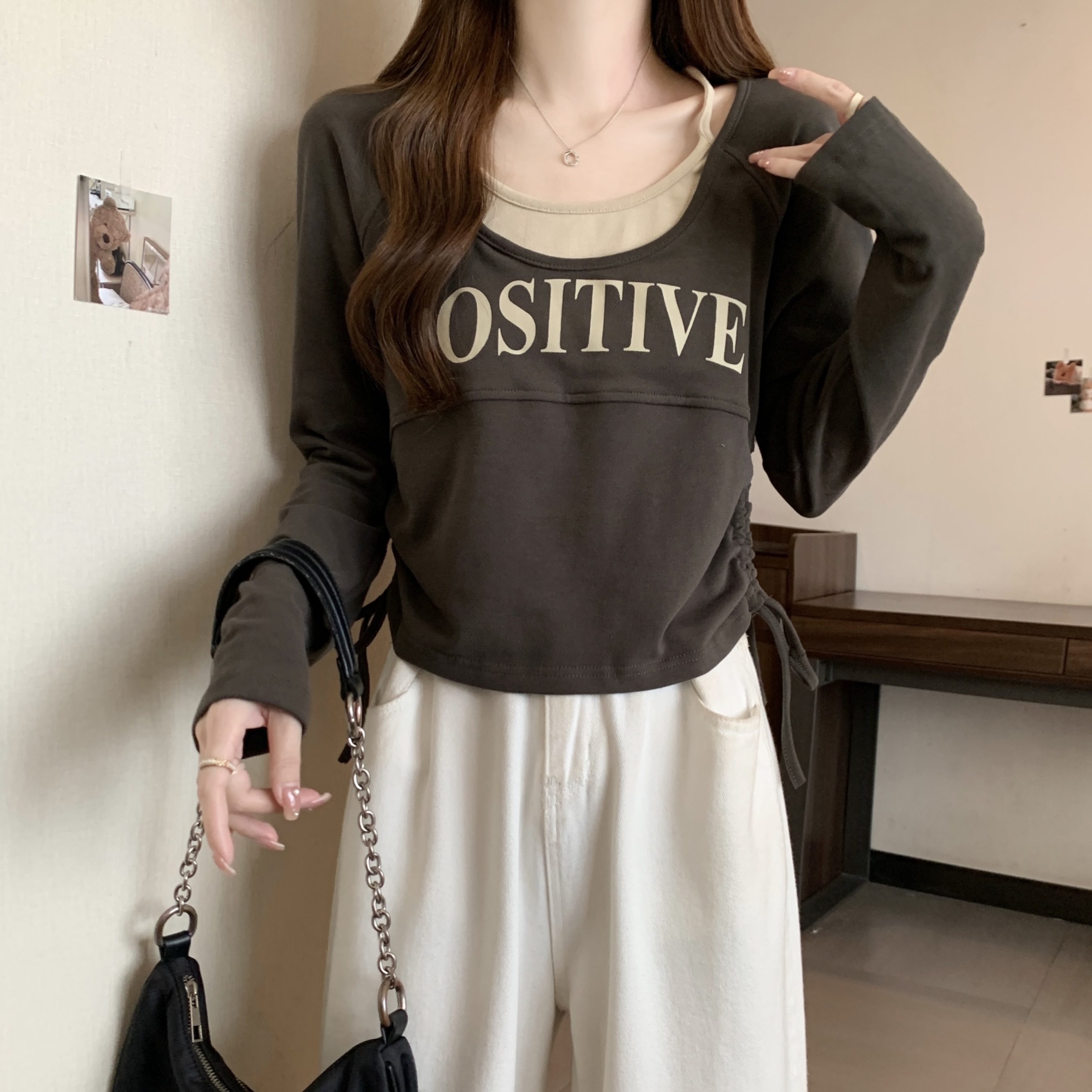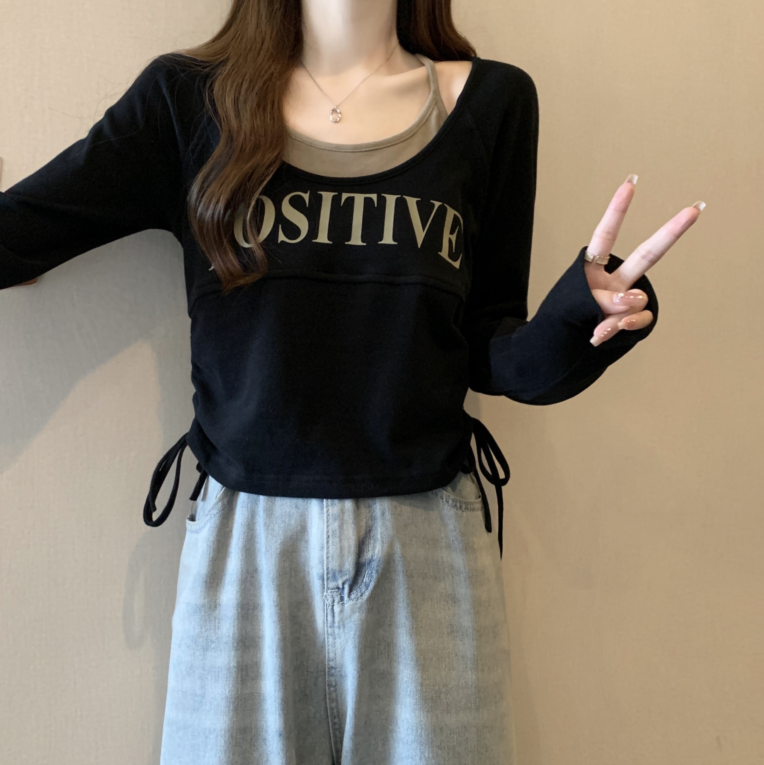 PF1595#大码2024春季新款设计感圆领假两件抽绳字母印花T恤显瘦上衣