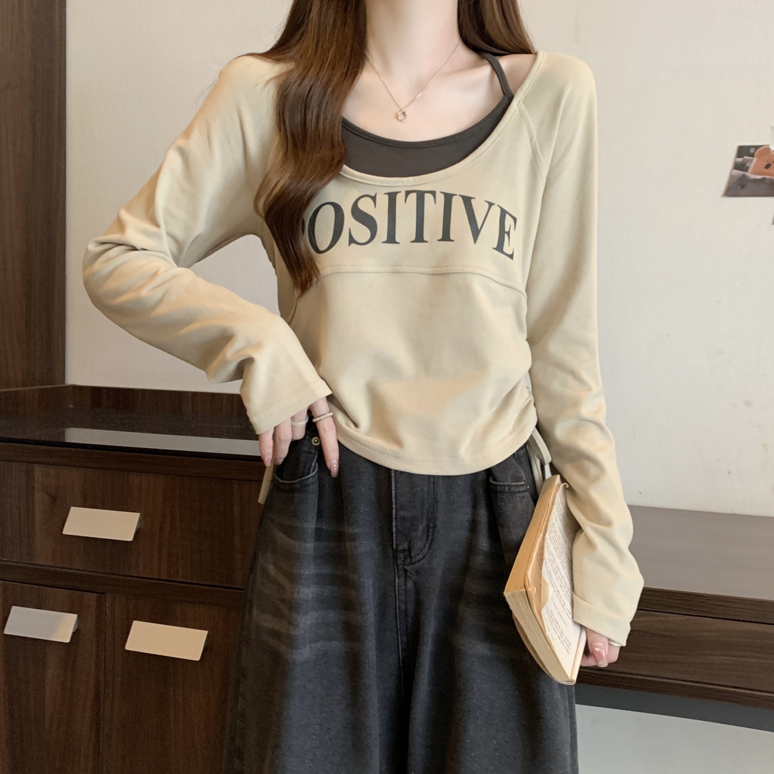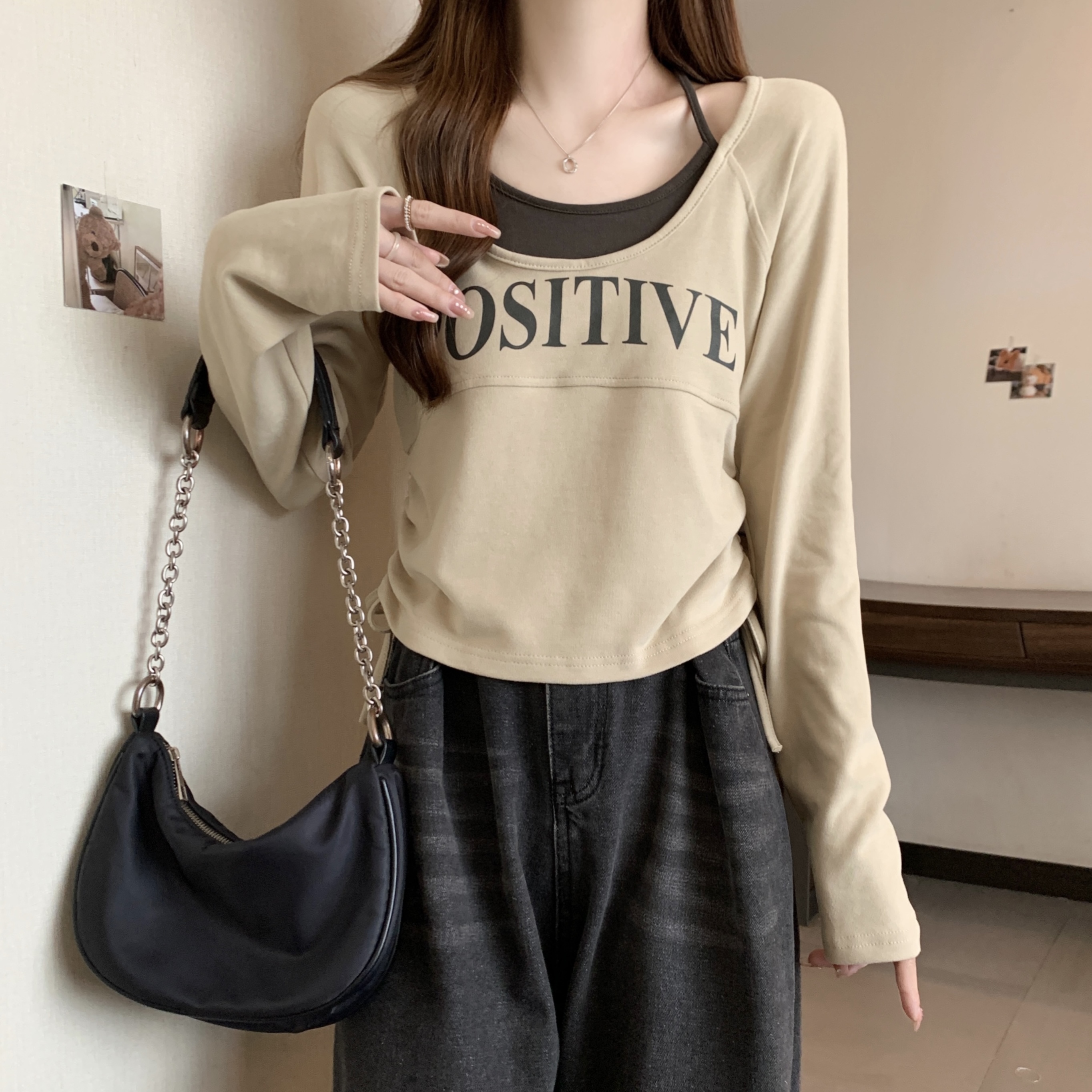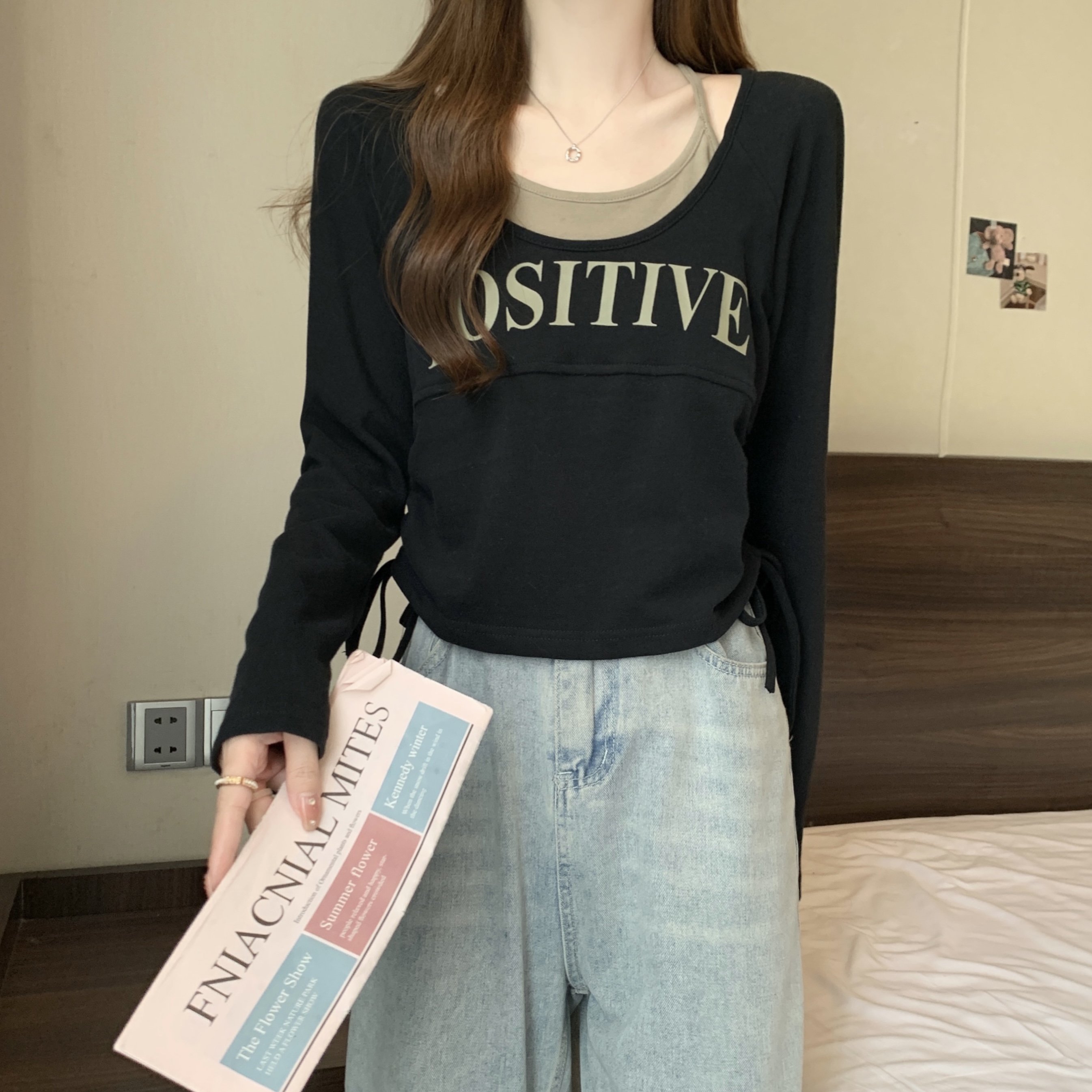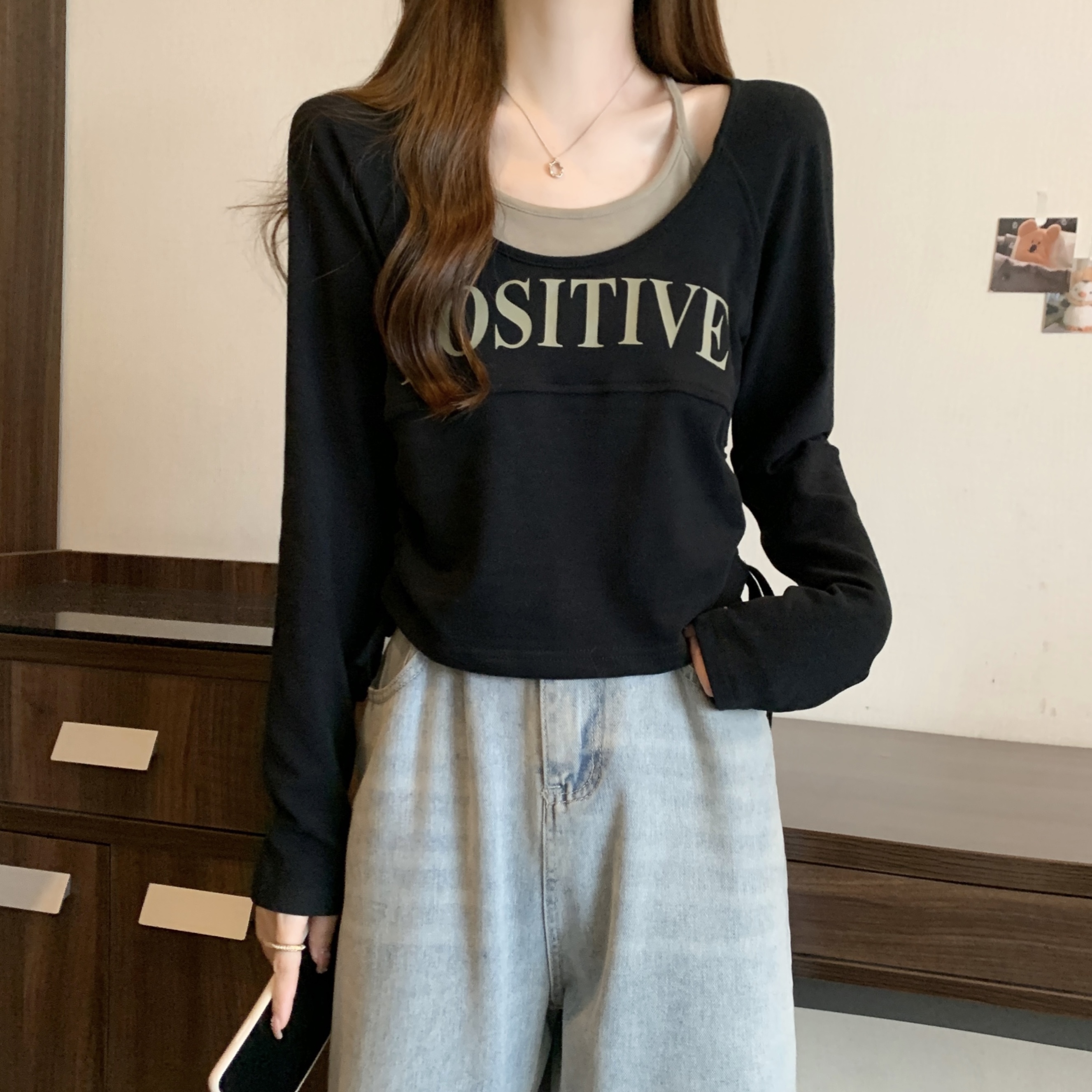 PF1595#大码2024春季新款设计感圆领假两件抽绳字母印花T恤显瘦上衣