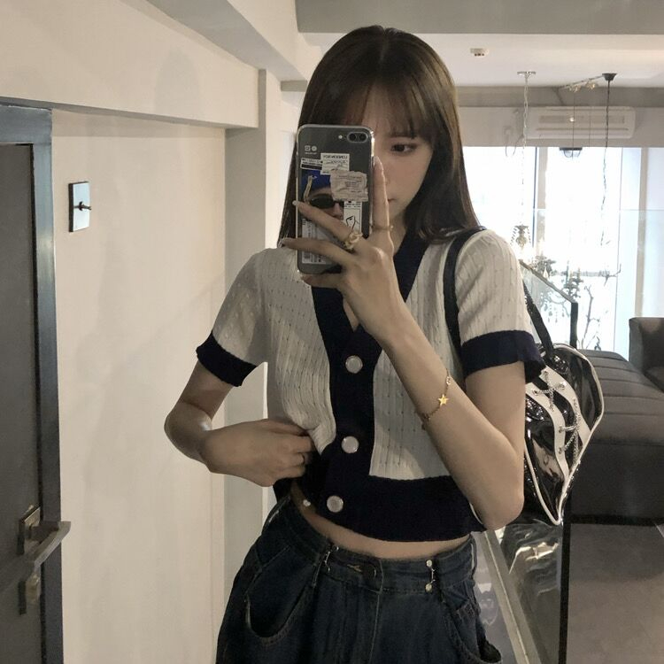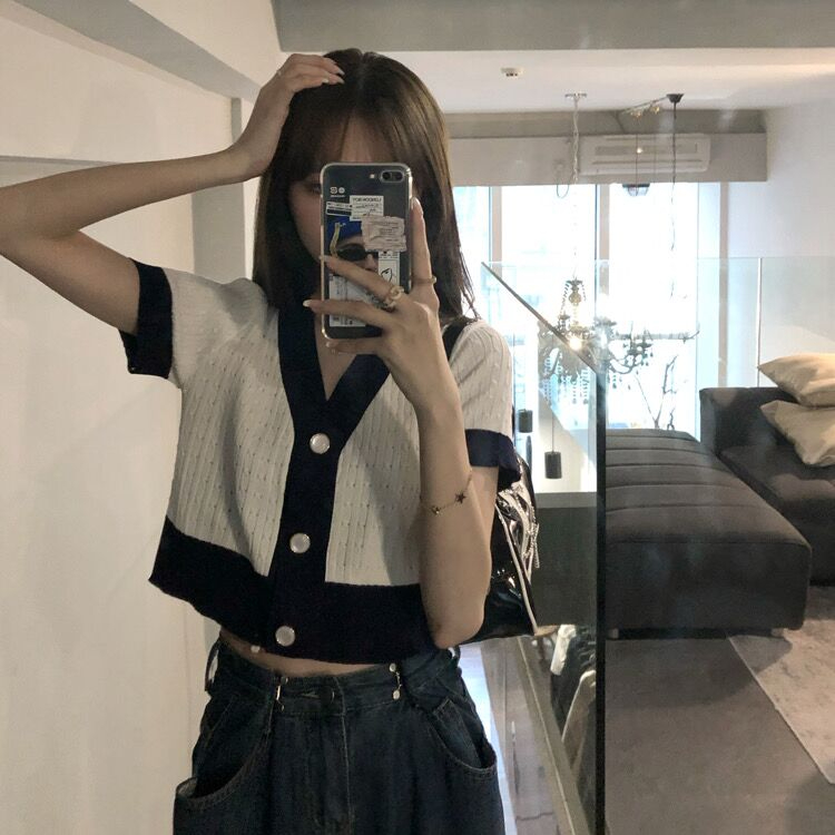 PF1628#夏季宽松v领拼接撞色针织开衫气质百搭短款上衣