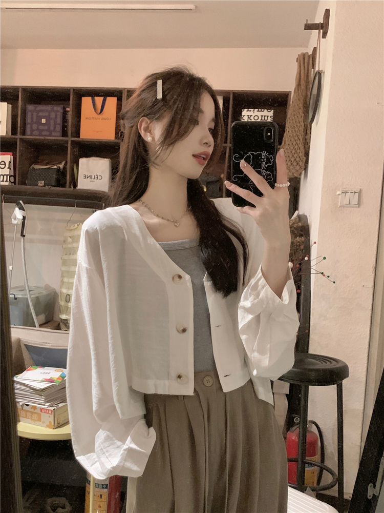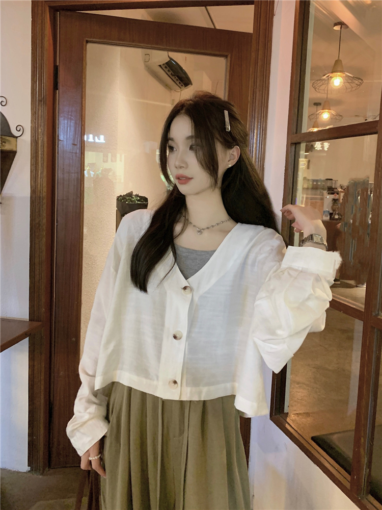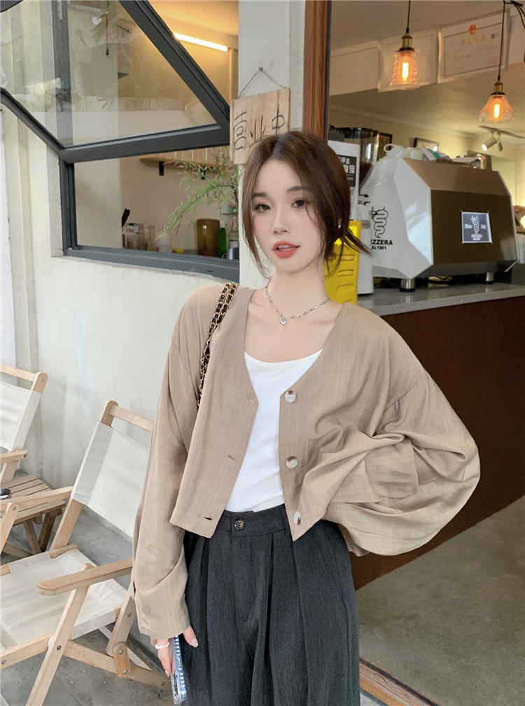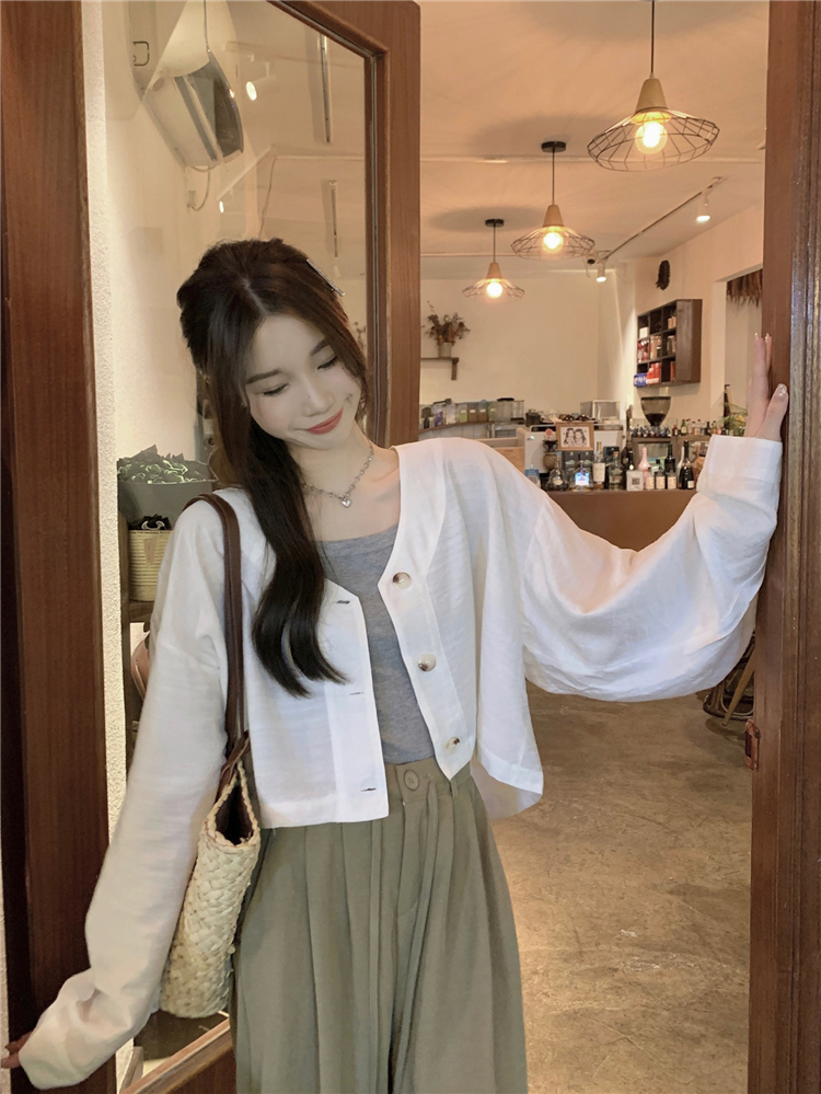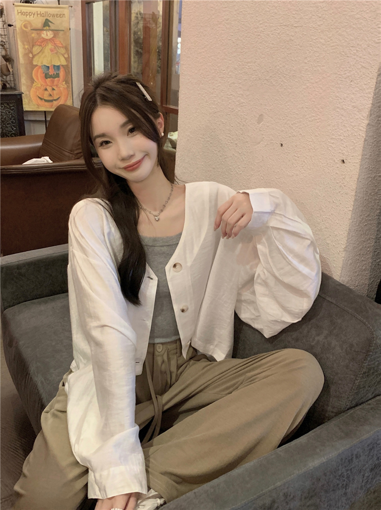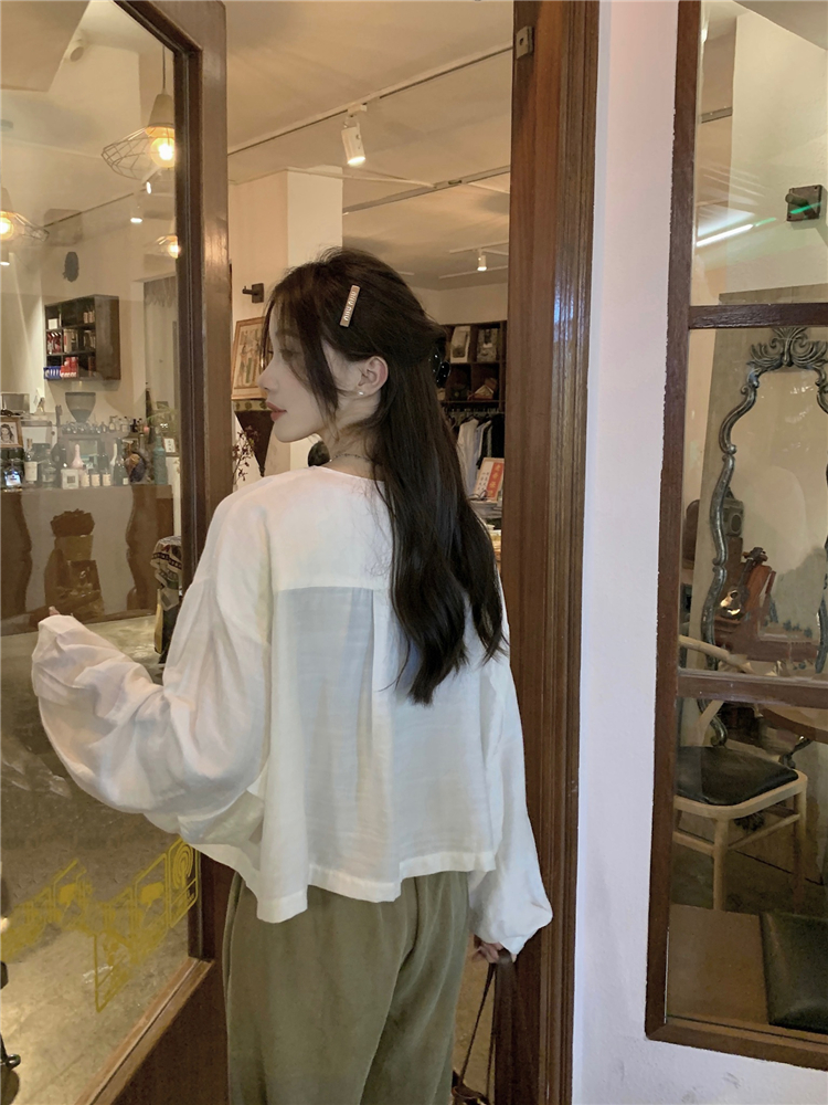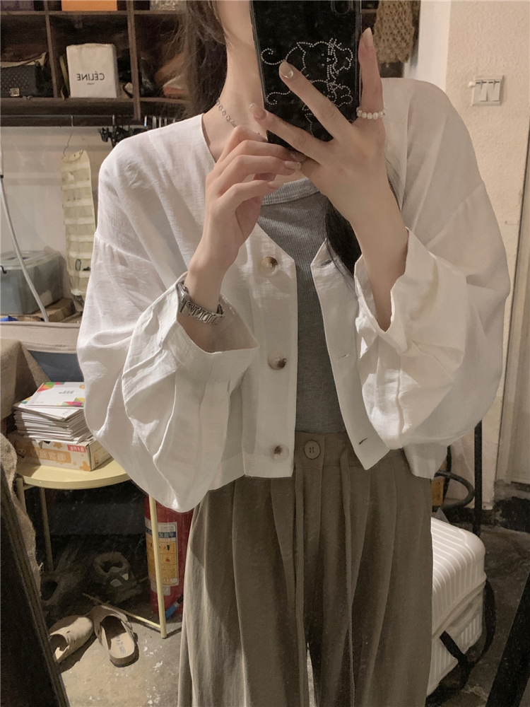 PF1629#亚麻简约宽松慵懒短款灯笼袖防晒衬衫开衫韩版小外套女