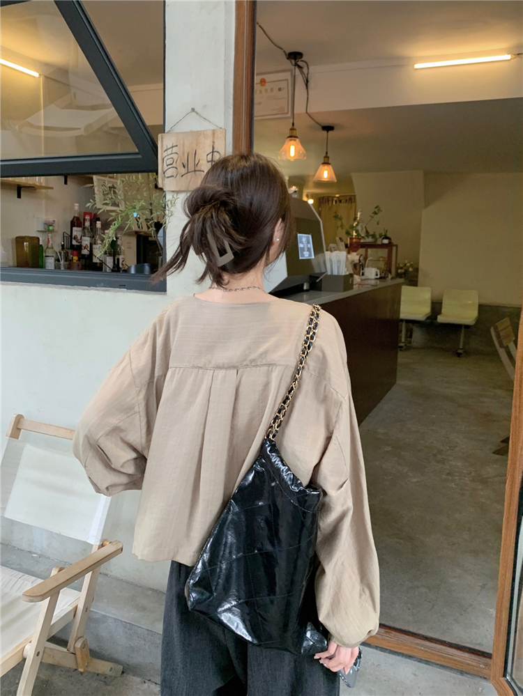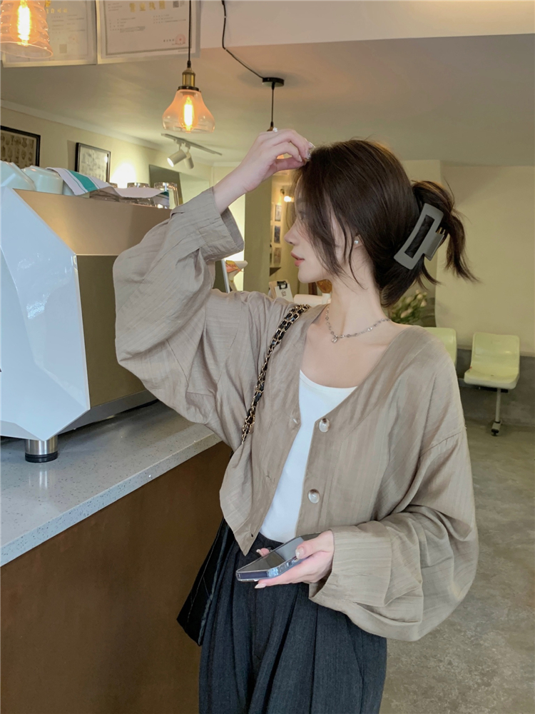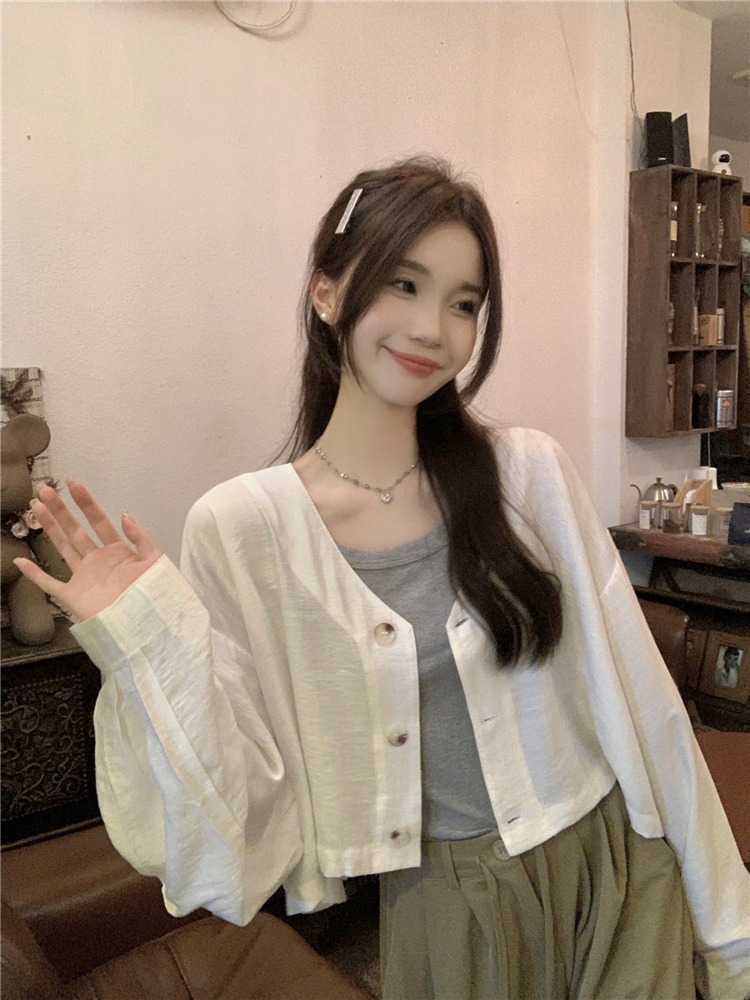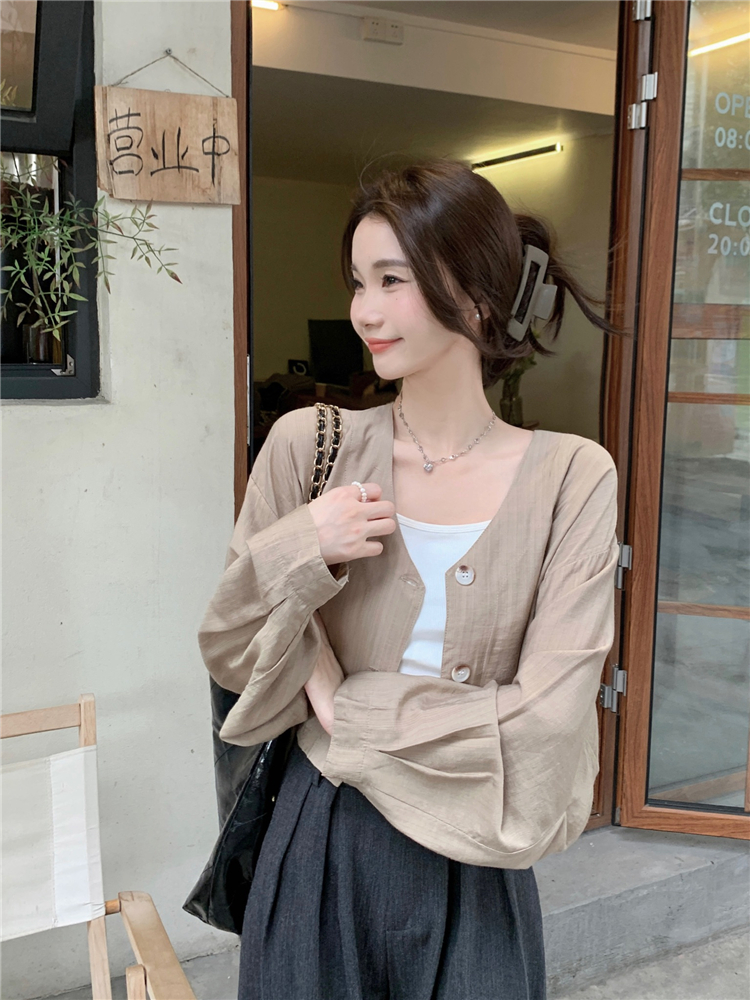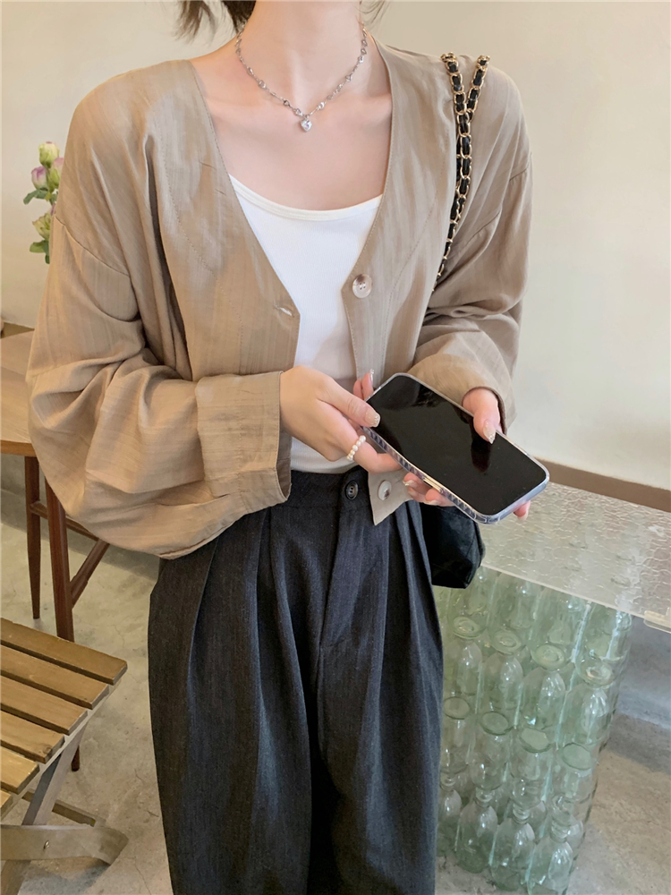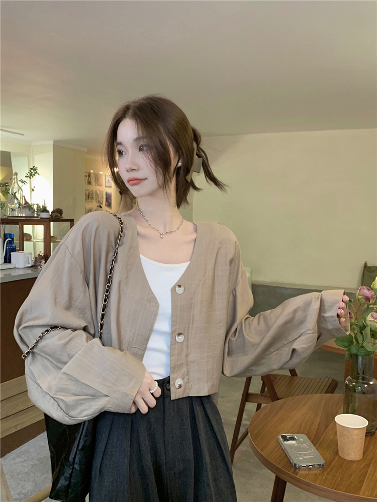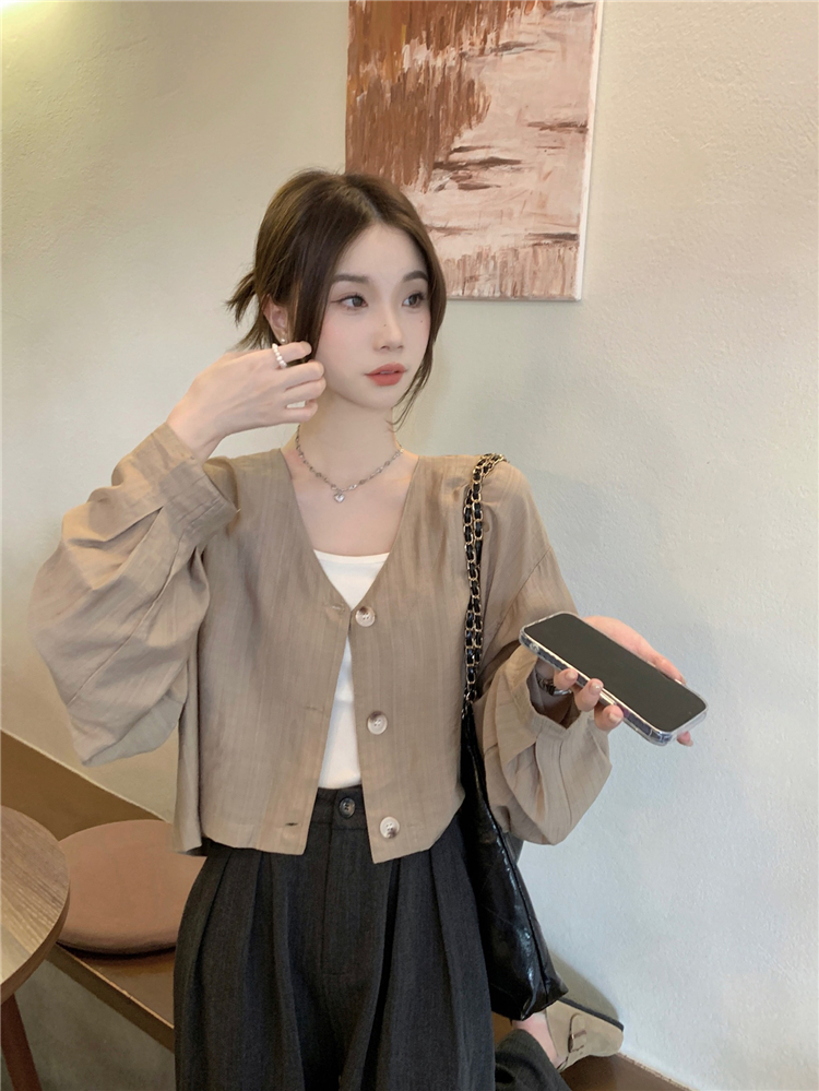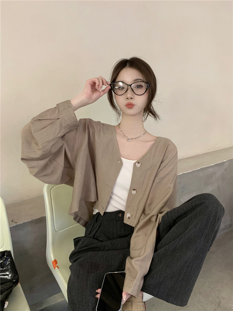 PF1629#亚麻简约宽松慵懒短款灯笼袖防晒衬衫开衫韩版小外套女