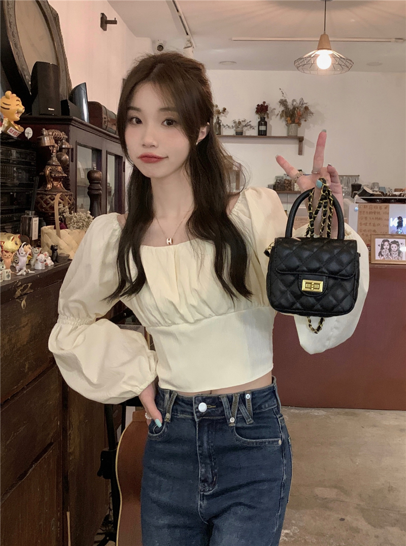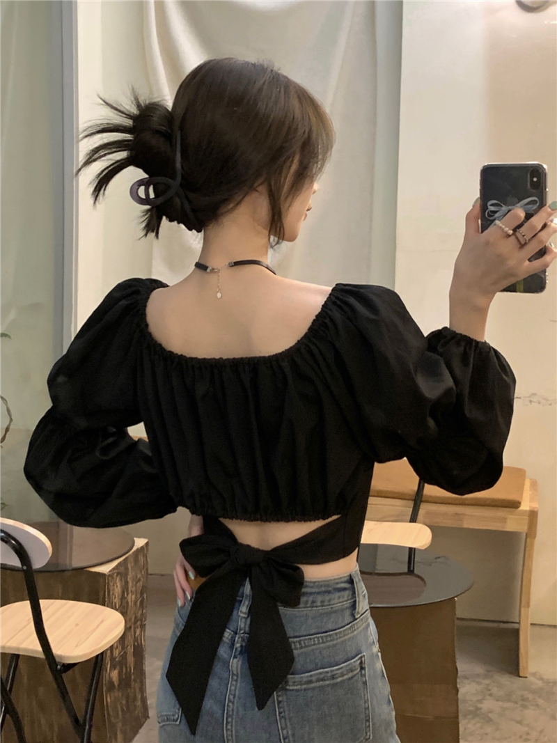 PF1630#方领露锁骨衬衫女法式泡泡袖设计感心机蝴蝶结长袖上衣