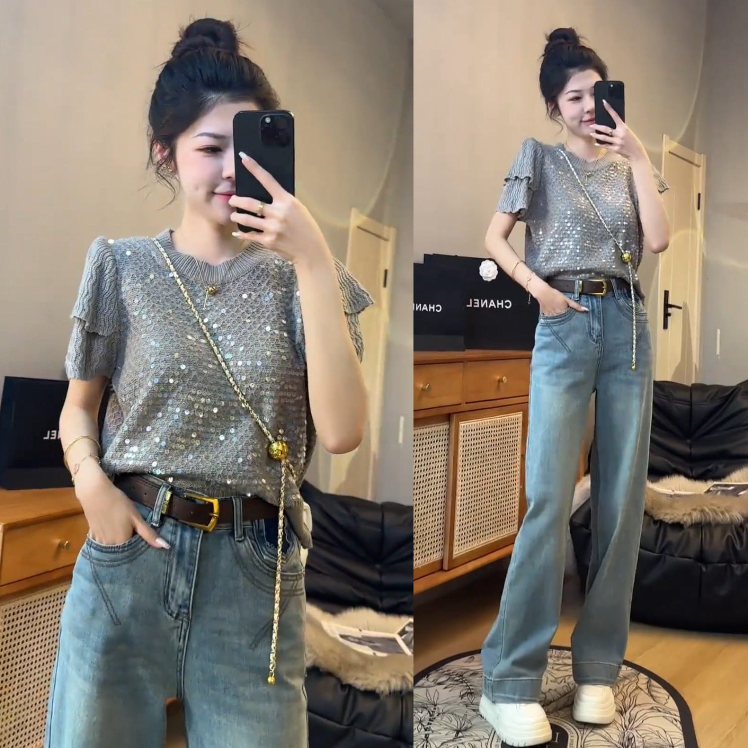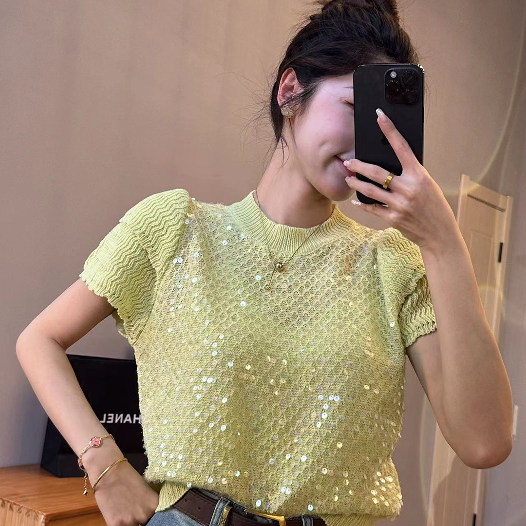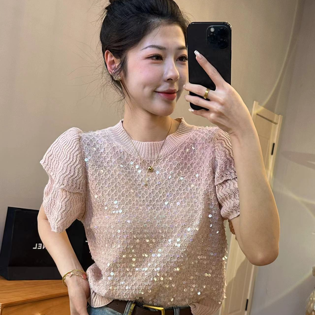 PF1641#法式重工亮片花苞袖套头圆领毛衣女 新款