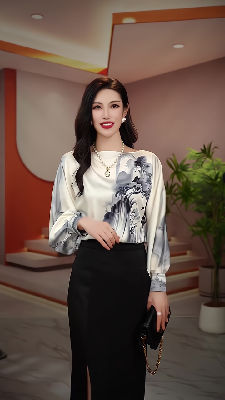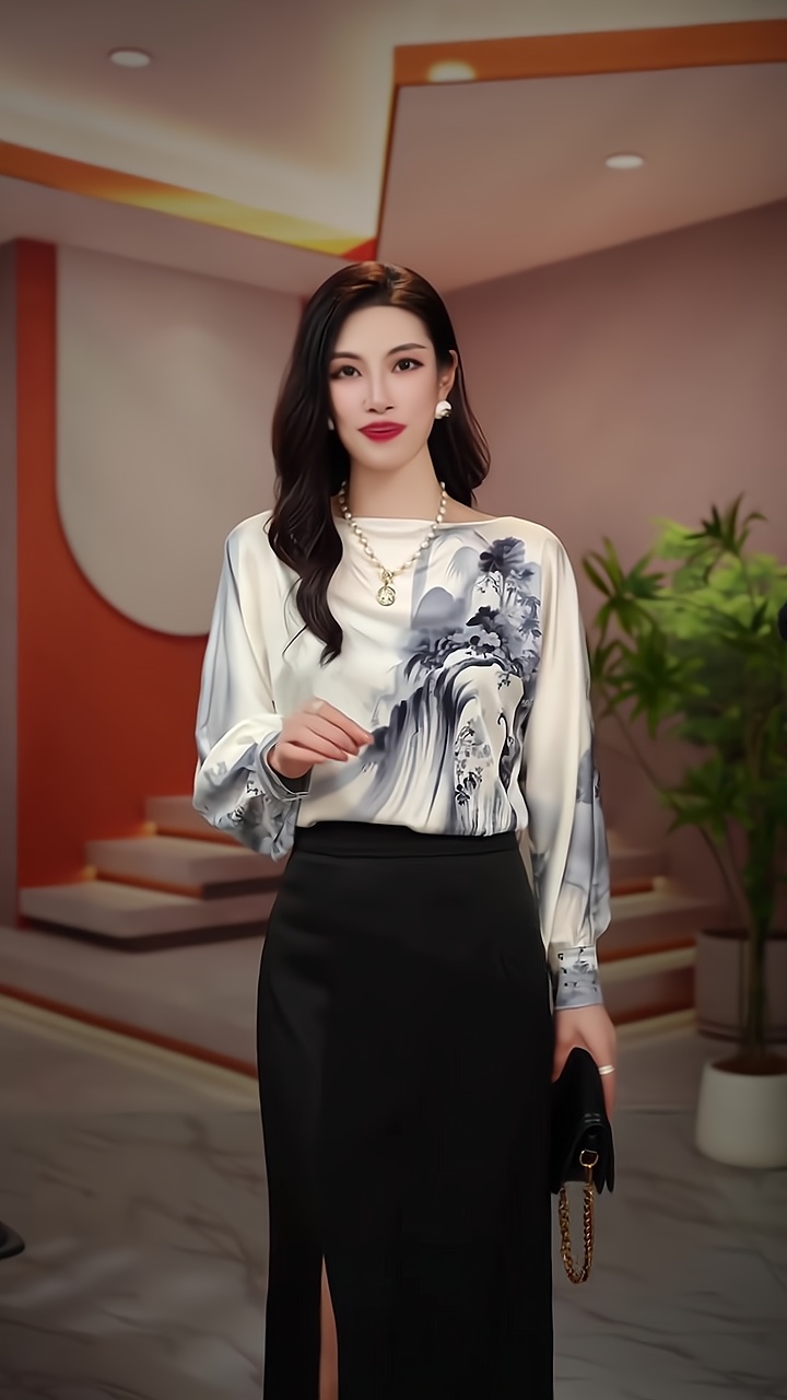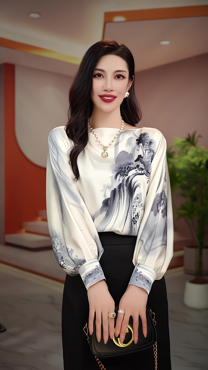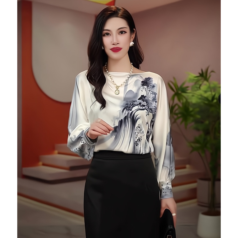 PF1651#新款显瘦优雅设计感一字领山水画衬衫
