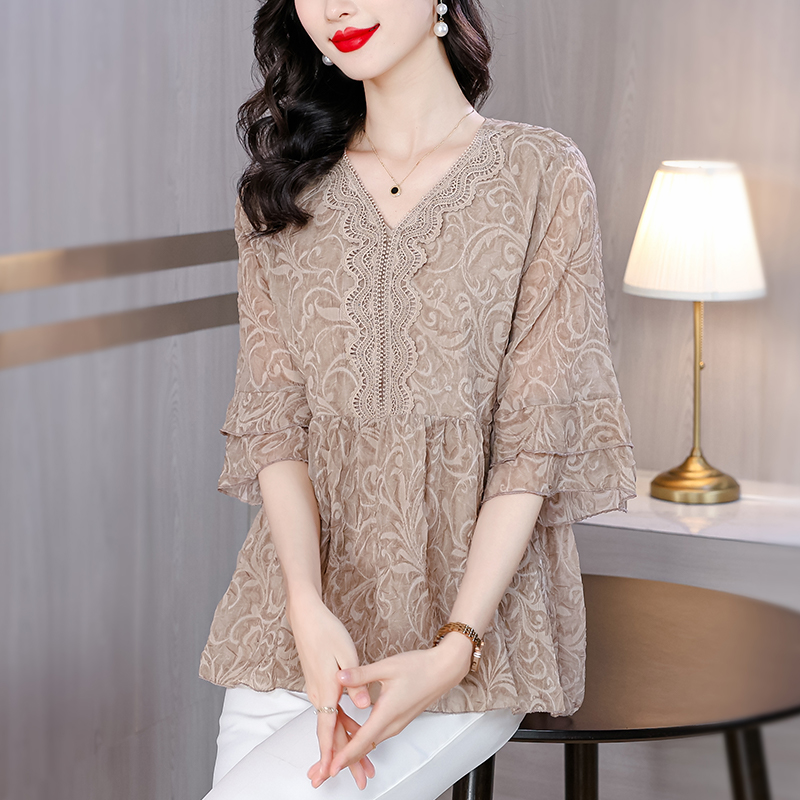 PF1657#新款洋气时髦胖妹妹遮肚显瘦百搭宽松大码印花雪纺上衣