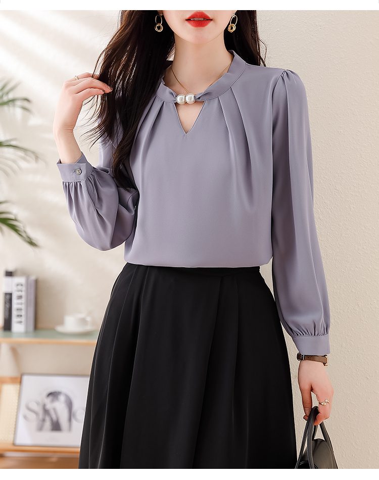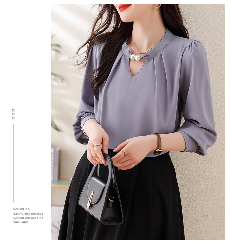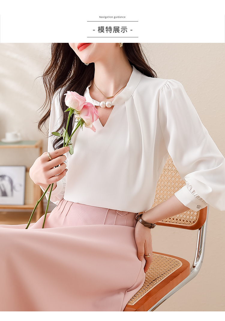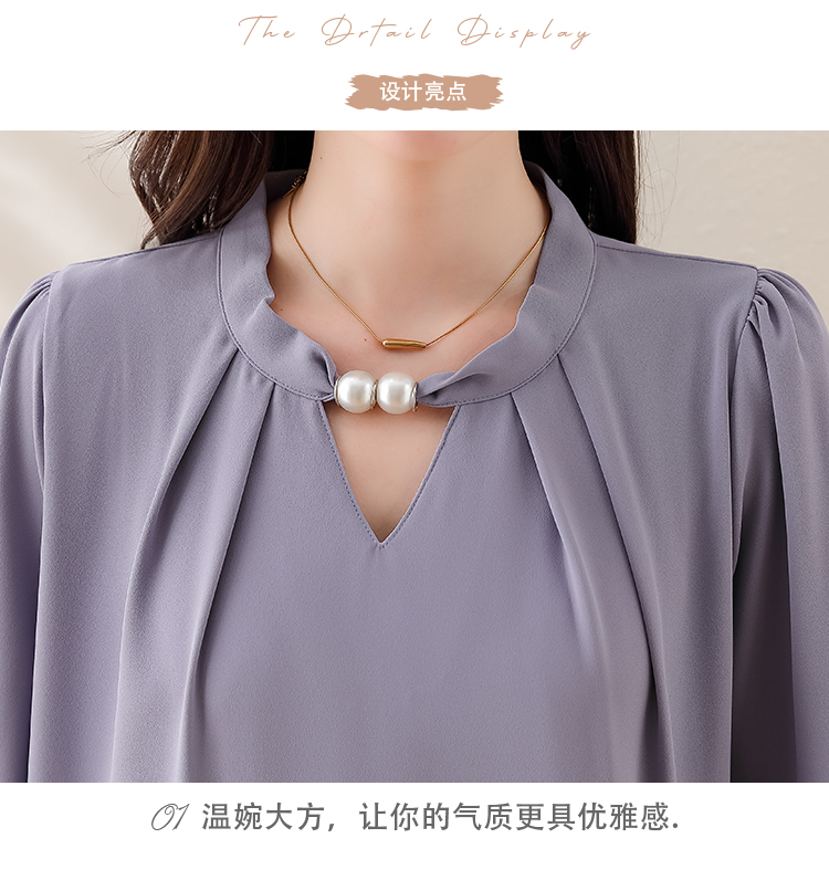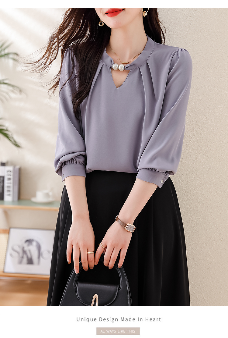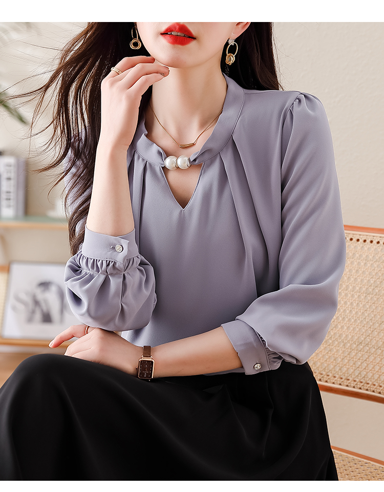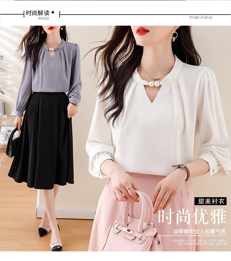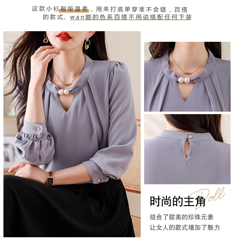 PF1694#法式小众挂脖立领串珠衬衫女 新款套头缎面气质通勤职业上衣