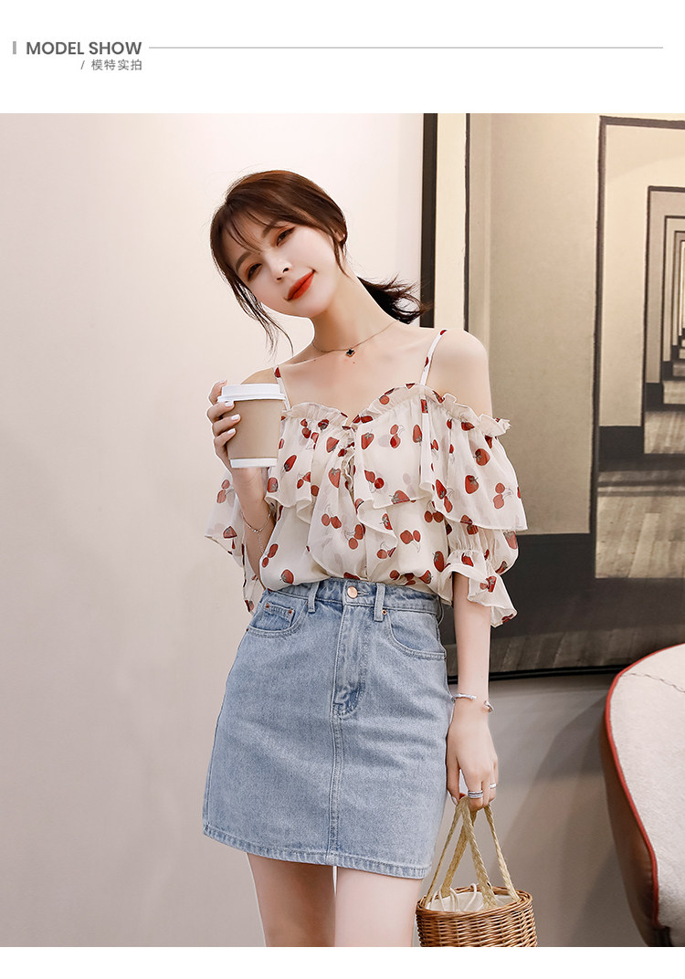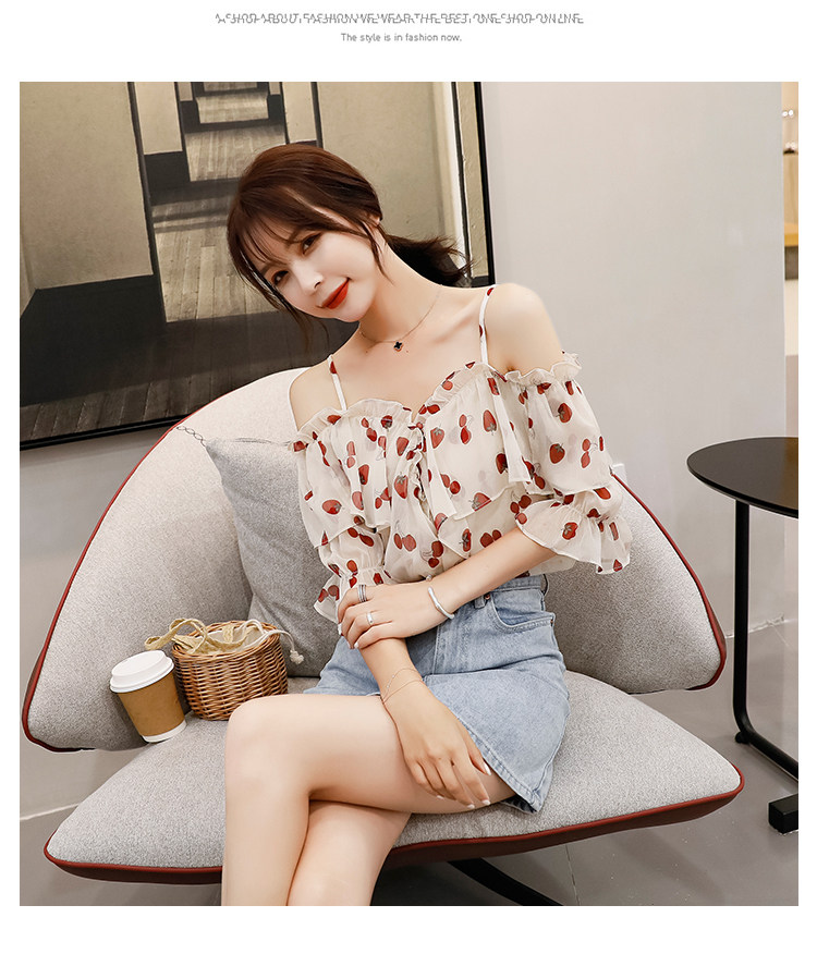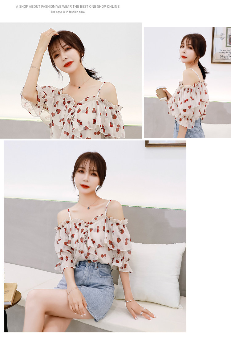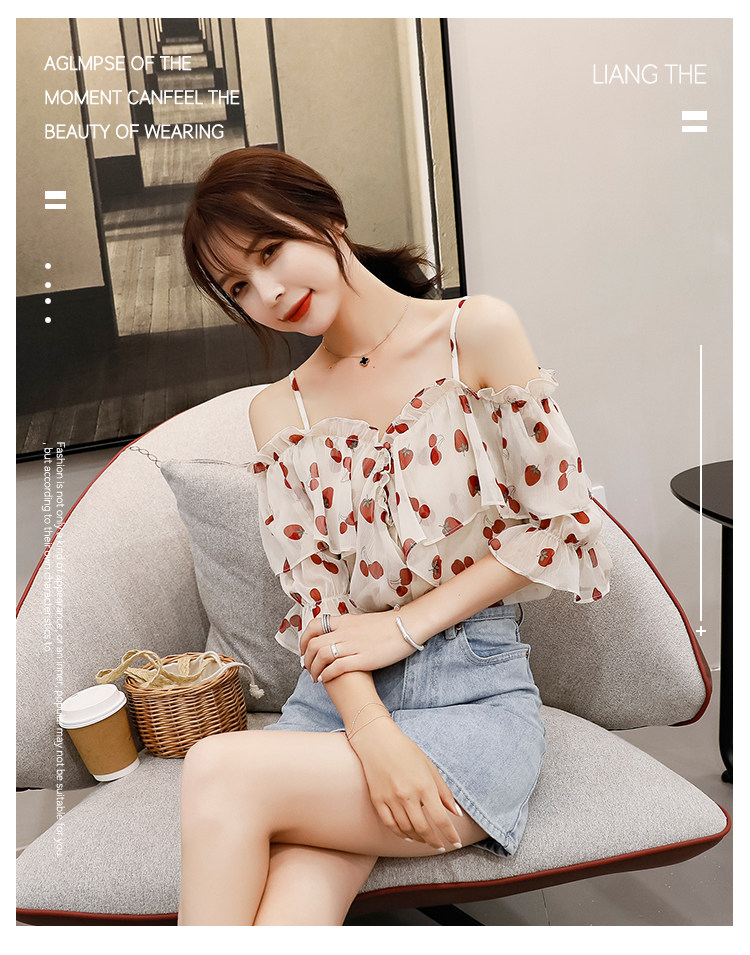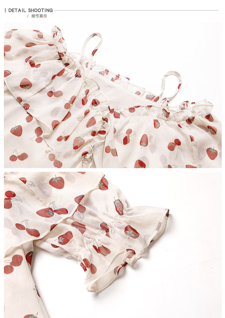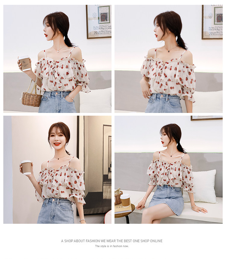 PF1699#夏季V领碎花遮肚子雪纺衫女短袖洋气吊带露肩上衣小衫
