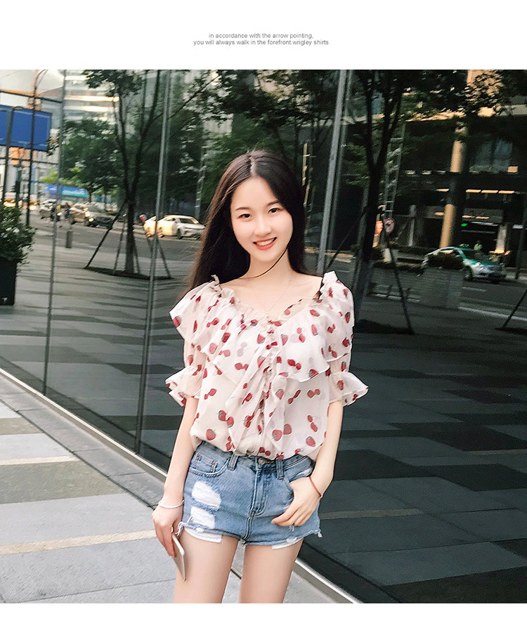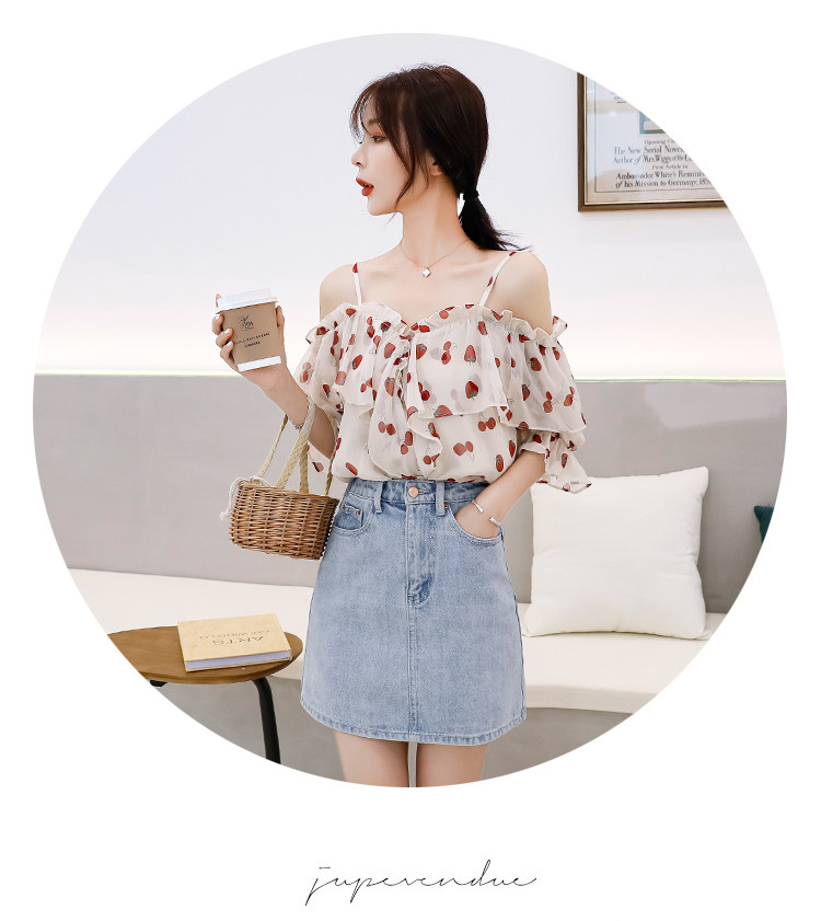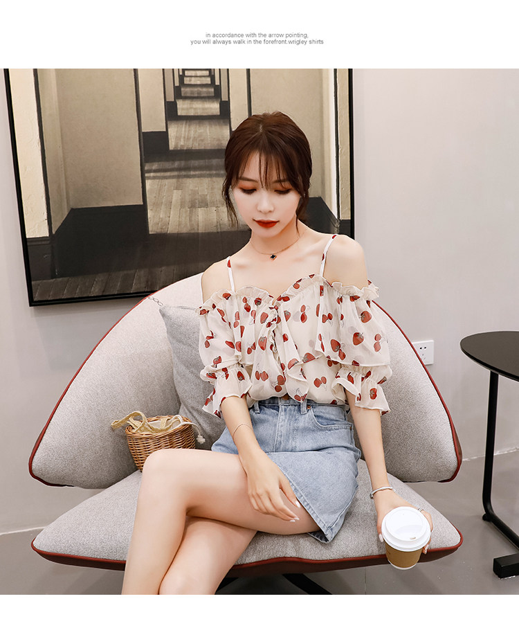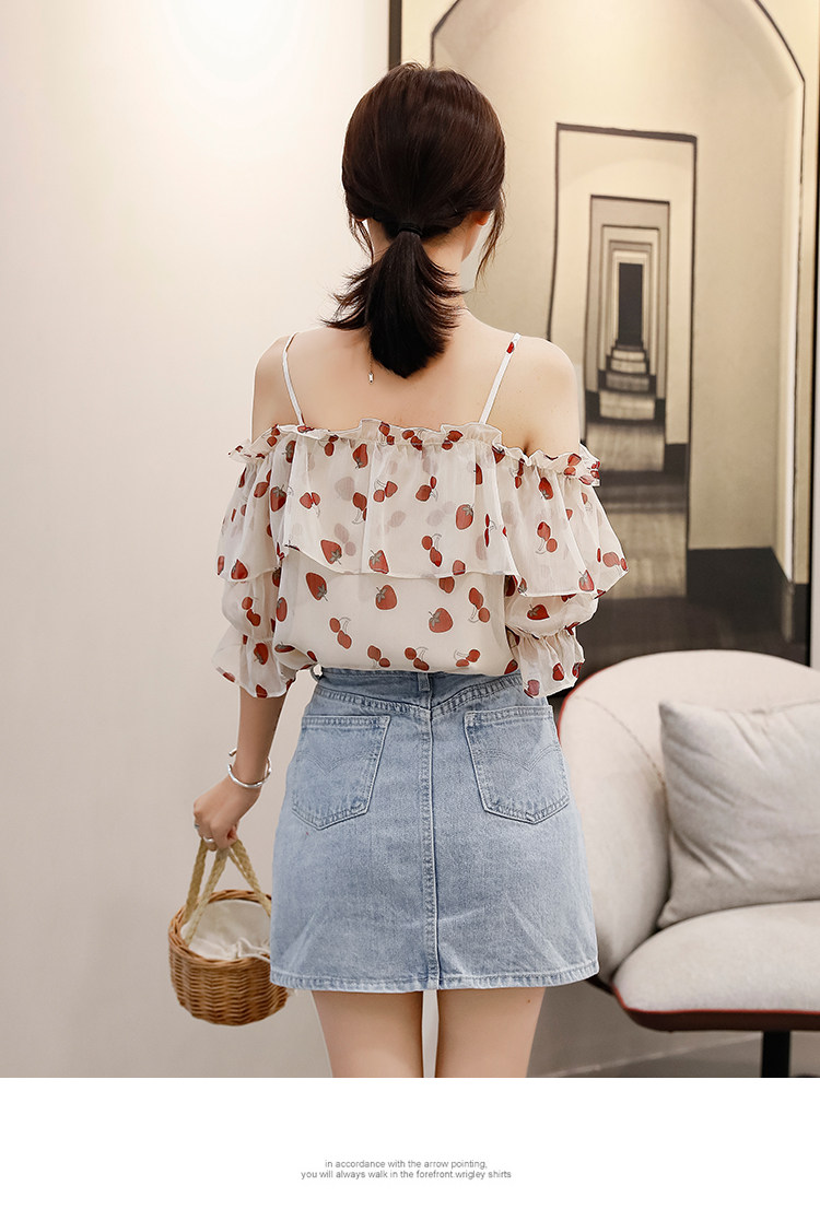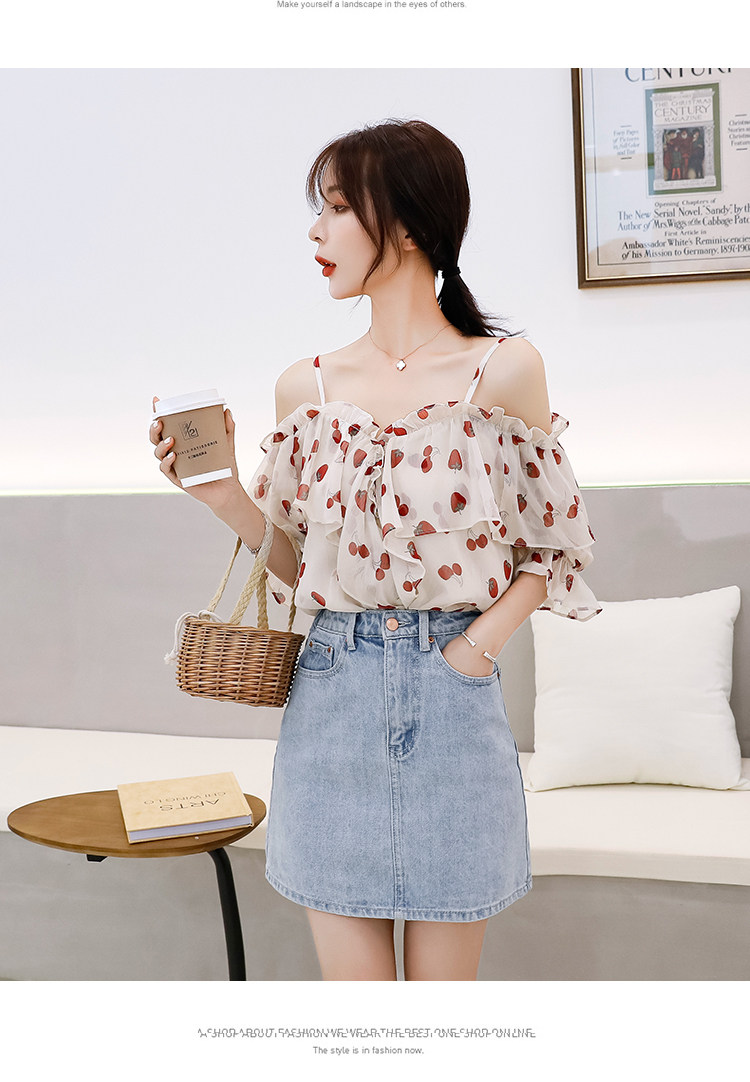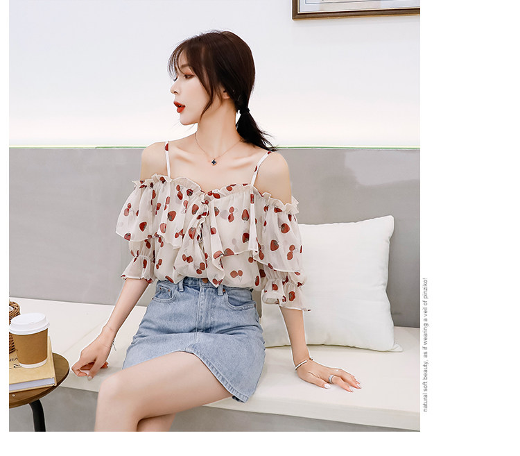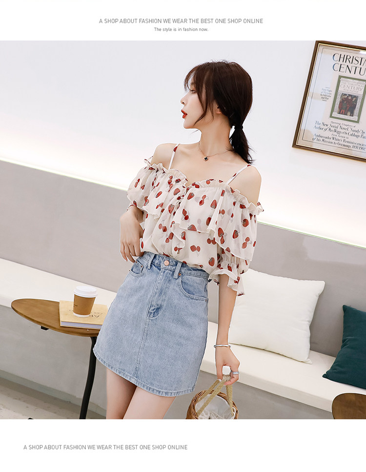 PF1699#夏季V领碎花遮肚子雪纺衫女短袖洋气吊带露肩上衣小衫