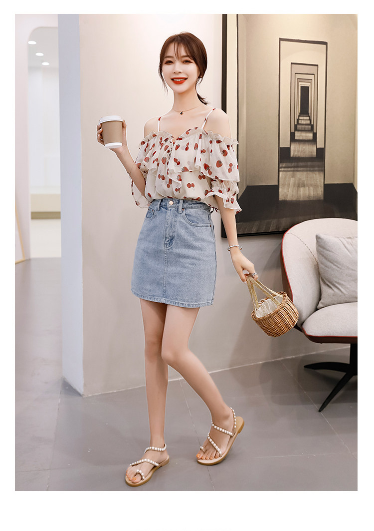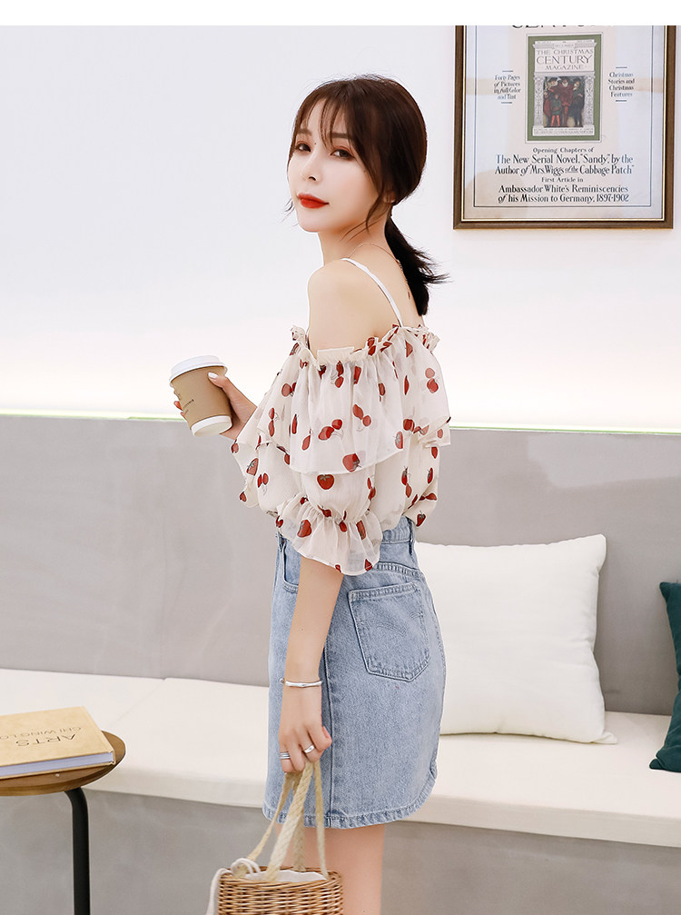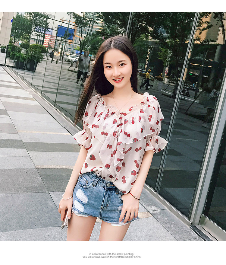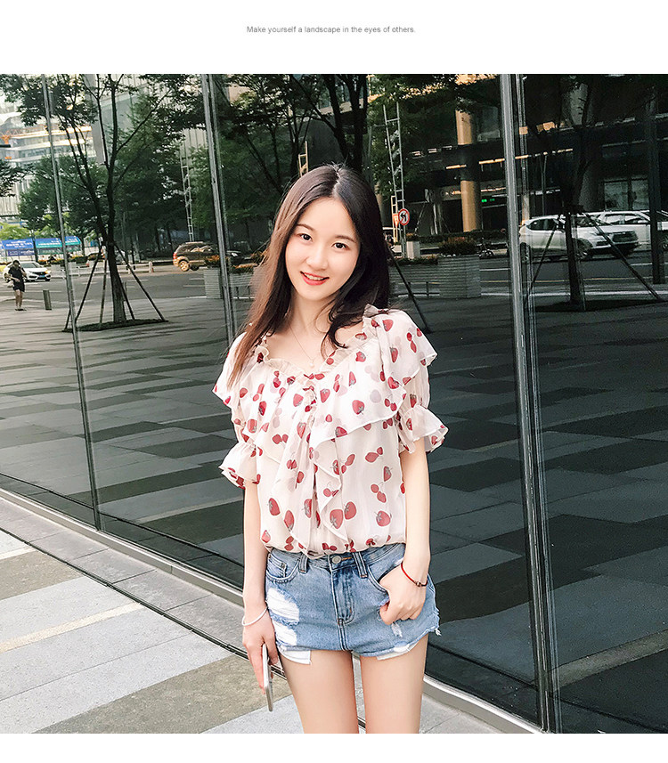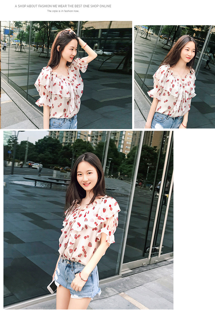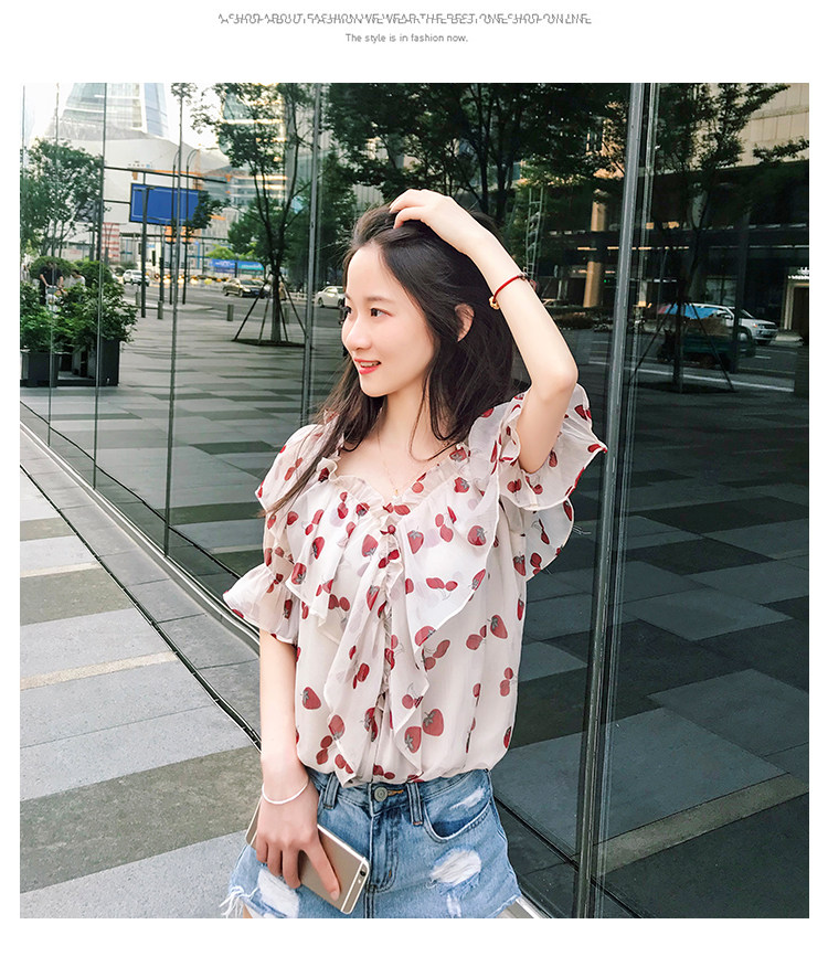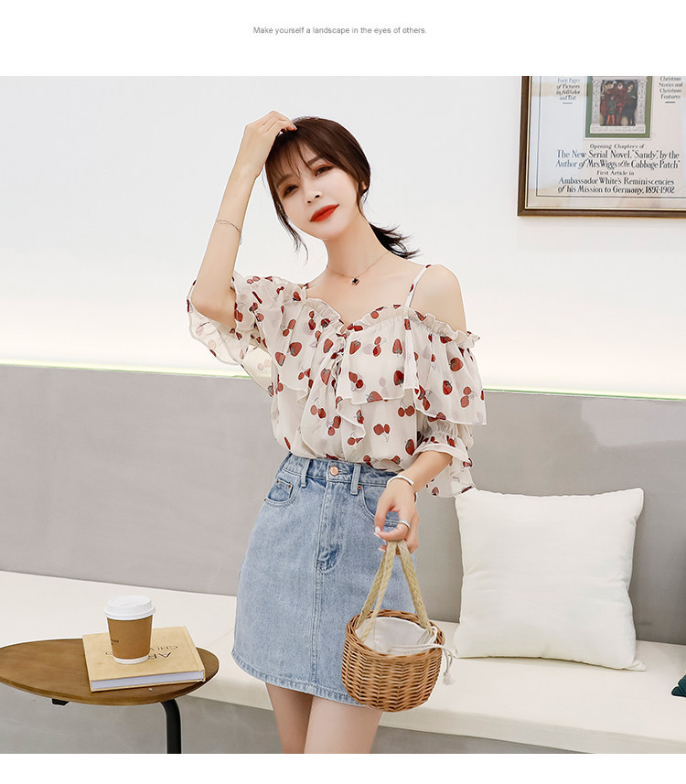 PF1699#夏季V领碎花遮肚子雪纺衫女短袖洋气吊带露肩上衣小衫