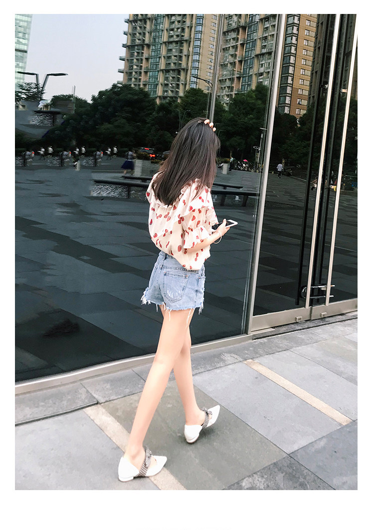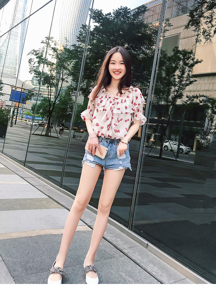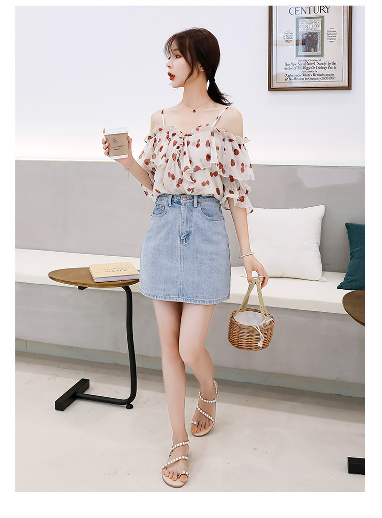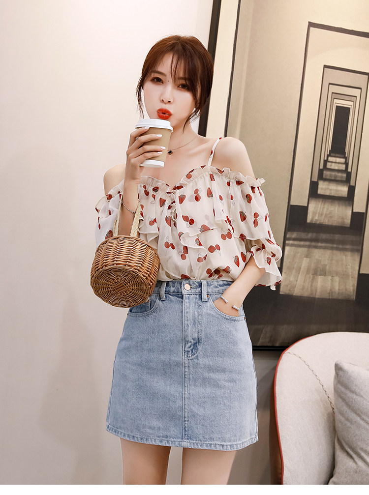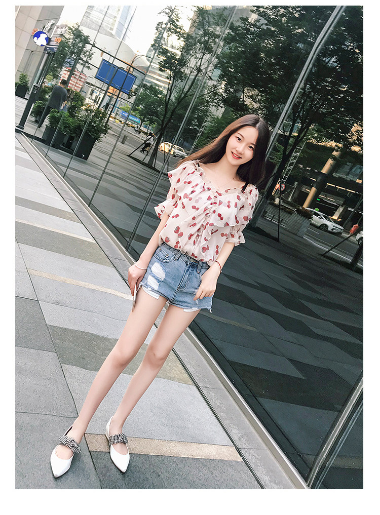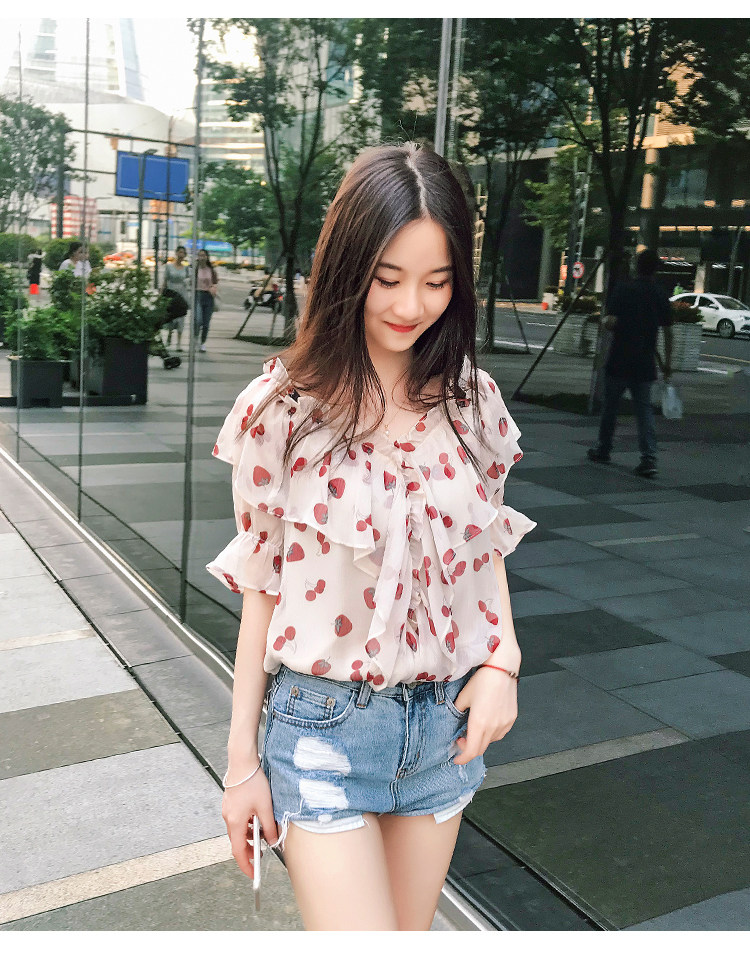 PF1699#夏季V领碎花遮肚子雪纺衫女短袖洋气吊带露肩上衣小衫