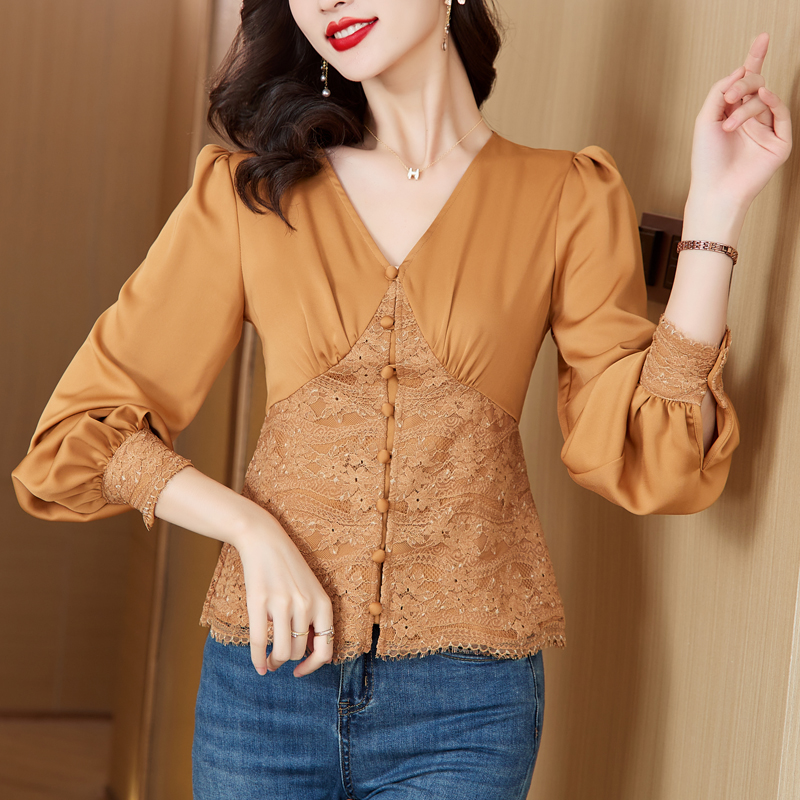 PF1723#法式复古真丝衬衫 新品设计感V领蕾丝刺绣显瘦上衣