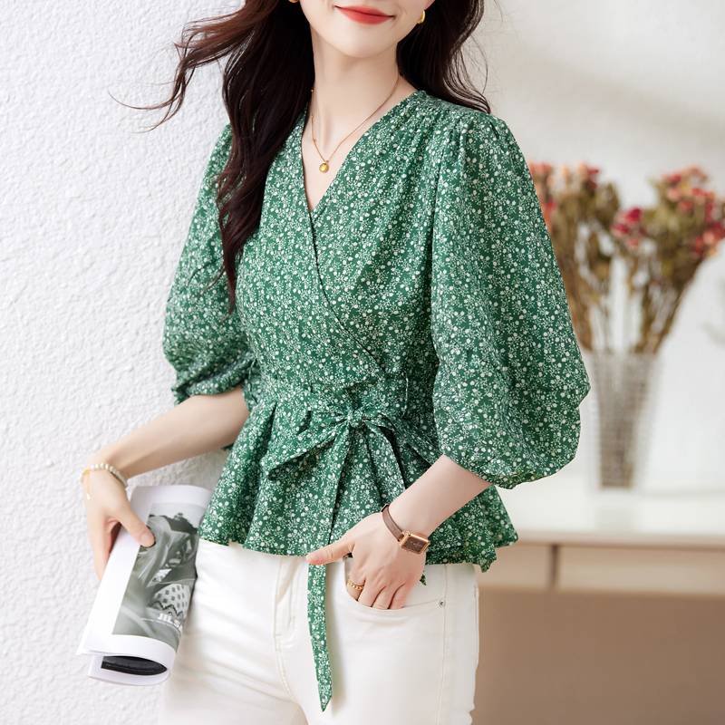 PF1725#复古高级绿色v领碎花衬衫女夏独特短款上衣卡腰洋气小衫