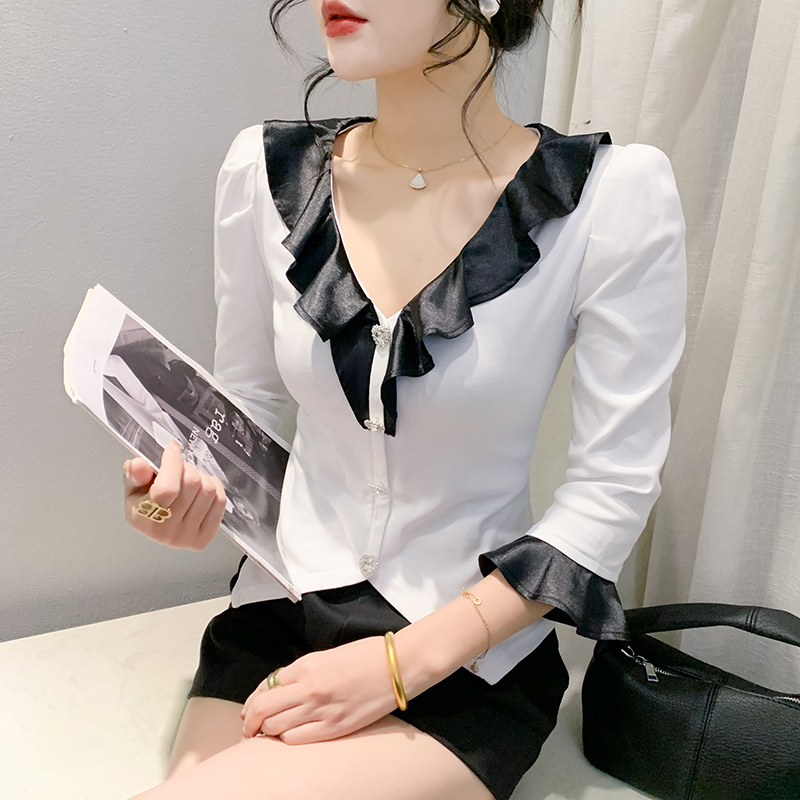 PF1741#新款原创设计V领花边钉珠钻扣经典配色小香风别致时尚小衫