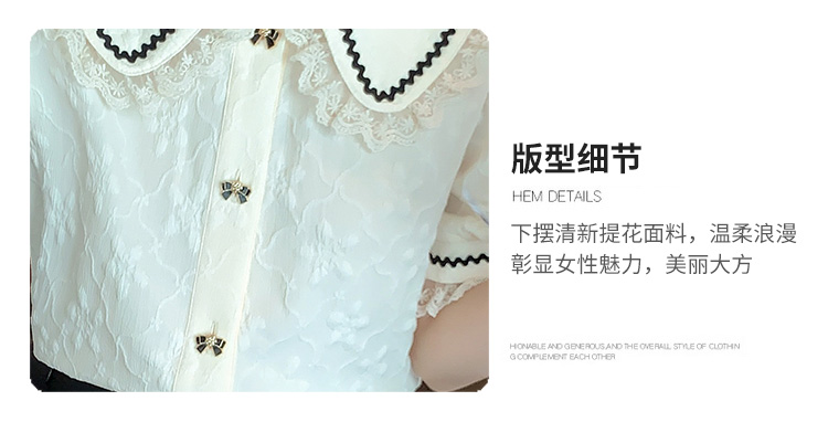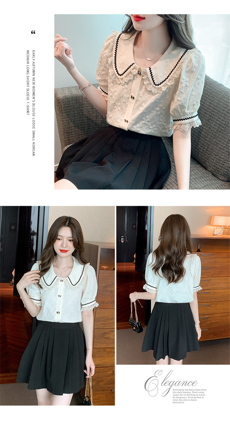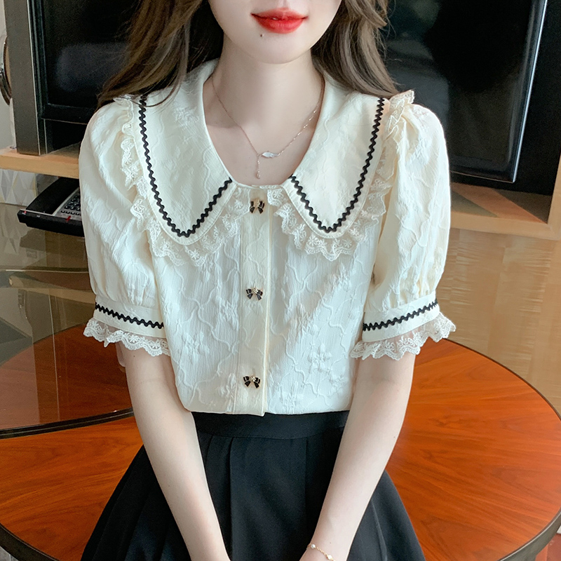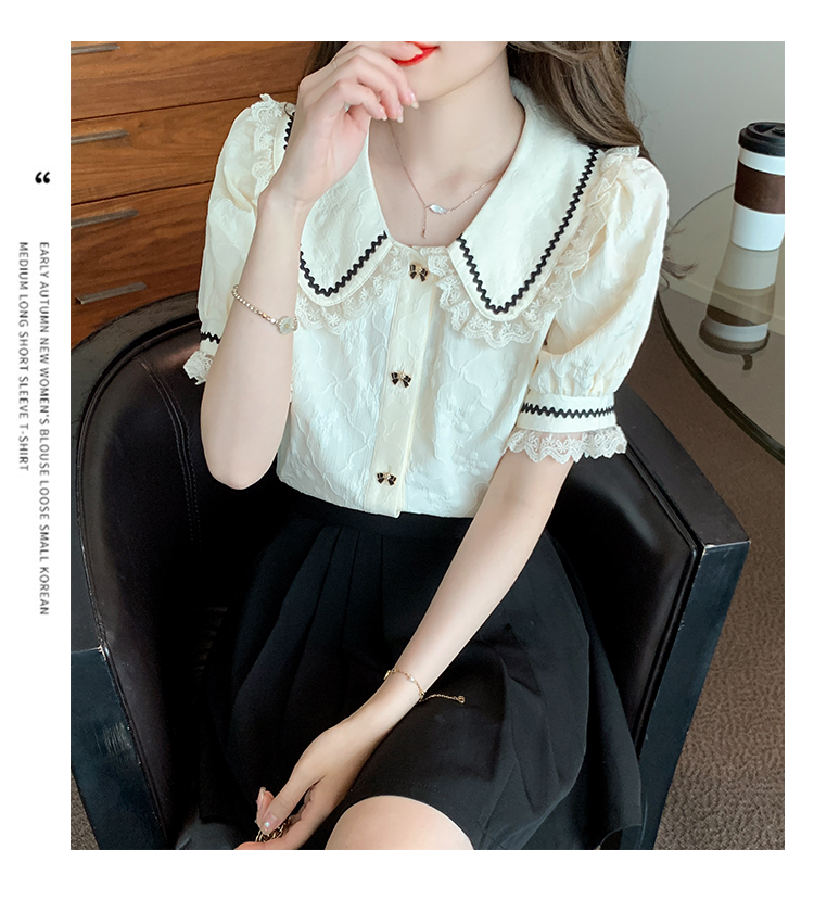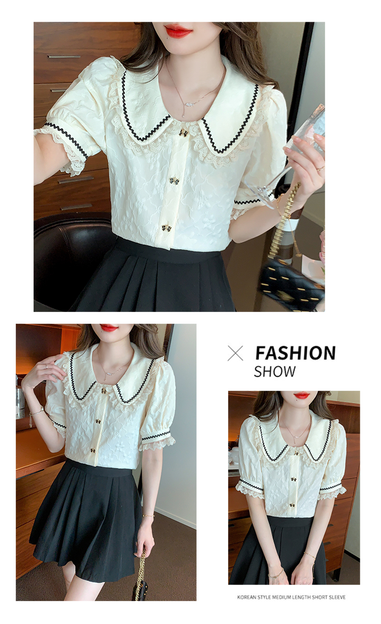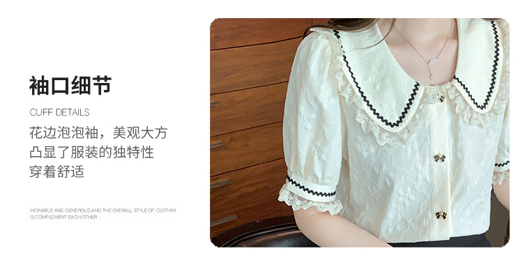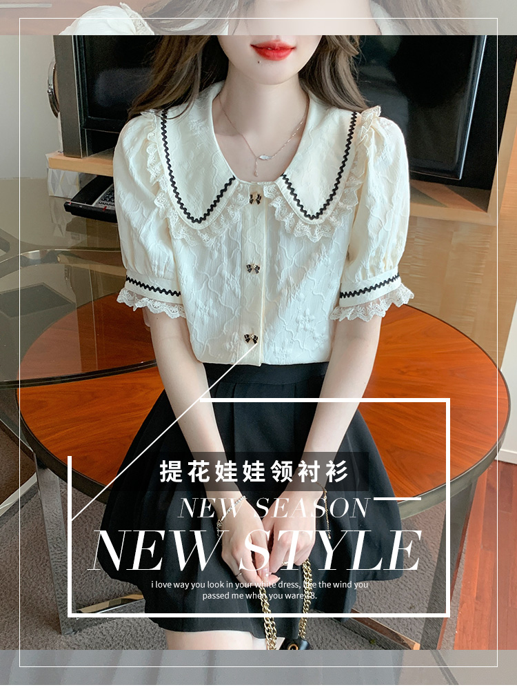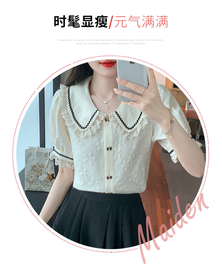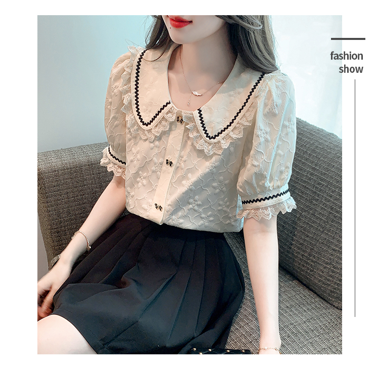 PF1773#娃娃领短袖雪纺衬衫女 新款减龄时尚洋气别致蕾丝小衫
