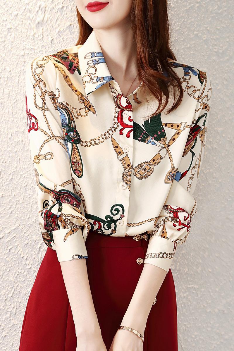 PF1833#链条印花衬衣 雪纺上衣女基本型轻奢女式衬衫