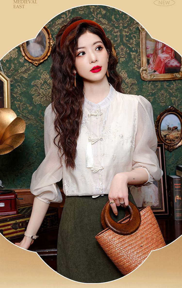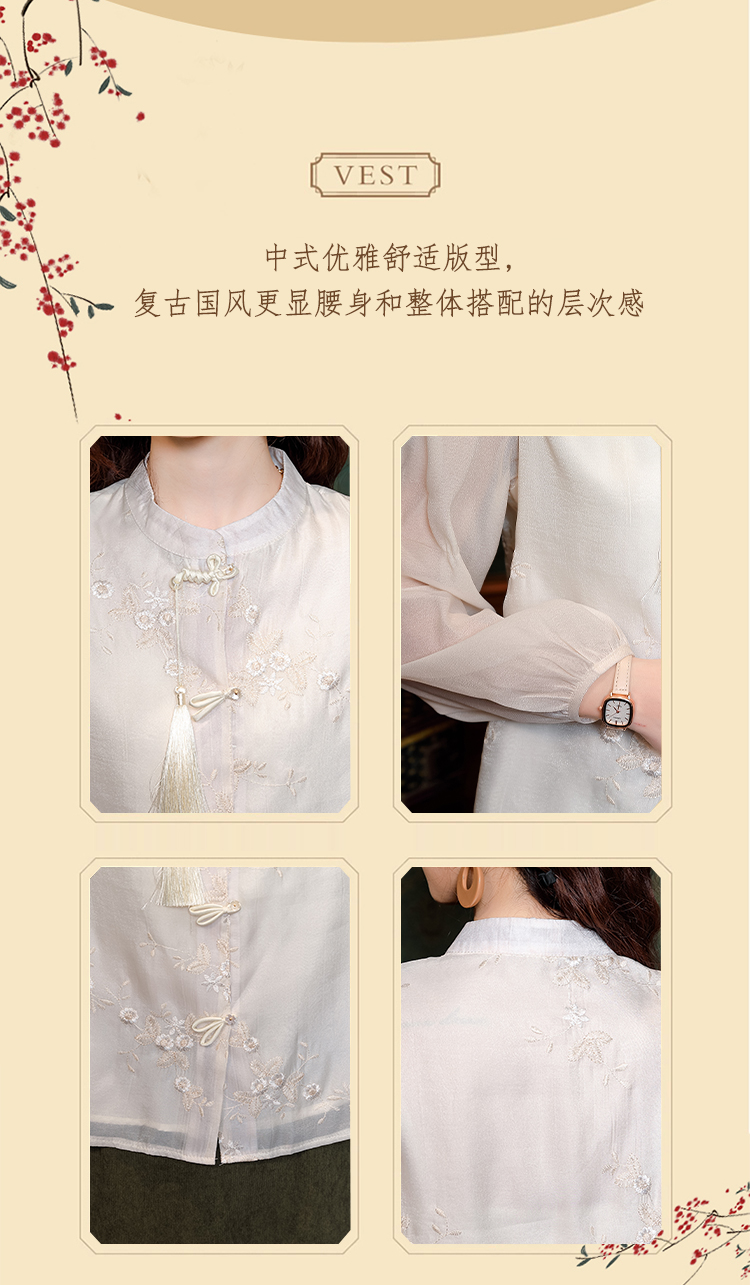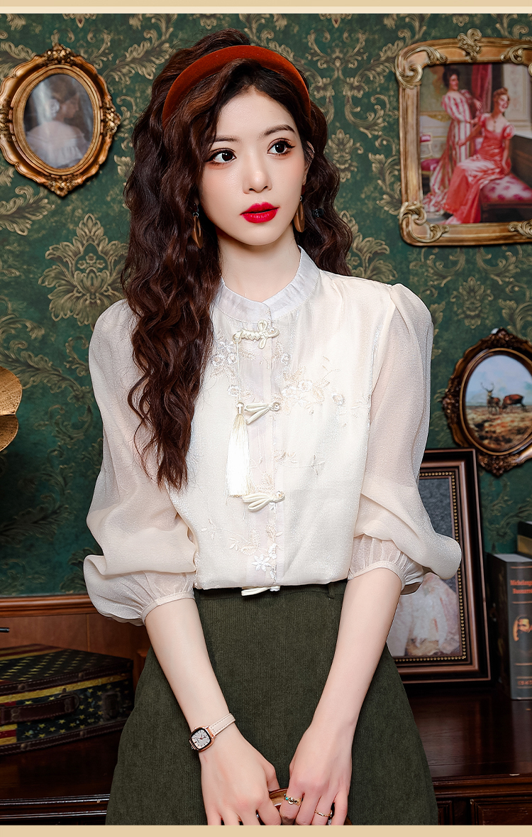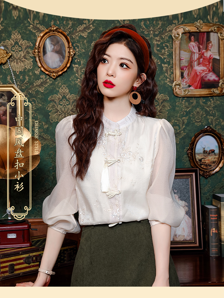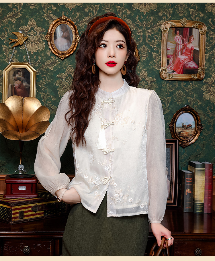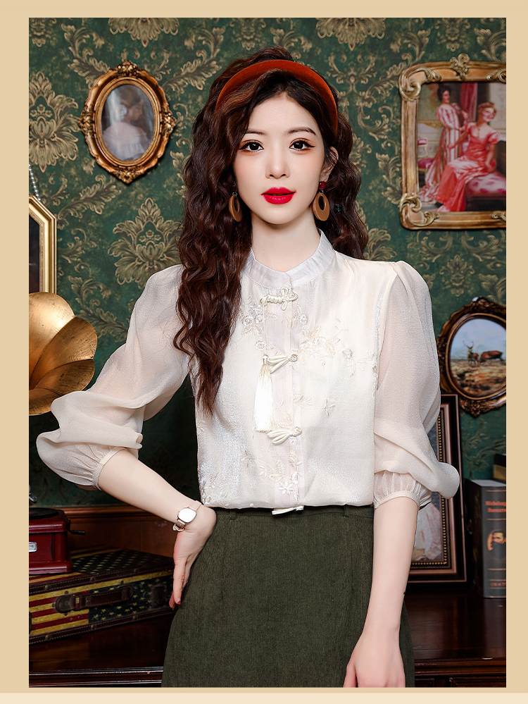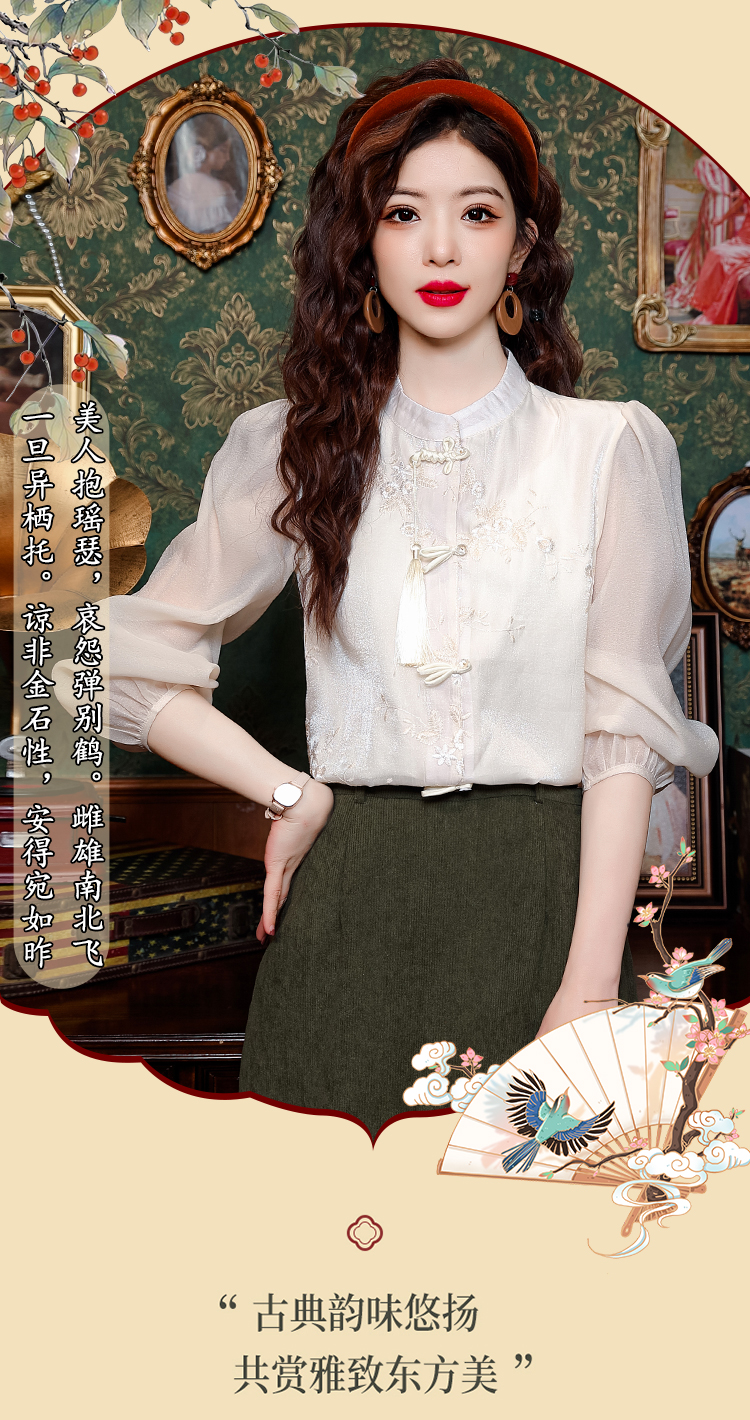 PF1861#中国风刺绣网纱拼接衬衫女春季新中式复古盘扣立领气质马面裙上衣