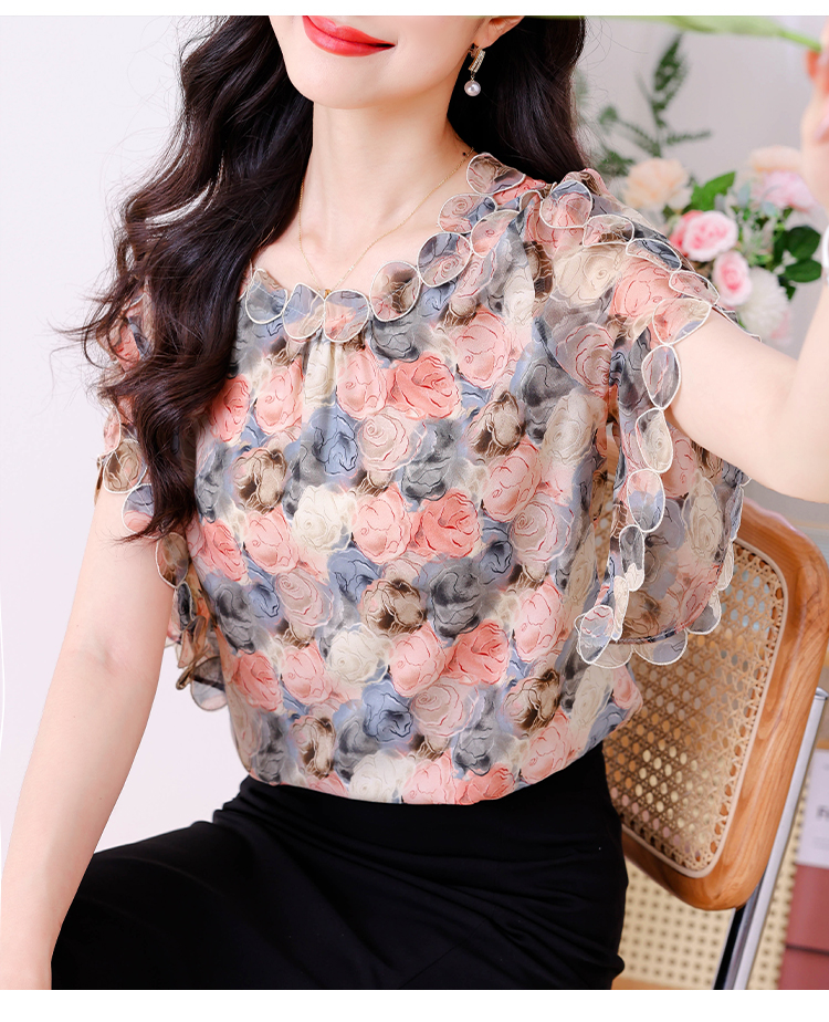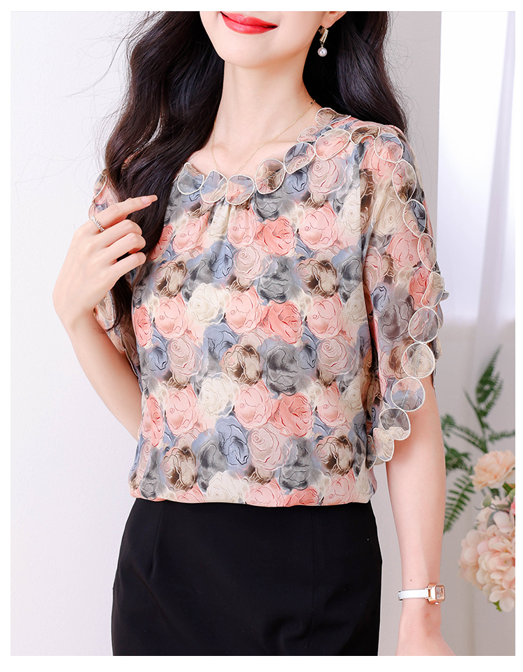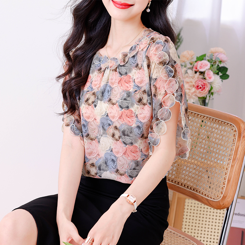 PF1873#夏季圆领时尚气质显瘦刺绣洋气圆领短袖上衣女