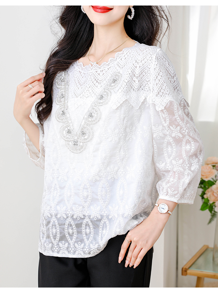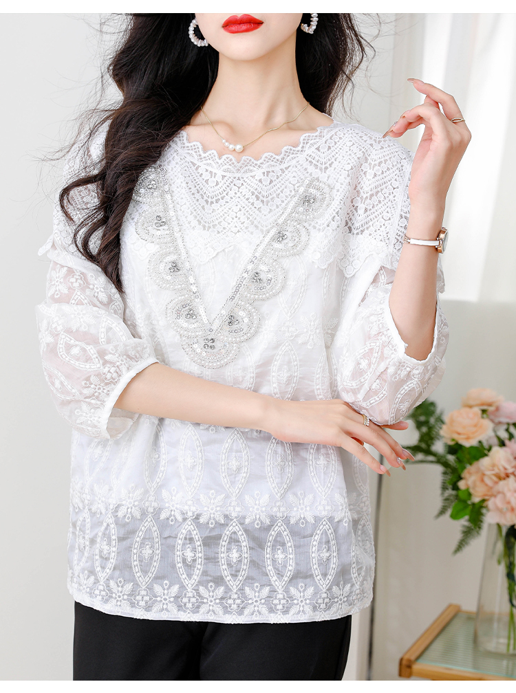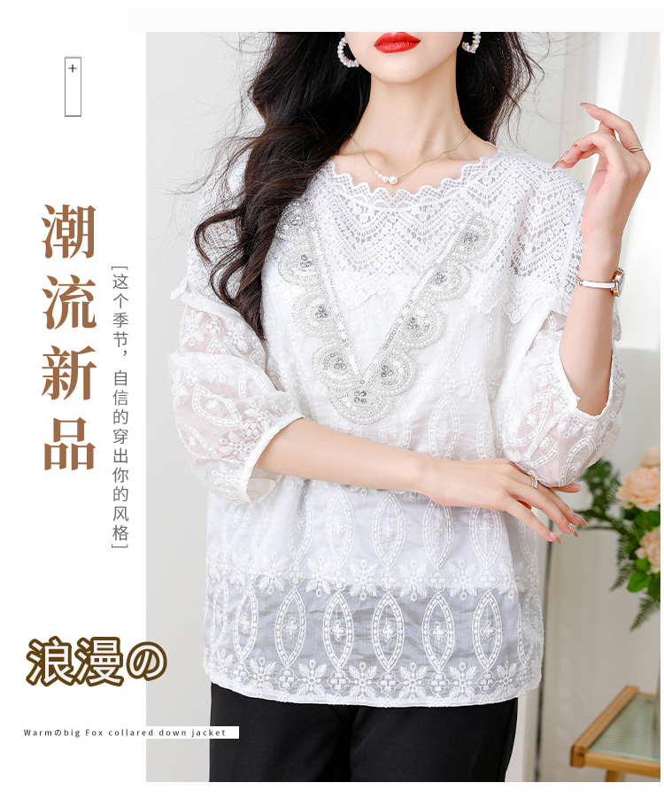 PF1881#法式甜美重工宽松镶钻刺绣镂空小众米杏色衬衫