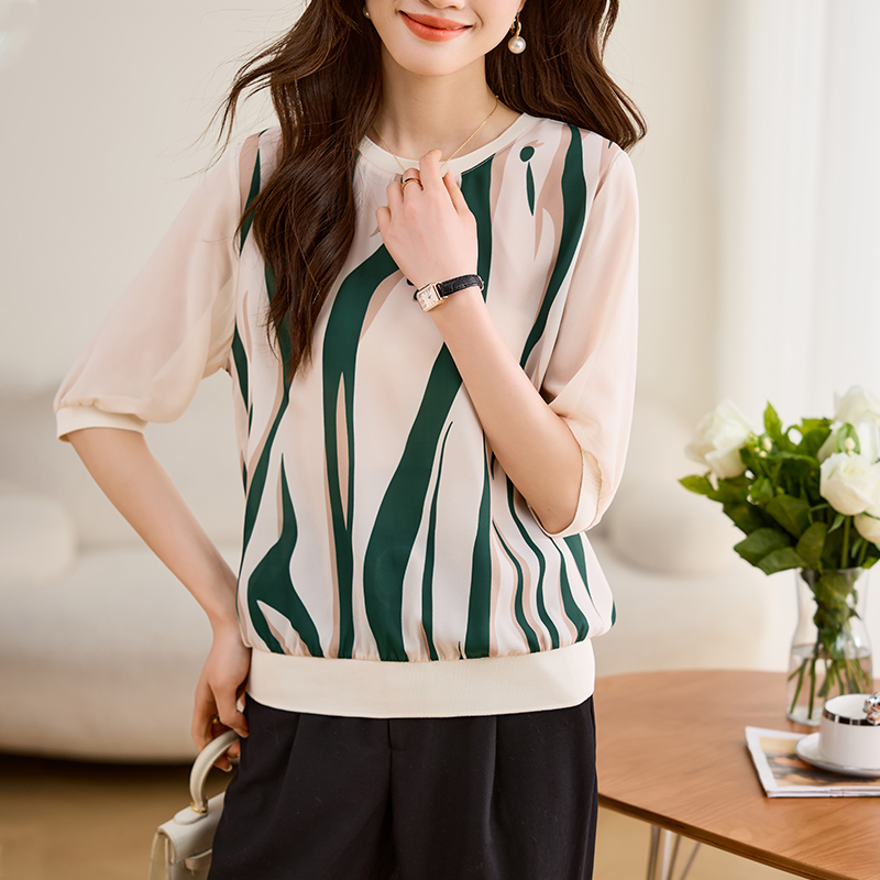 PF1889#圆领上衣女短袖 新款显瘦高端乱麻印花气质五分袖T恤