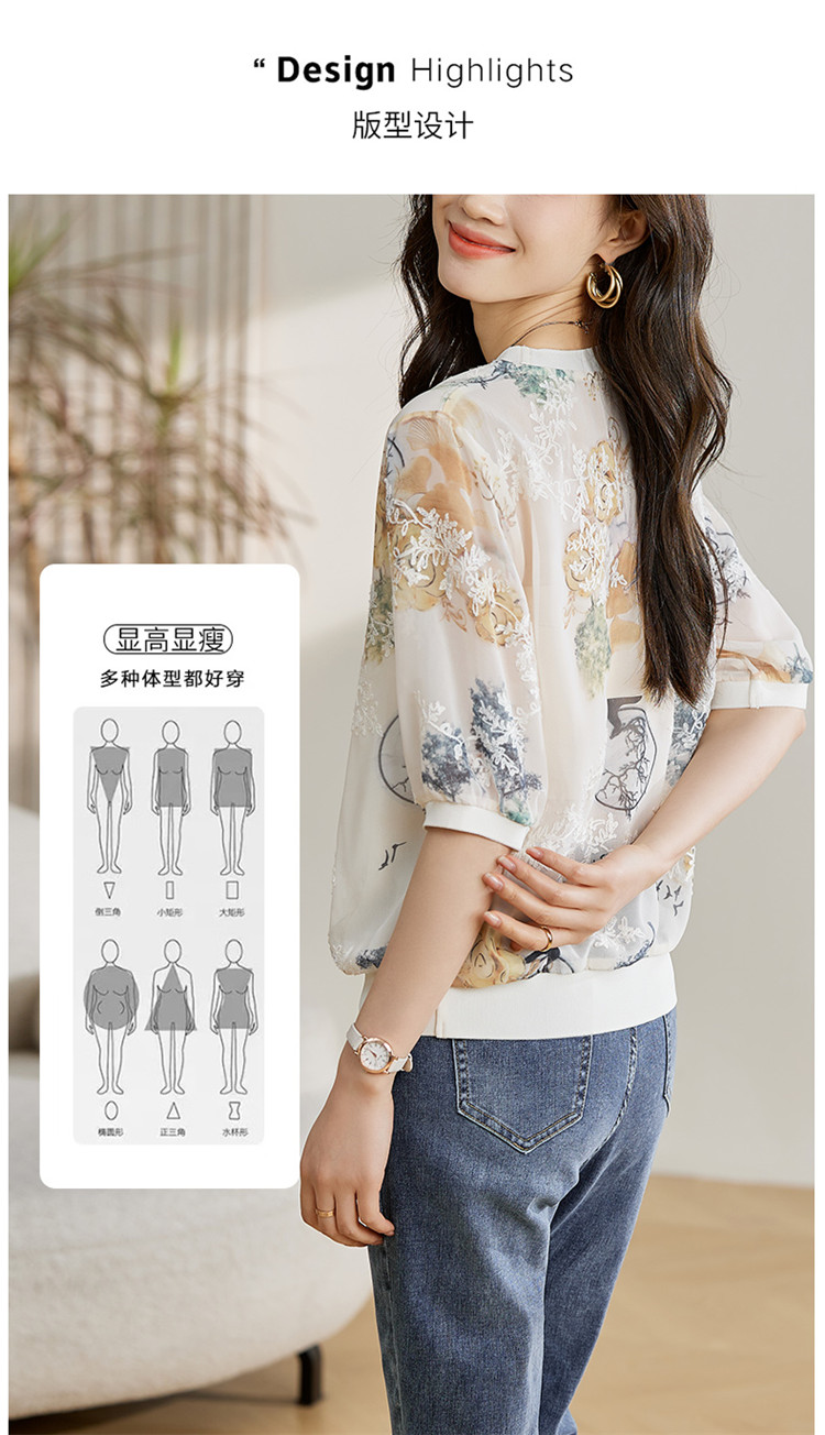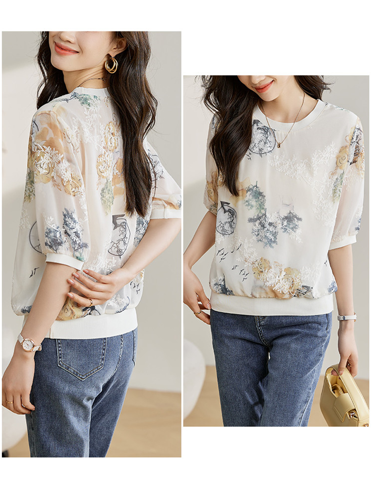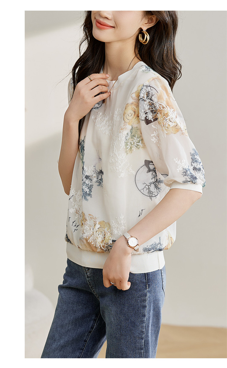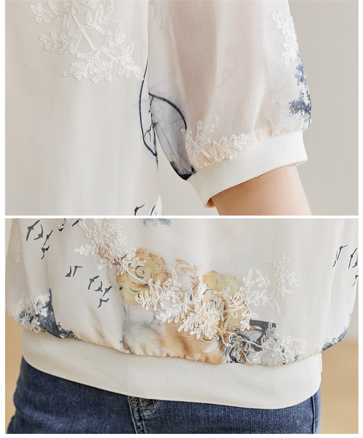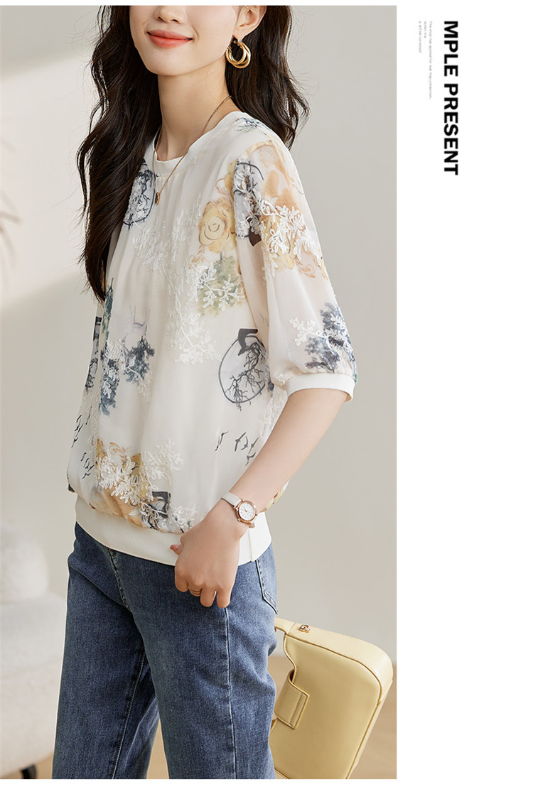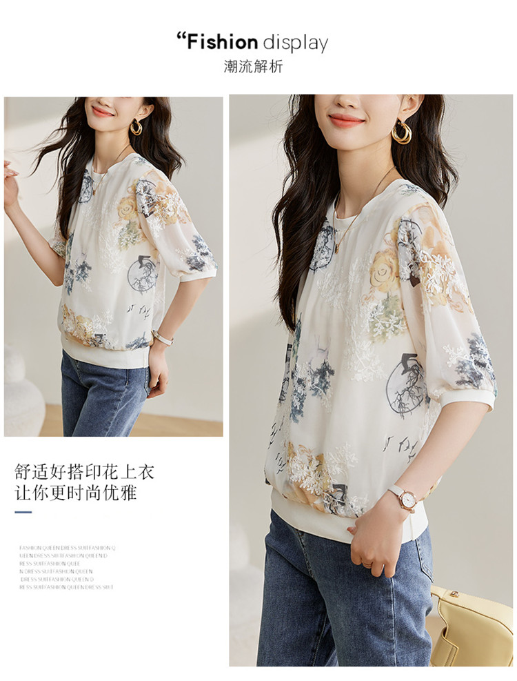 PF1890#高端珍珠雪纺 数码刺绣宽松时尚洋气五分套头中袖T恤上衣