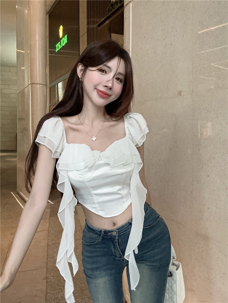 PF1904#純欲一字肩缎面拼接衬衫女短款修身露肩小众别致上衣
