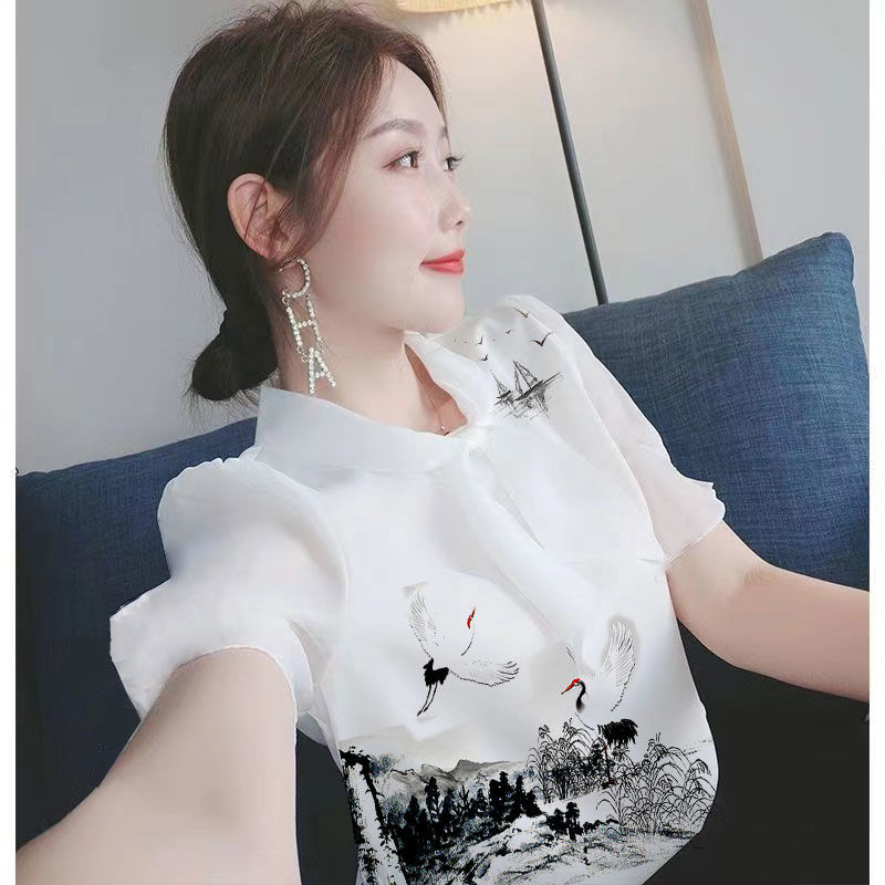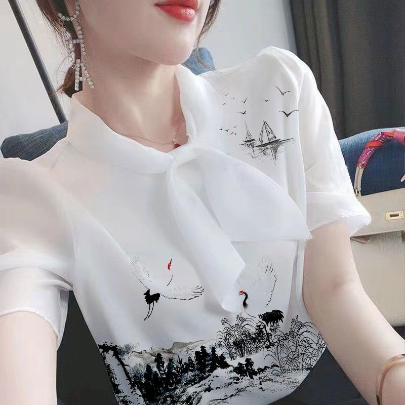 PF1915#夏季新款印花女上衣时尚气质收腰减龄小衫女洋气显瘦短袖T恤