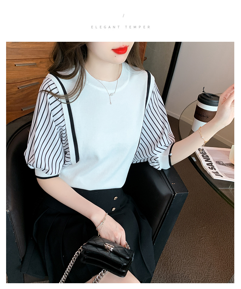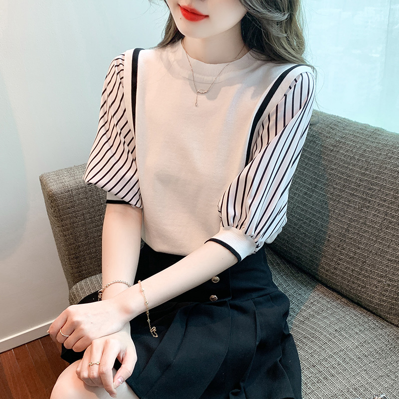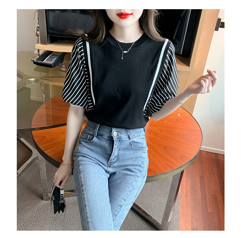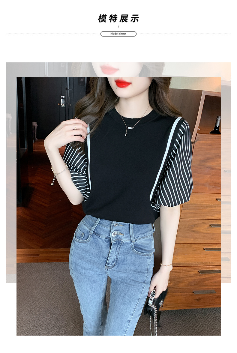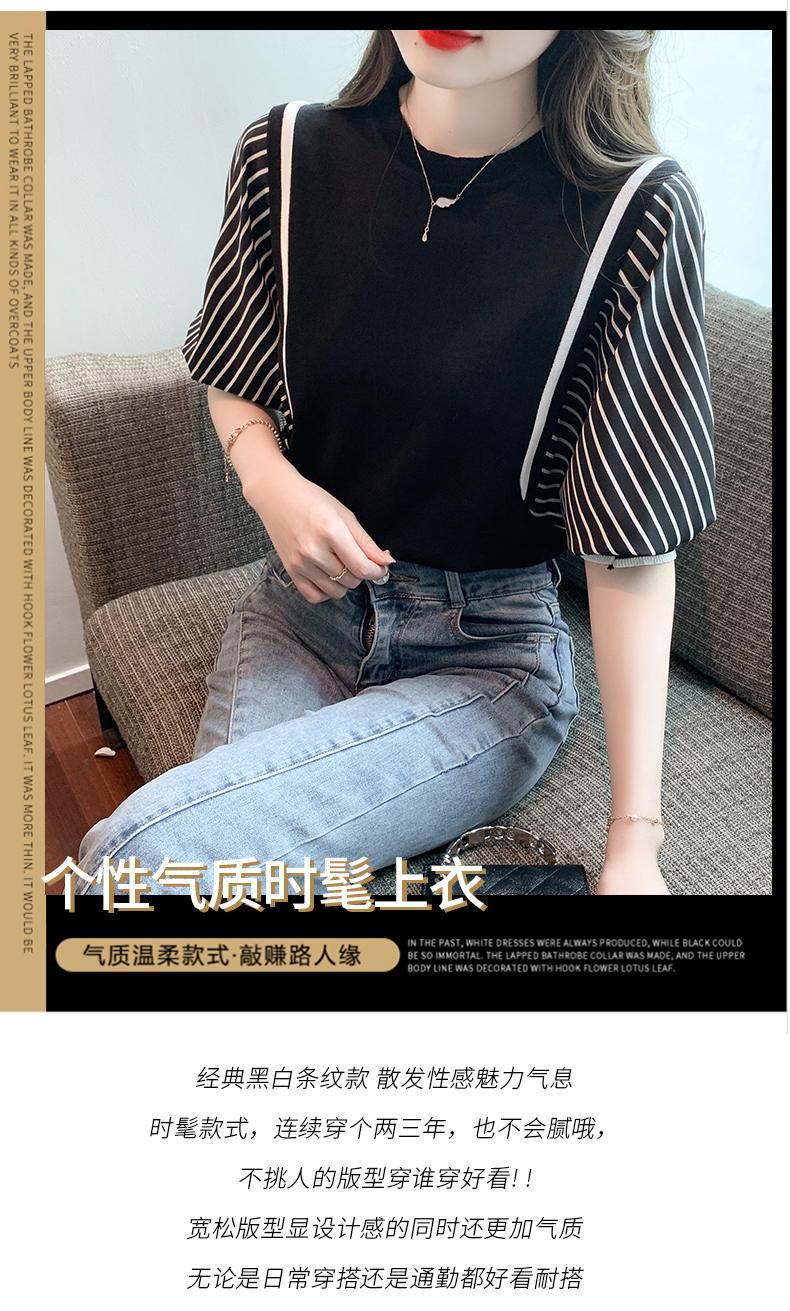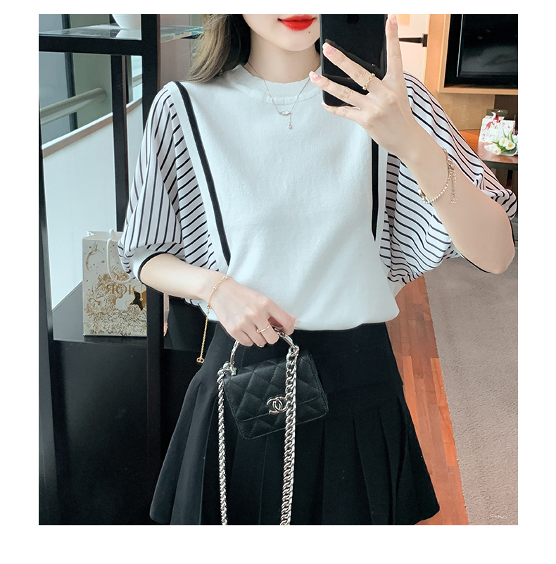 PF1941#新款上衣蝙蝠衫女装短袖冰丝针织衫初夏条纹纯色打底衫