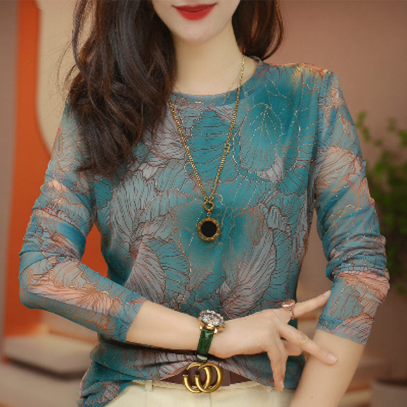 PF1968#新款圆领肌肤网纱上衣小衫透气双层高级百搭显瘦套头洋气