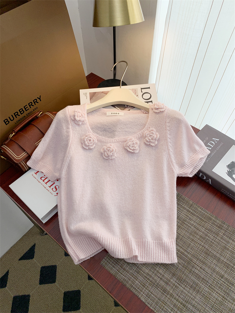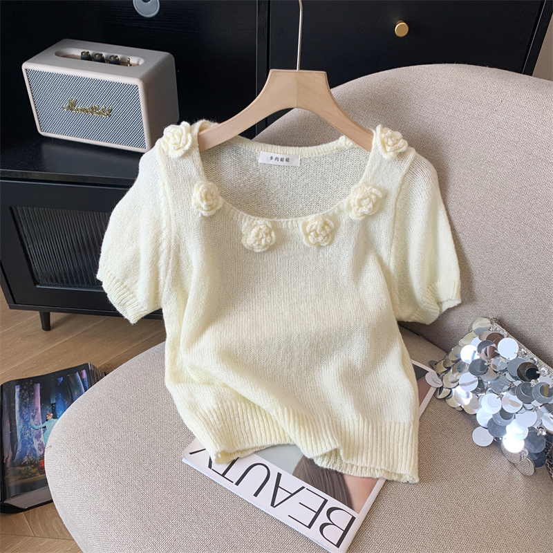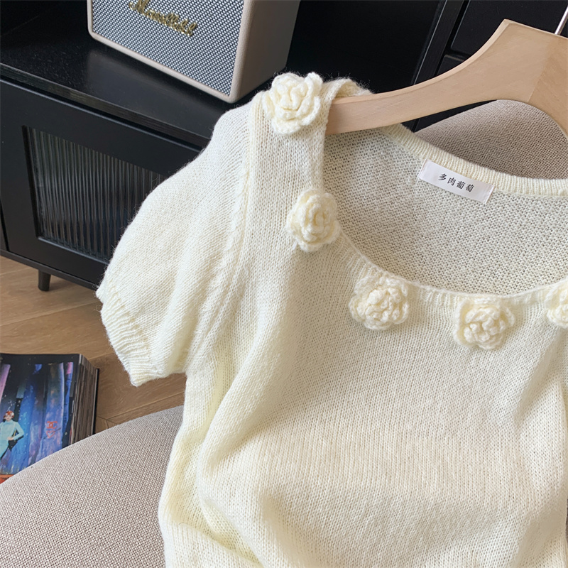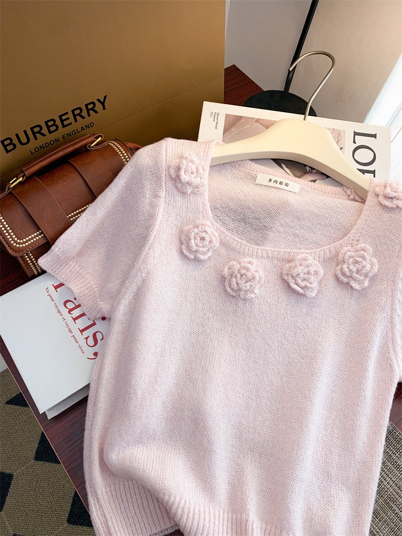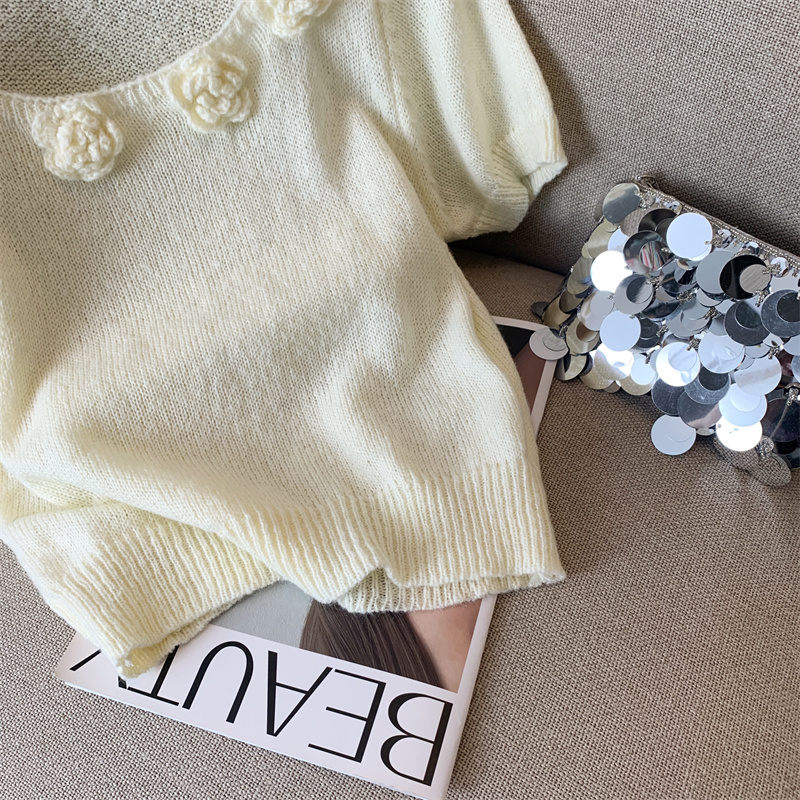 PF1992#新款韩系甜美减龄小清新立体花朵方领短袖短款针织衫女