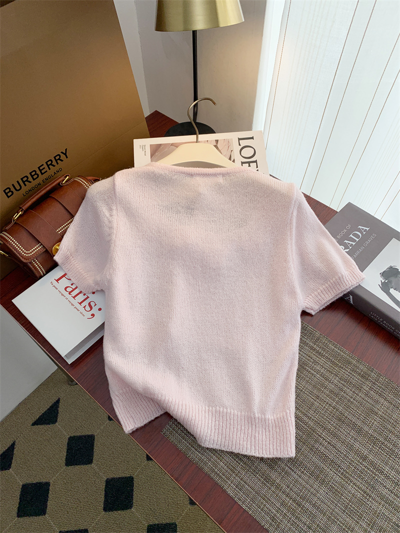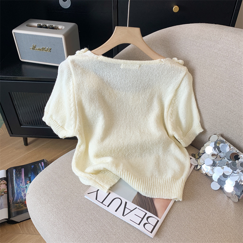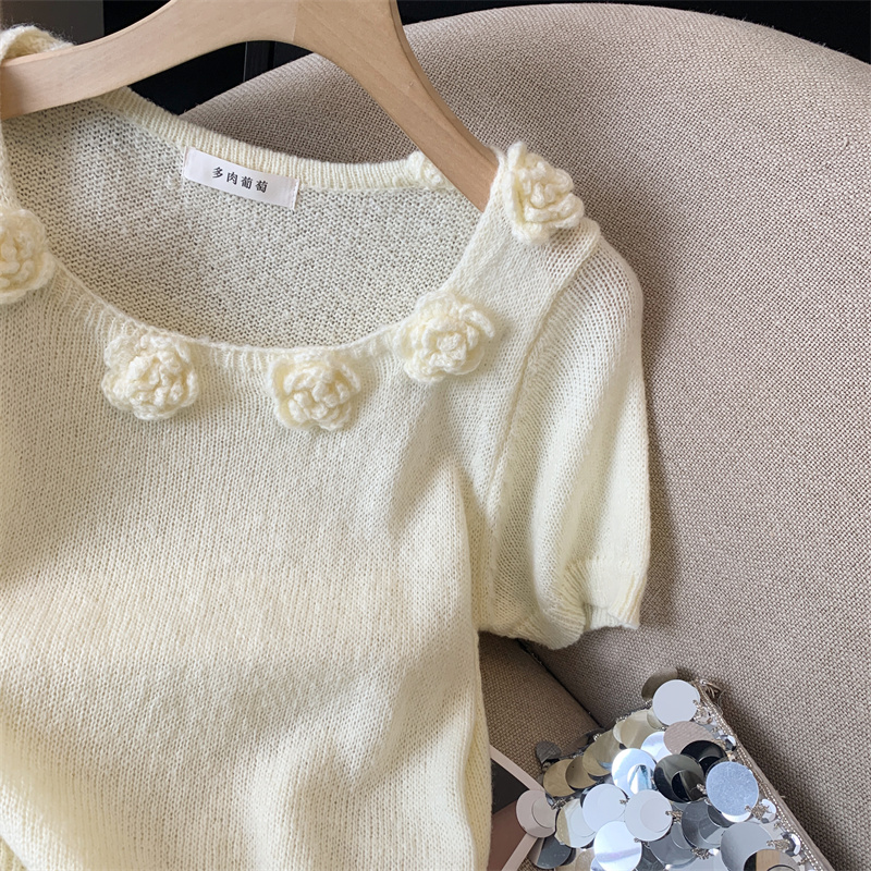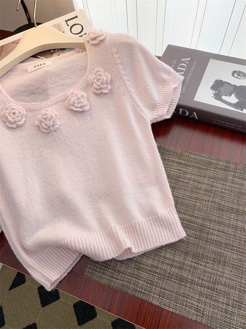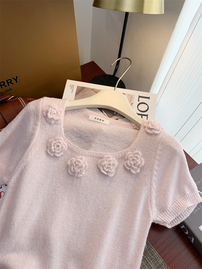 PF1992#新款韩系甜美减龄小清新立体花朵方领短袖短款针织衫女