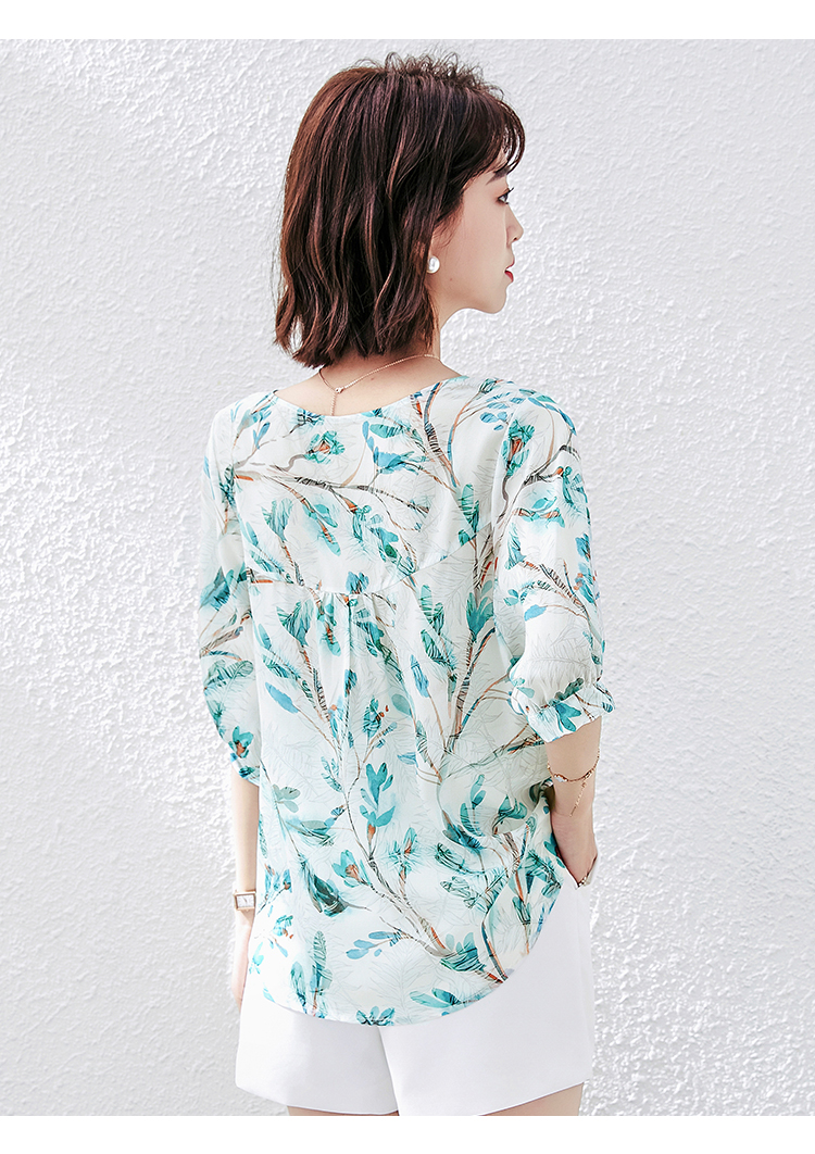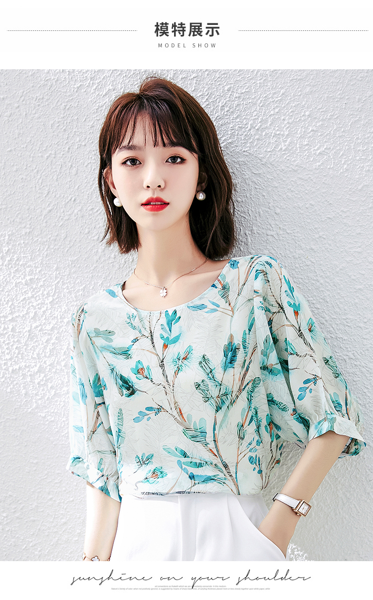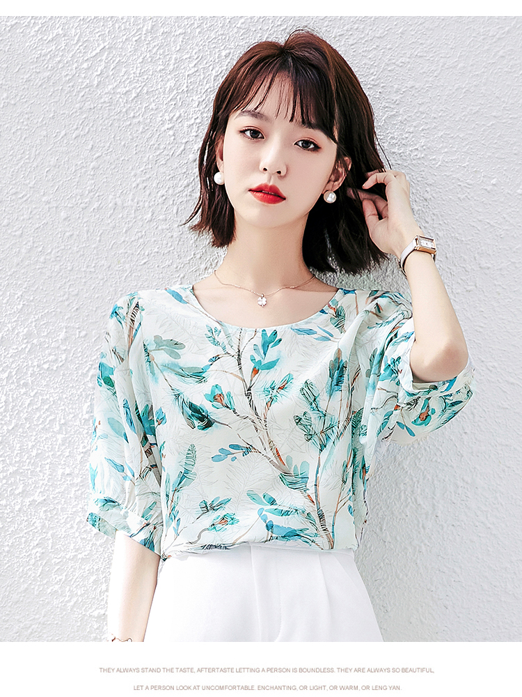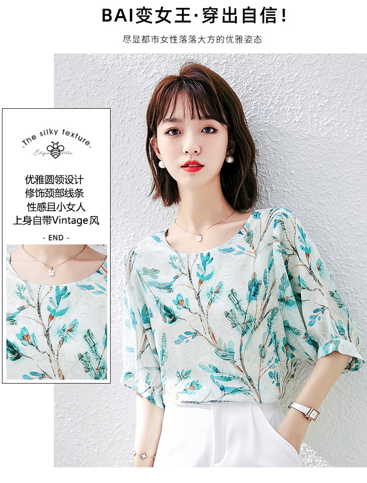 PF1997#雪纺衫短袖衬衫女夏 新款气质印花桑蚕丝半袖衬衣上衣女