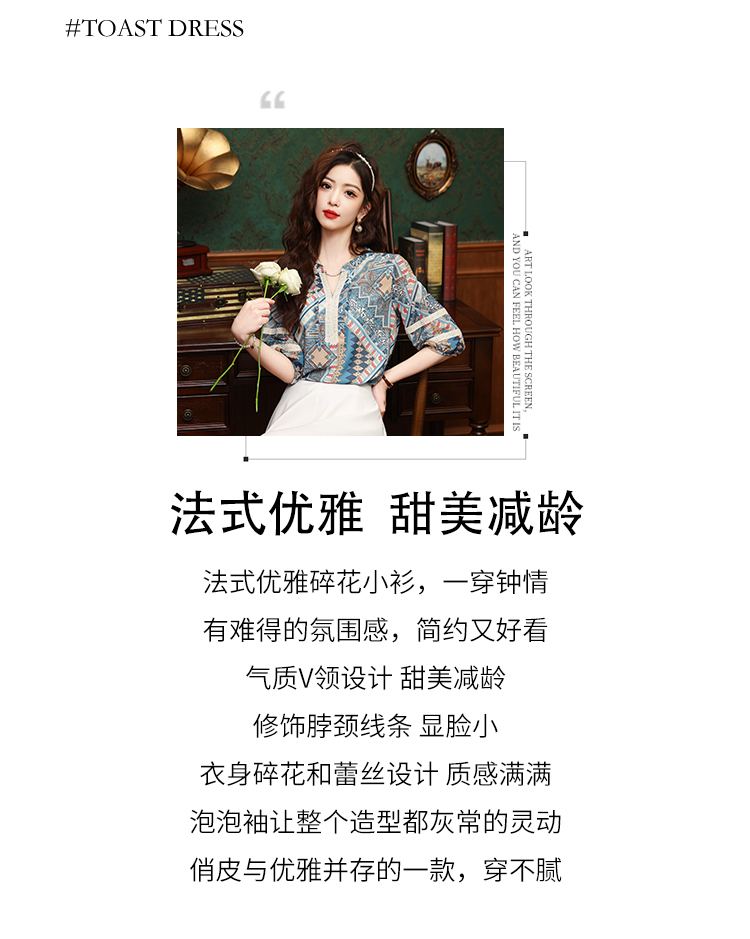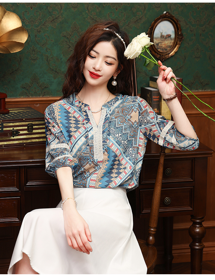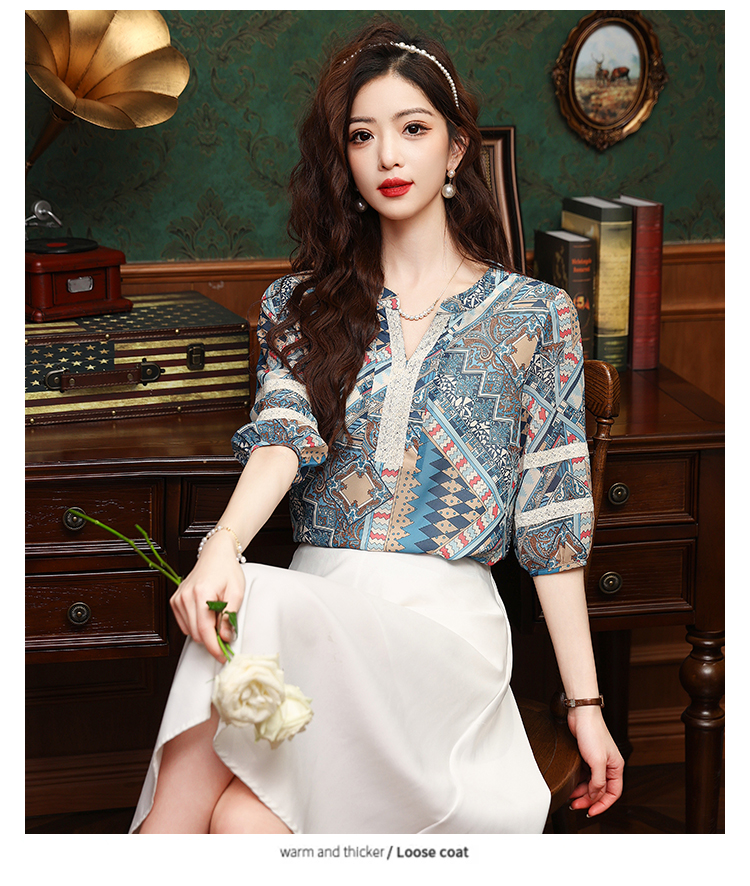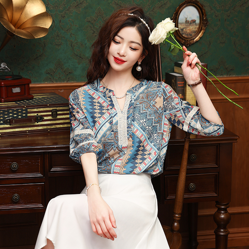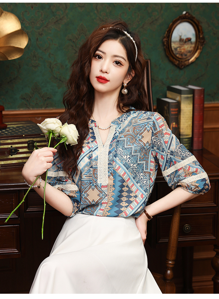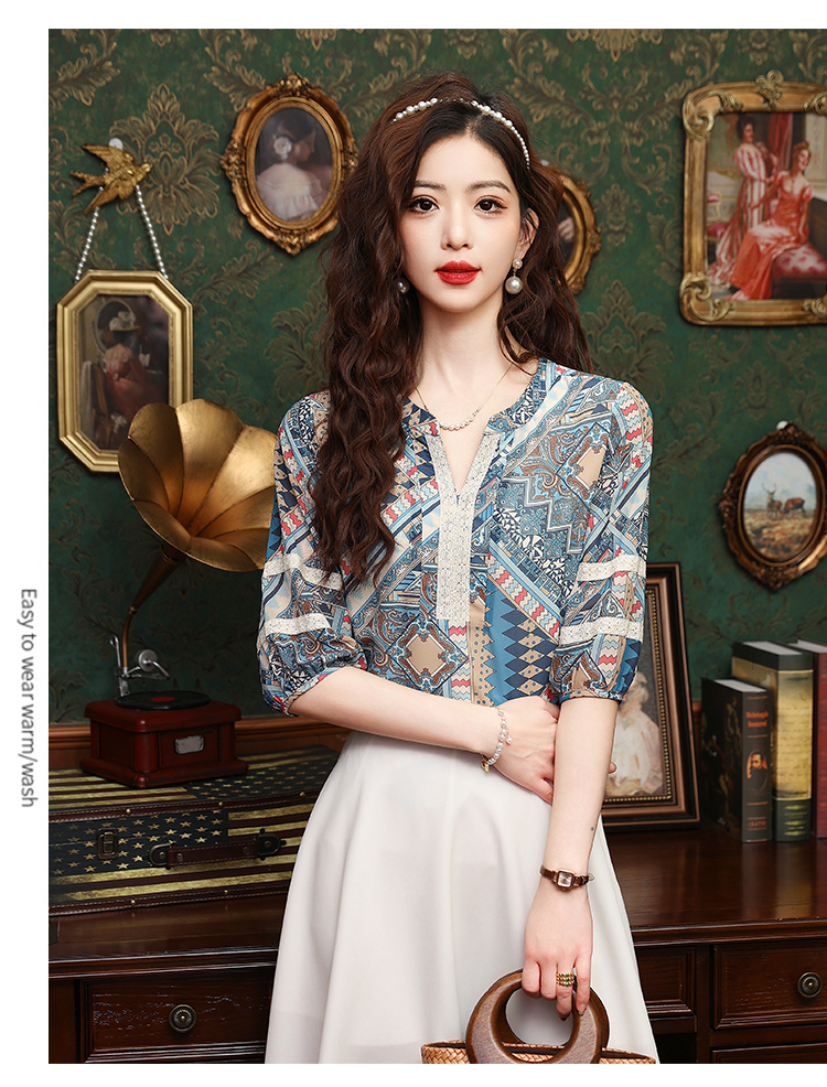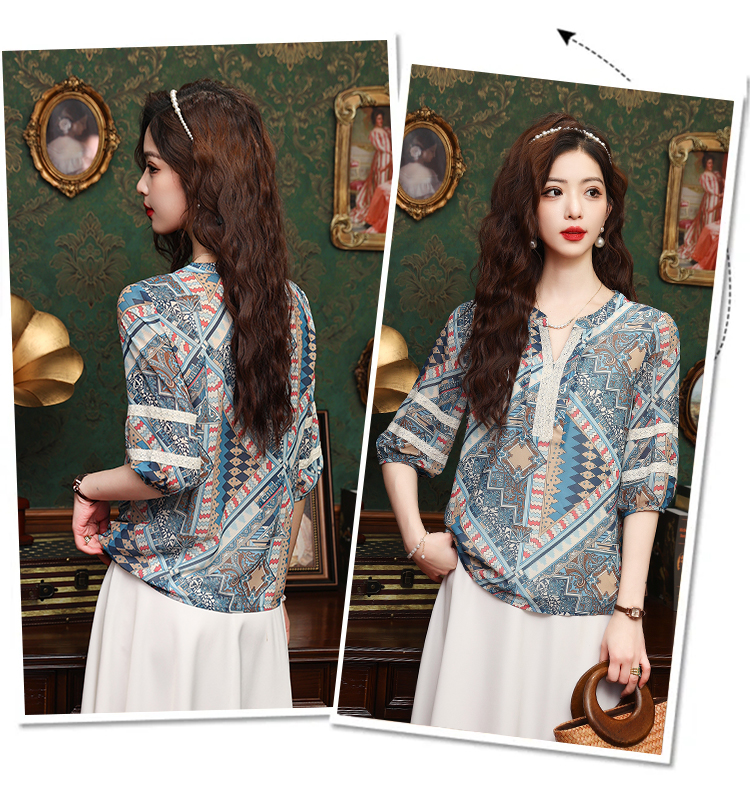 PF1999#民族风雪纺印花 夏季新款小V领中袖蕾丝边轻薄女衬衫