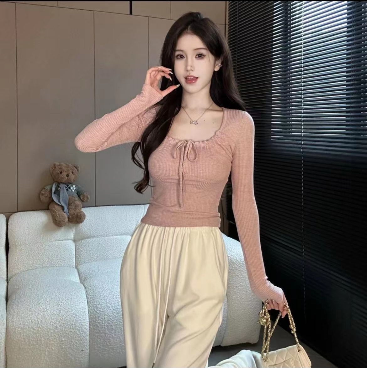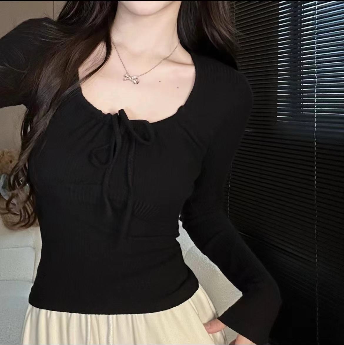 PF2007#大码 纯欲风方领辣妹上衣 新款打底衫别致修身长袖t恤女