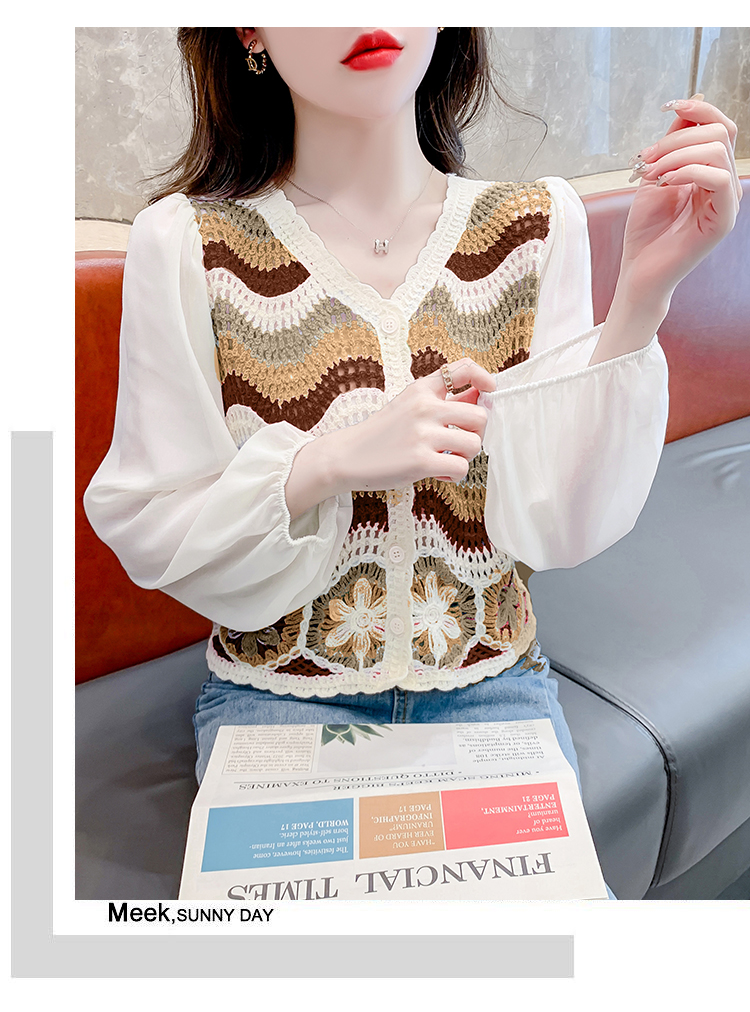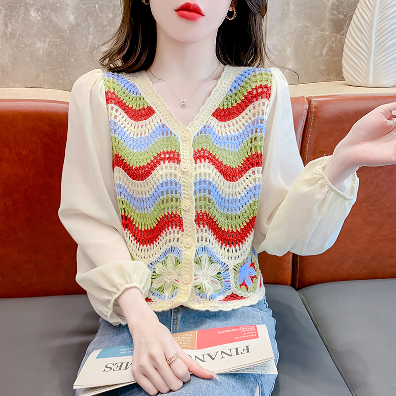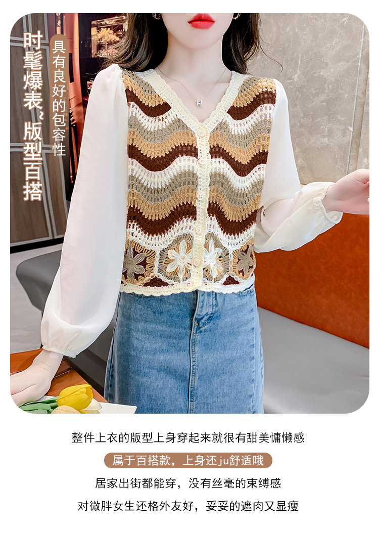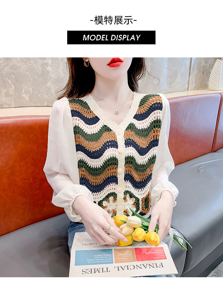 PF2025#新款条纹针织拼接雪纺长袖开衫甜美温柔风减龄上衣女
