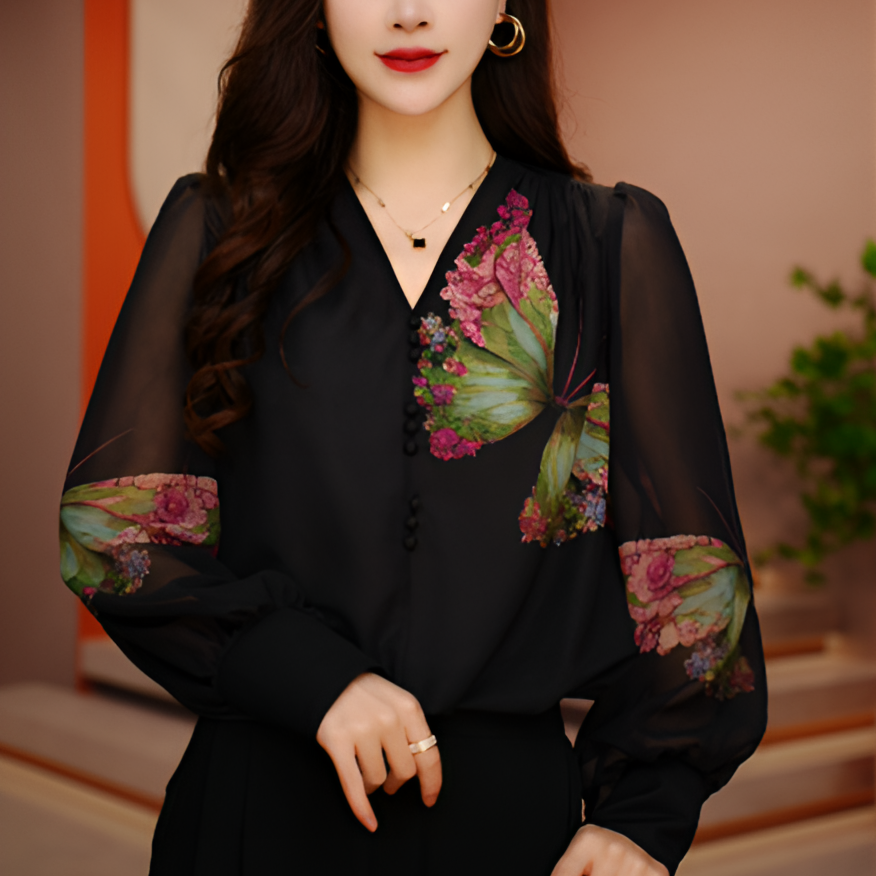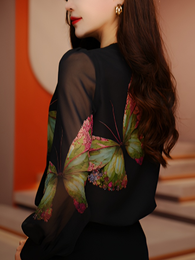 PF2029#新款肌肤网纱高领显瘦减龄透气印花套头小衫