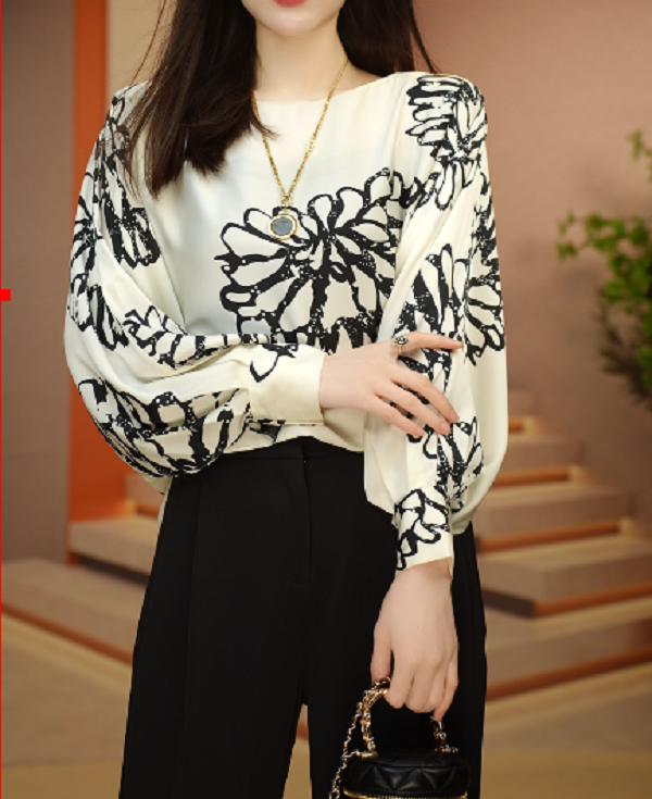 PF2032# 上衣百搭时尚气质连袖一字领印花洋气经典高级上衣