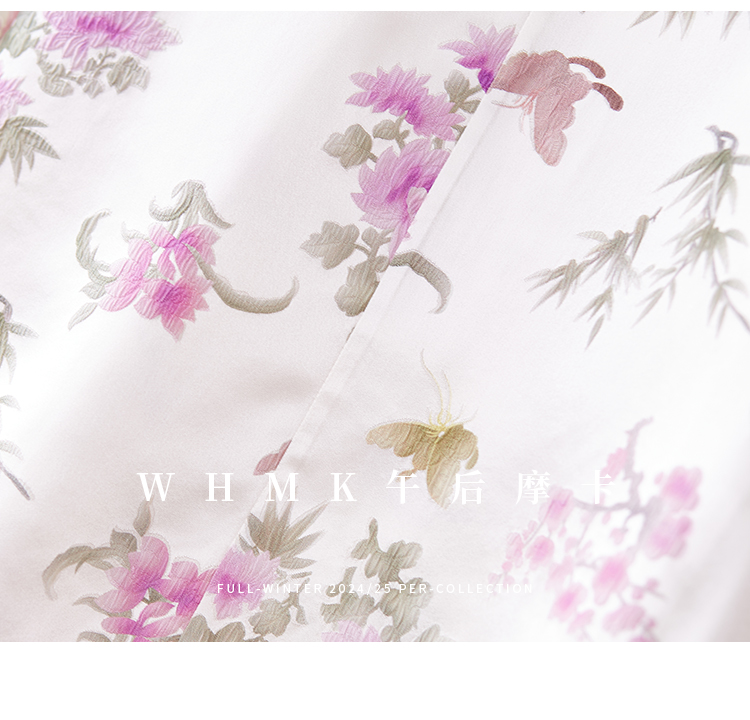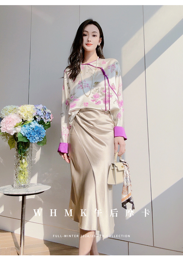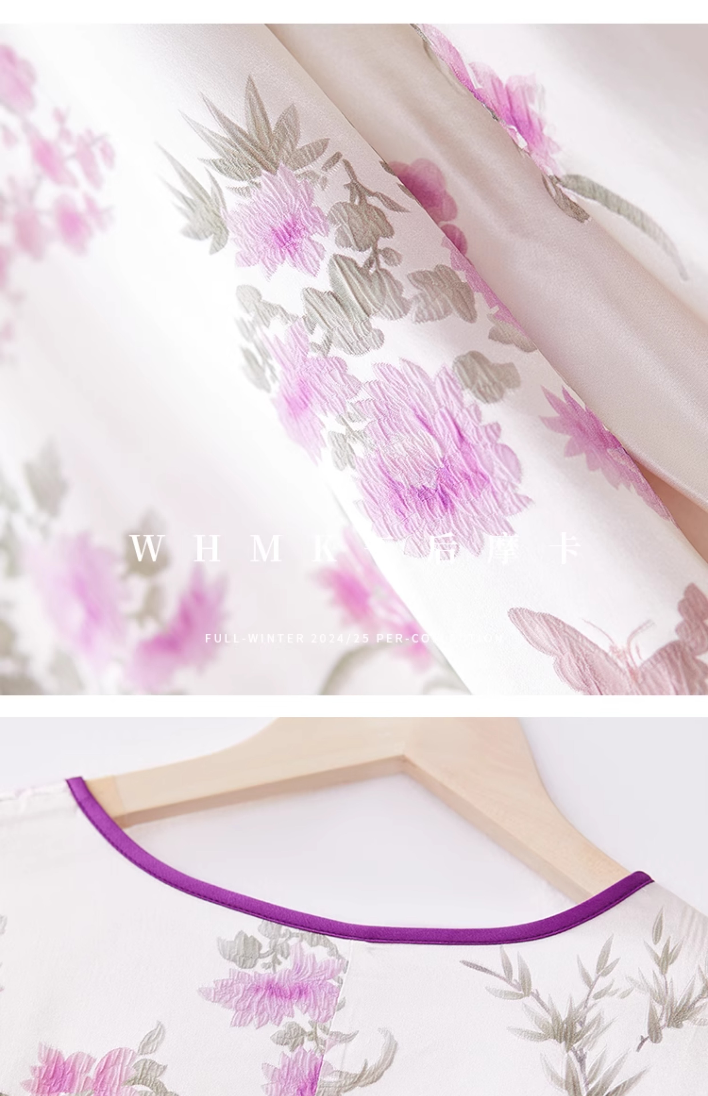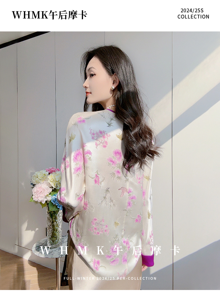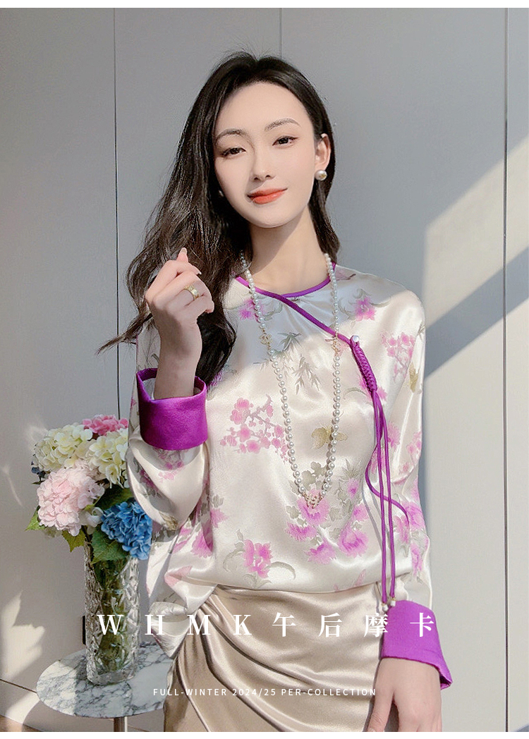 PF2034#复古国风仿桑蚕丝提花上衣女长袖圆领斜襟盘扣蝶恋花新中式仿真丝