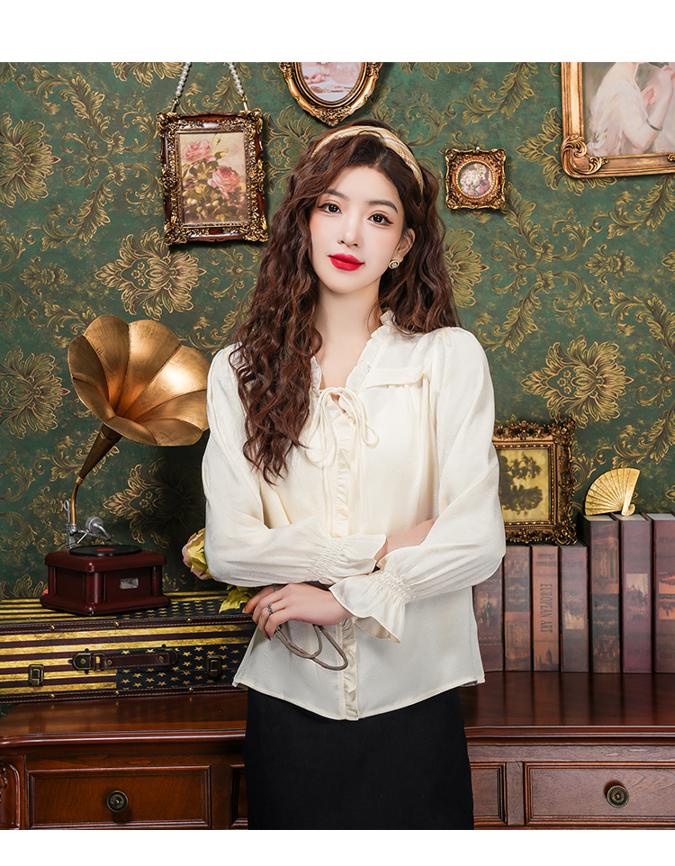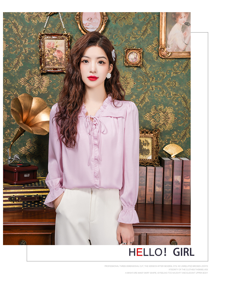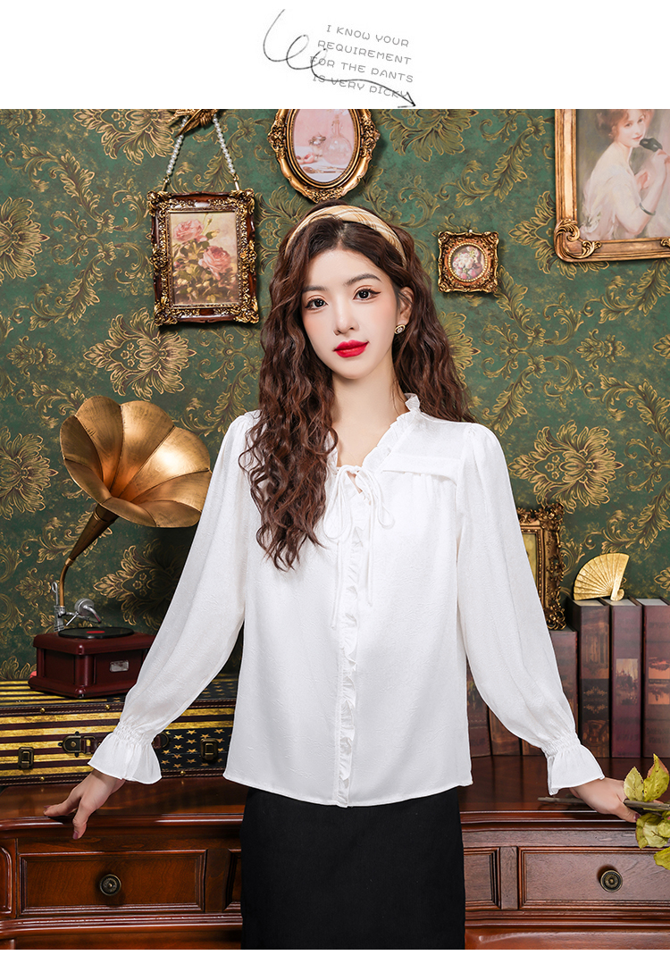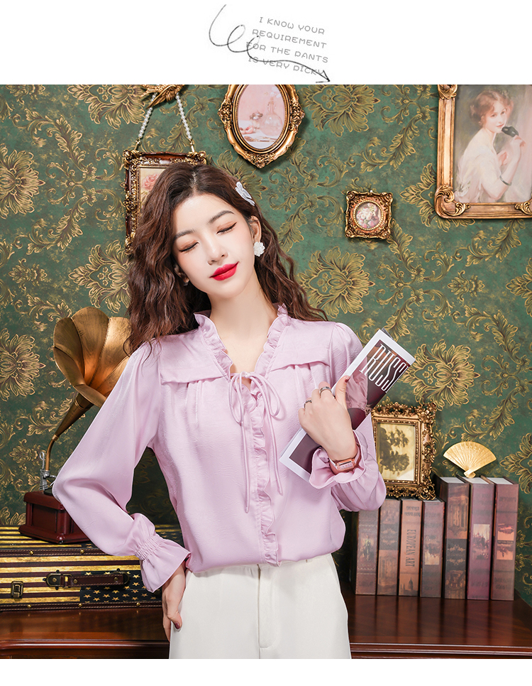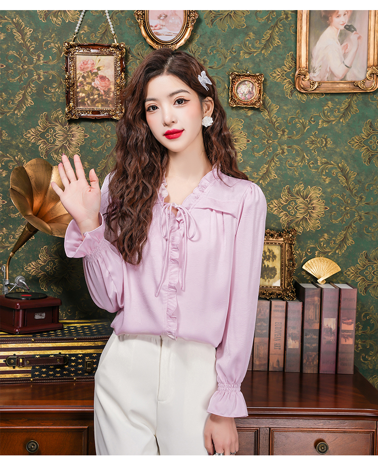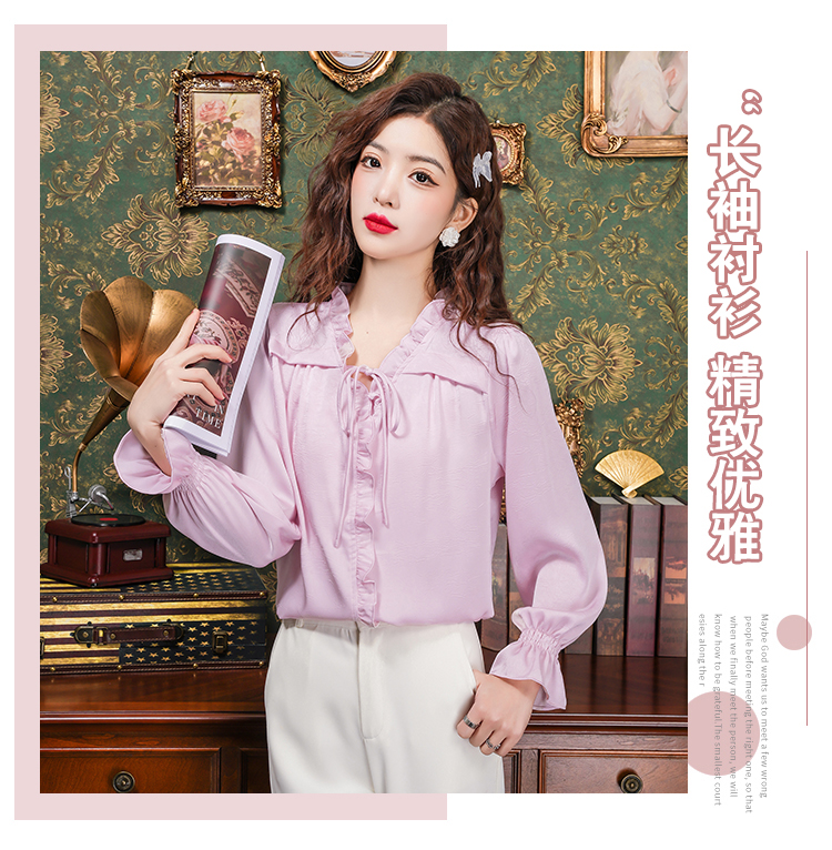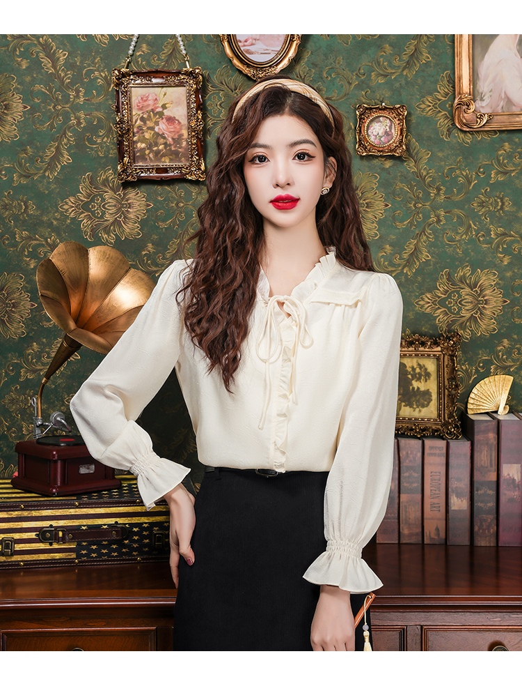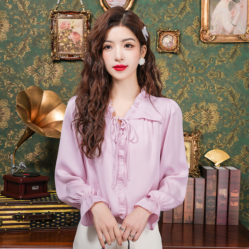 PF2442#法式温柔风蕾丝衫/雪纺衫韩版大气甜美系带荷叶边长袖洋气上衣女