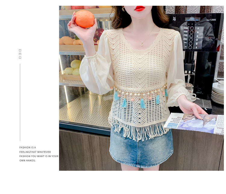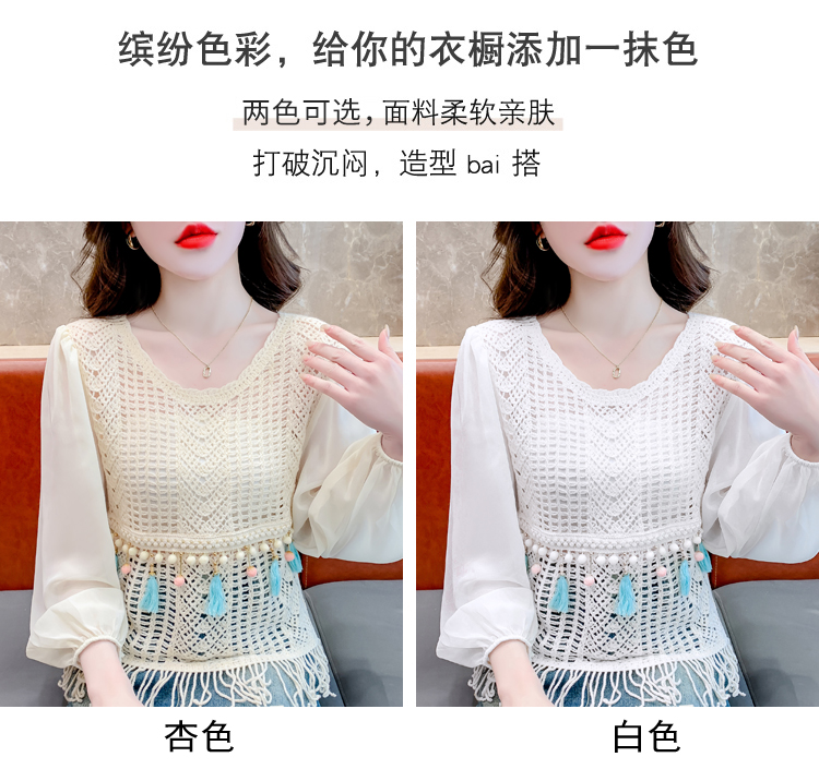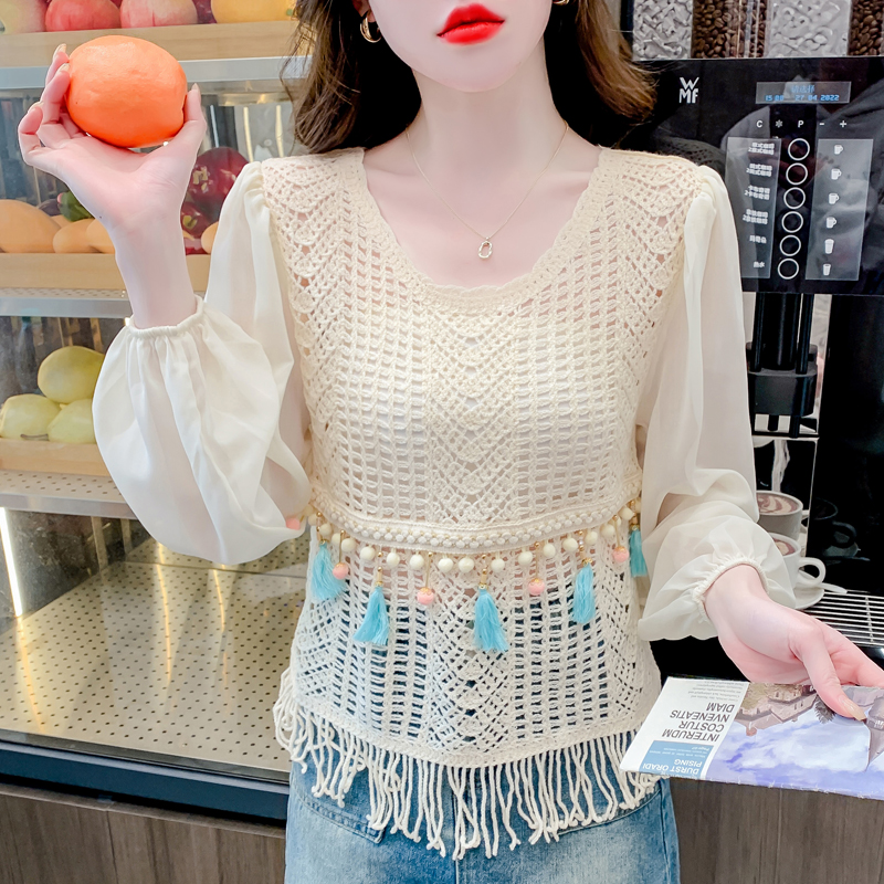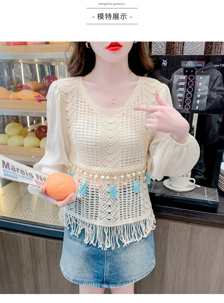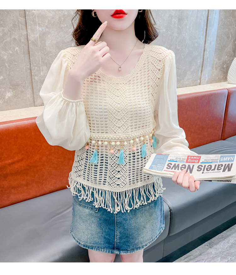 PF2443#流苏镂空针织衫拼接雪纺袖设计感小众别致漂亮长袖小衫上衣女