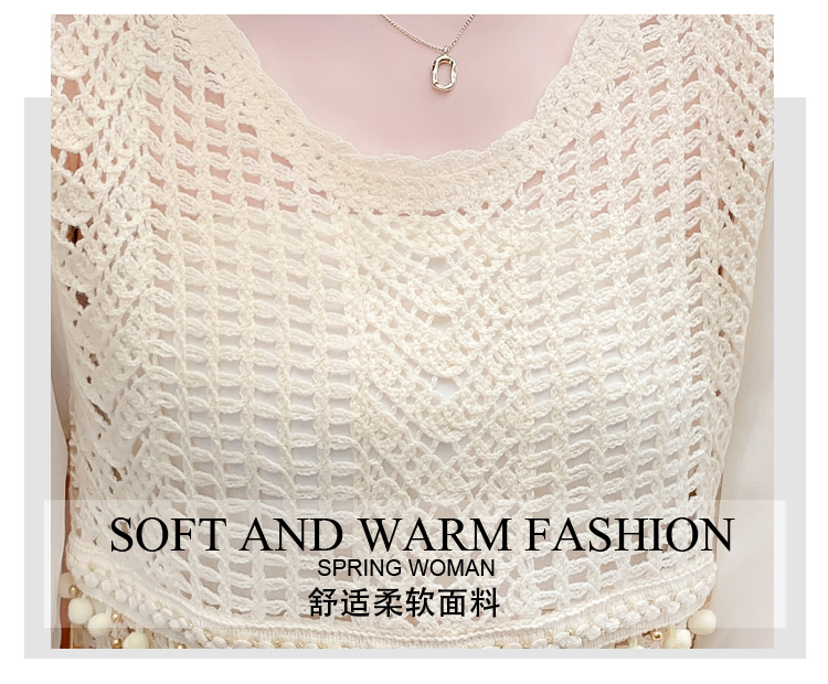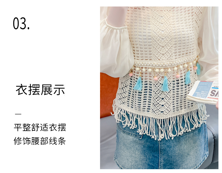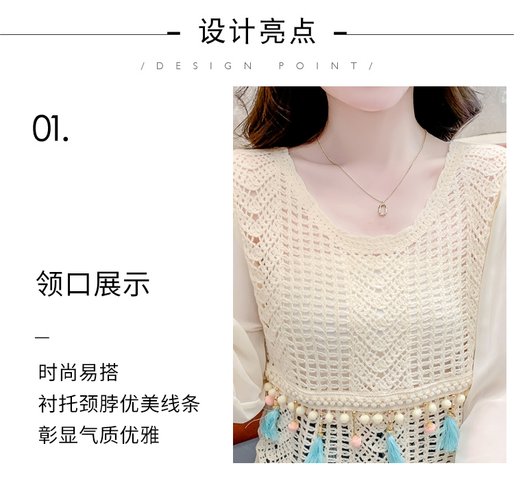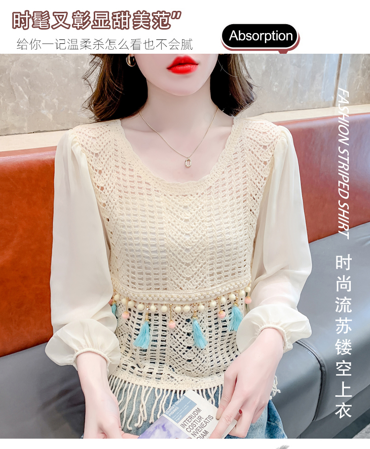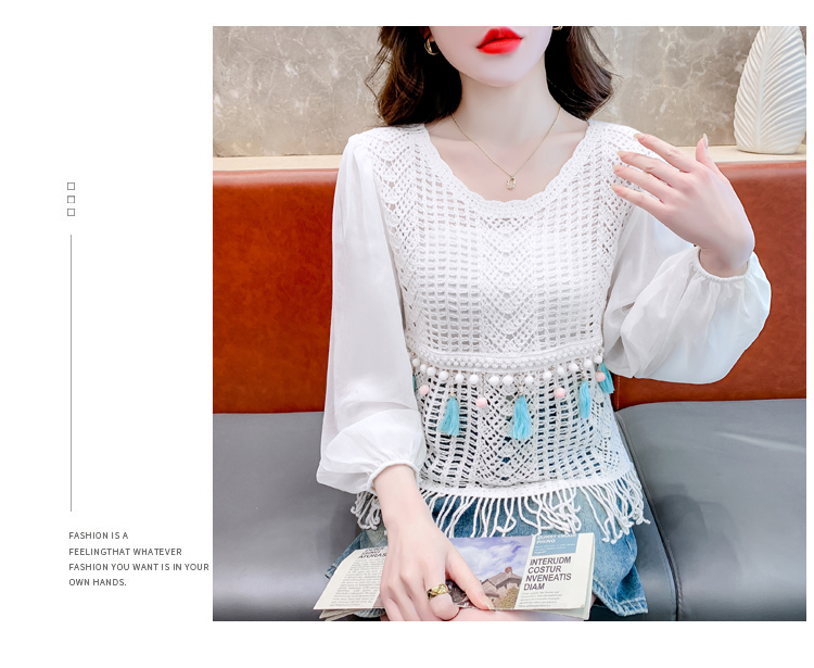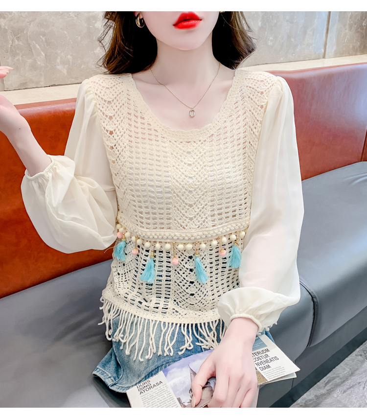 PF2443#流苏镂空针织衫拼接雪纺袖设计感小众别致漂亮长袖小衫上衣女