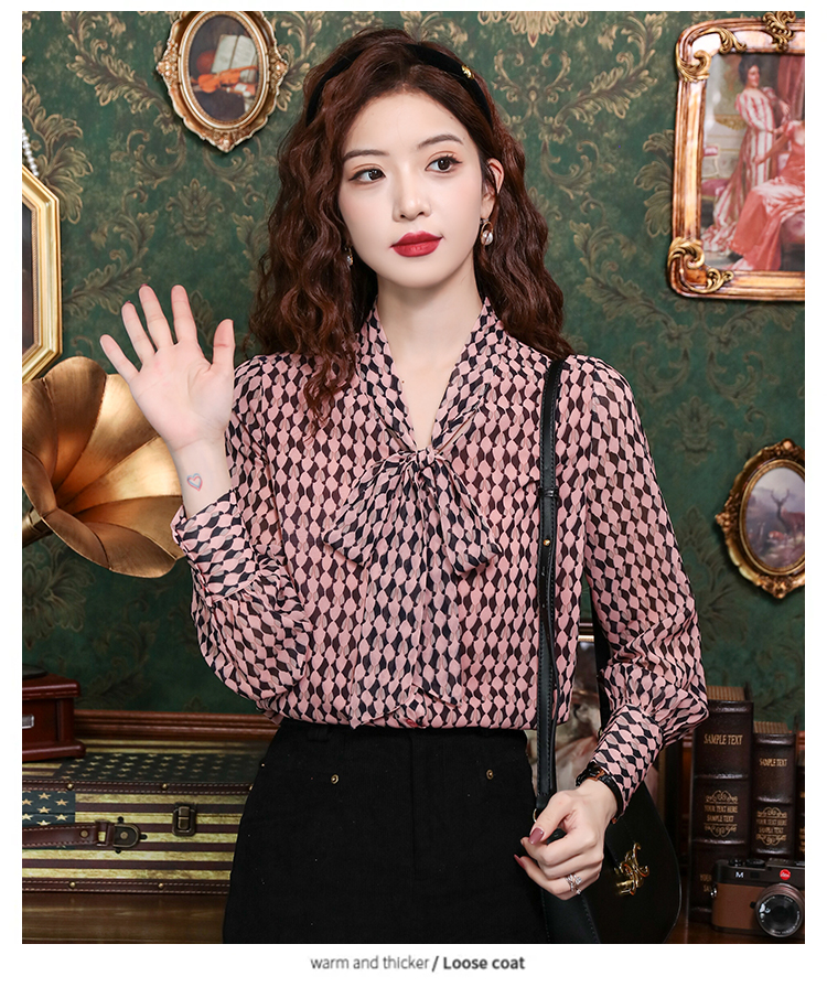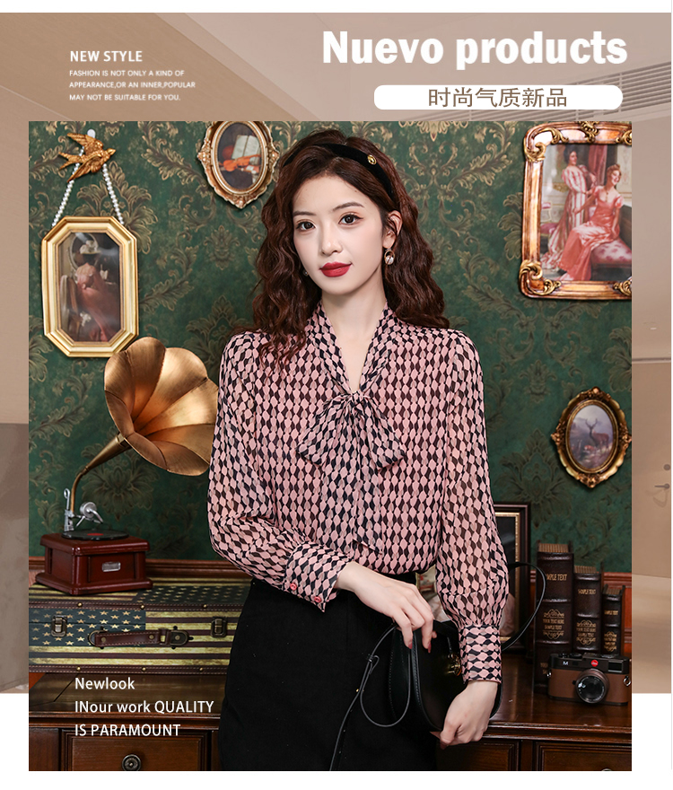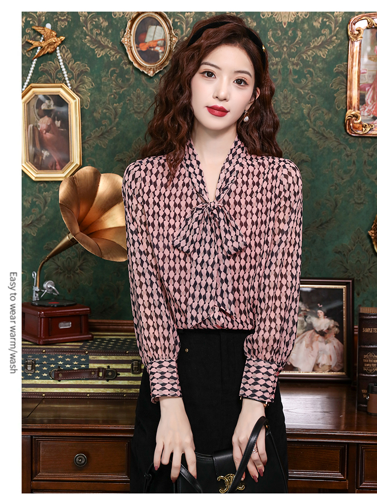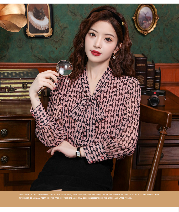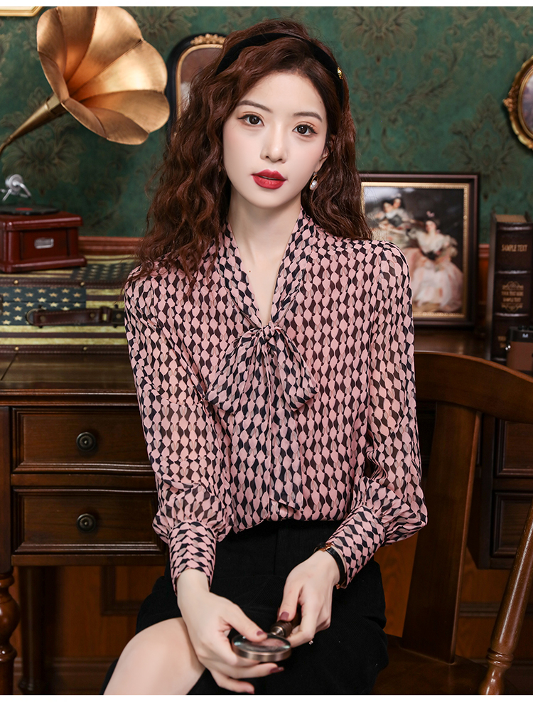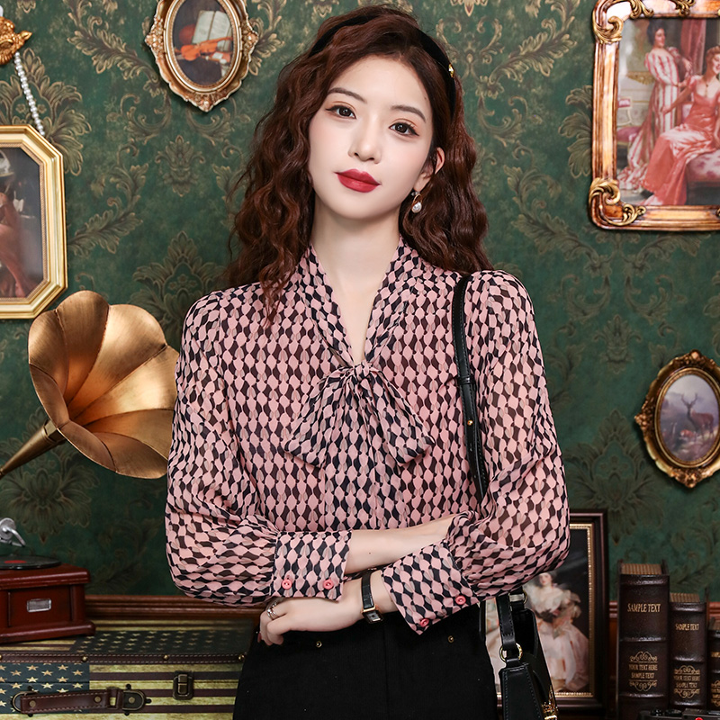PF2470#新款气质小众衬衣洋气小衫蝴蝶结上衣粉色系带雪纺衫