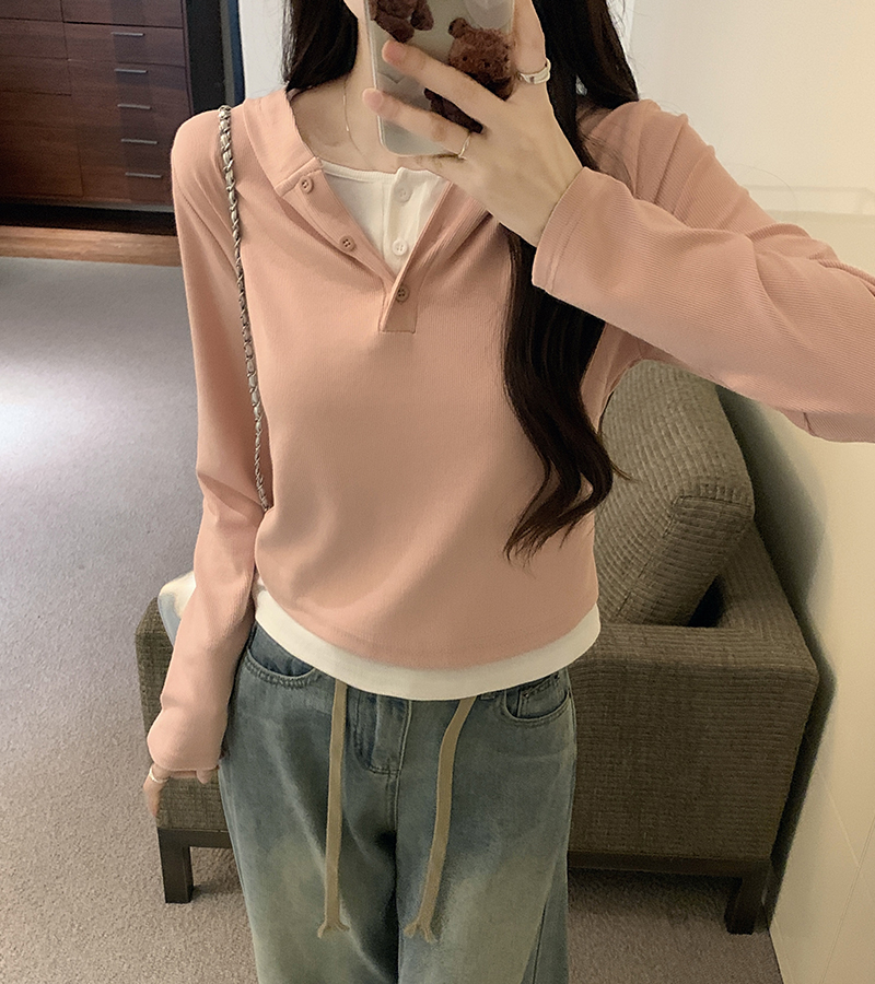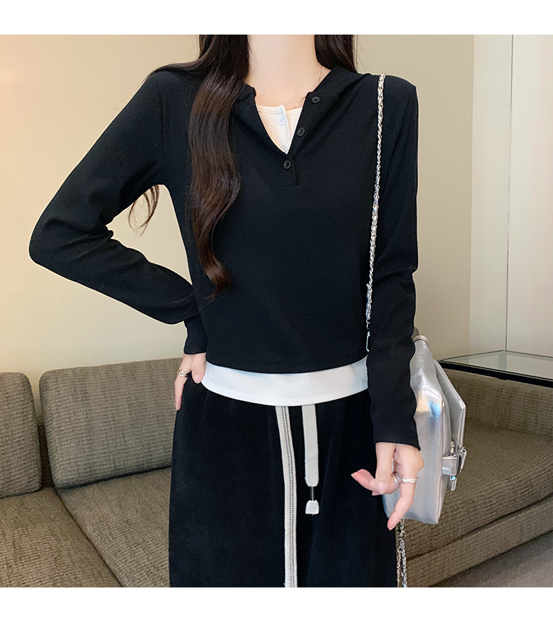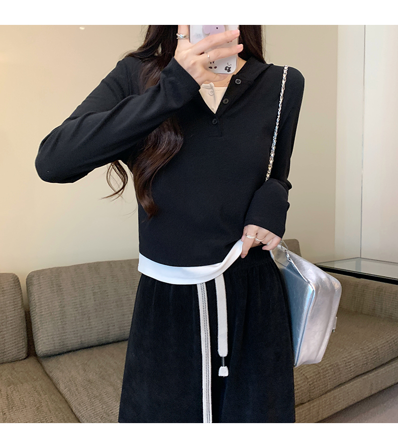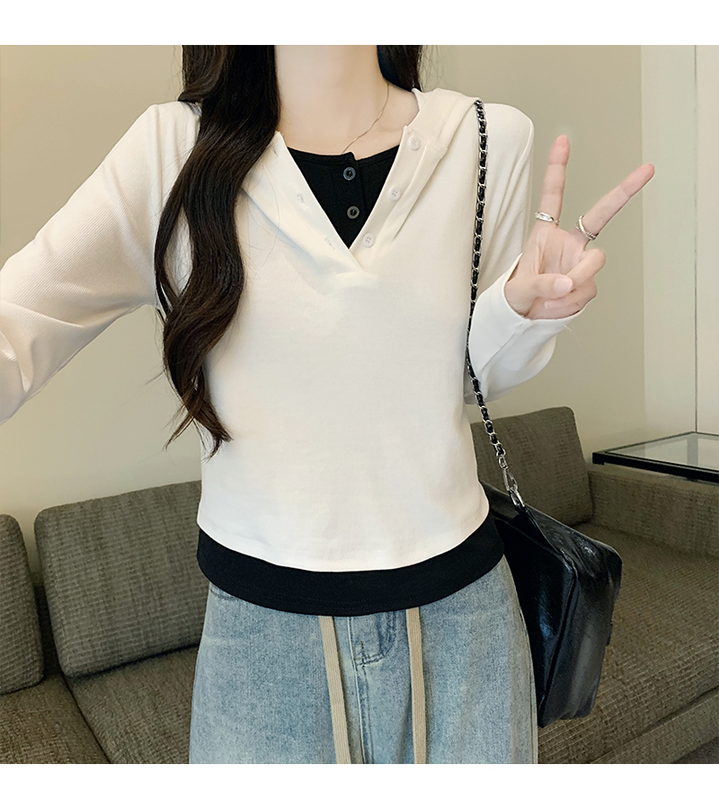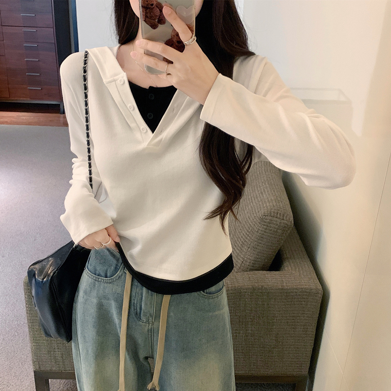 PF2642#连帽假两件撞色长袖t恤女春装新款修身显瘦带帽短款内搭打底上衣
