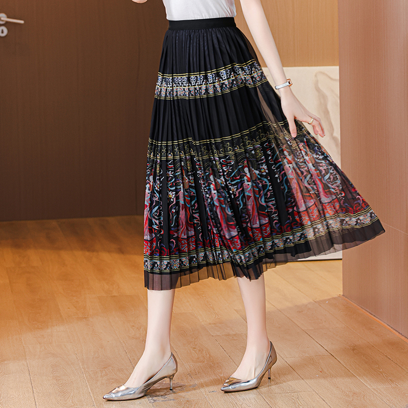 PF2672#新中式国风改良汉服日常装定制网纱印花款一片式百褶裙半身裙