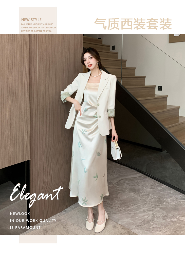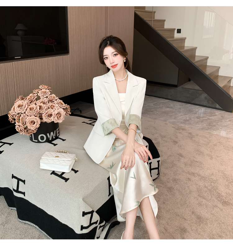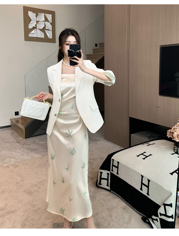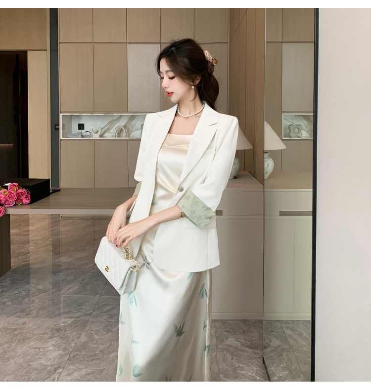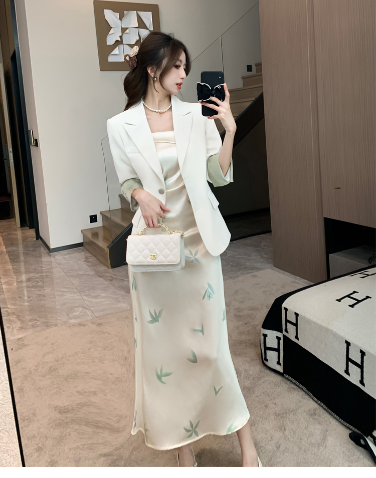 PF2728#白色西装碎花吊带裙套装女春夏七分袖温柔风通勤两件套