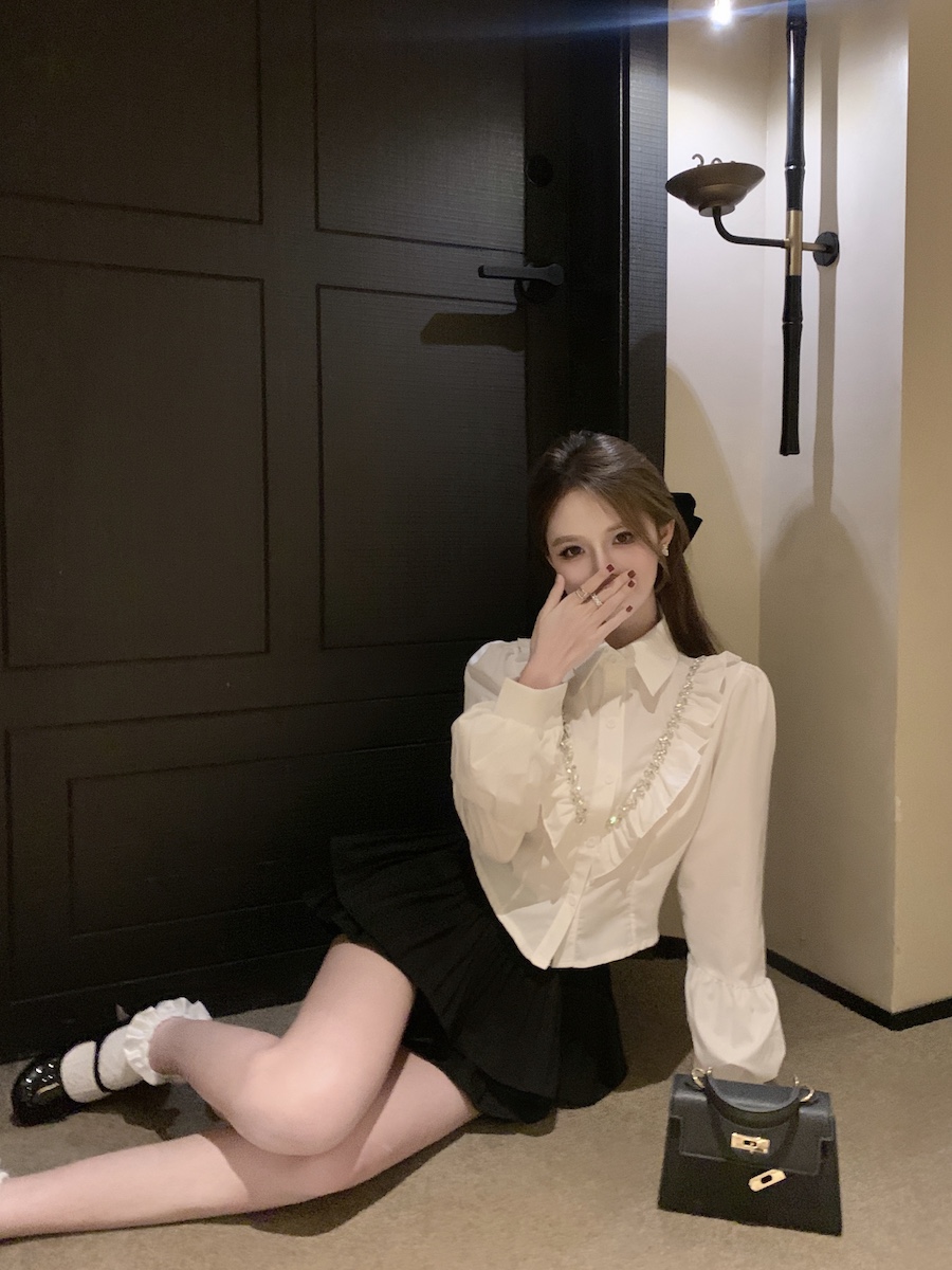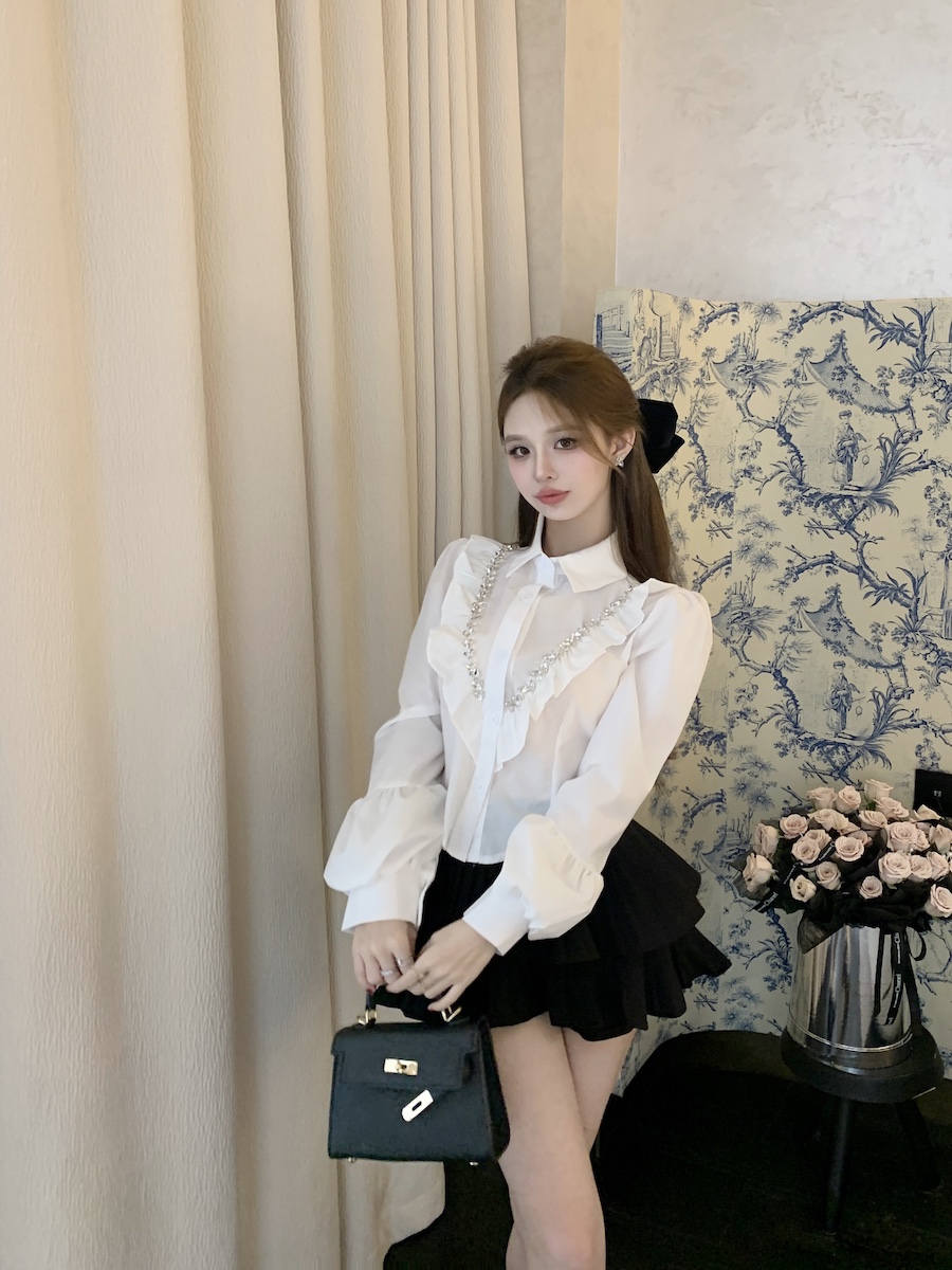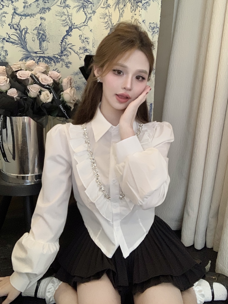 PF2772#新款小香风V型水钻褶皱花边灯笼袖气质衬衫衬衣