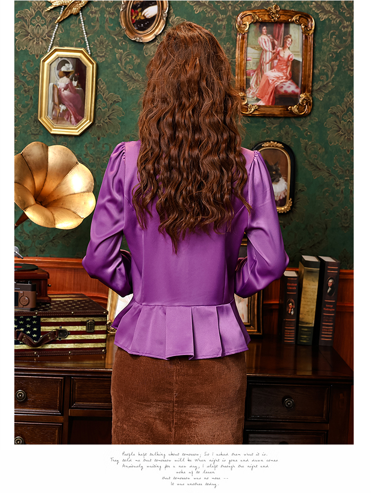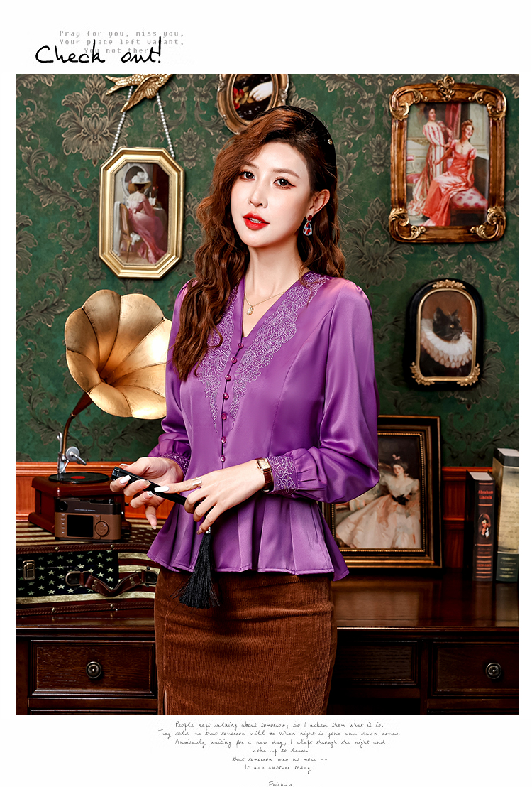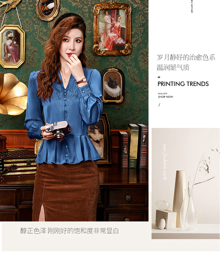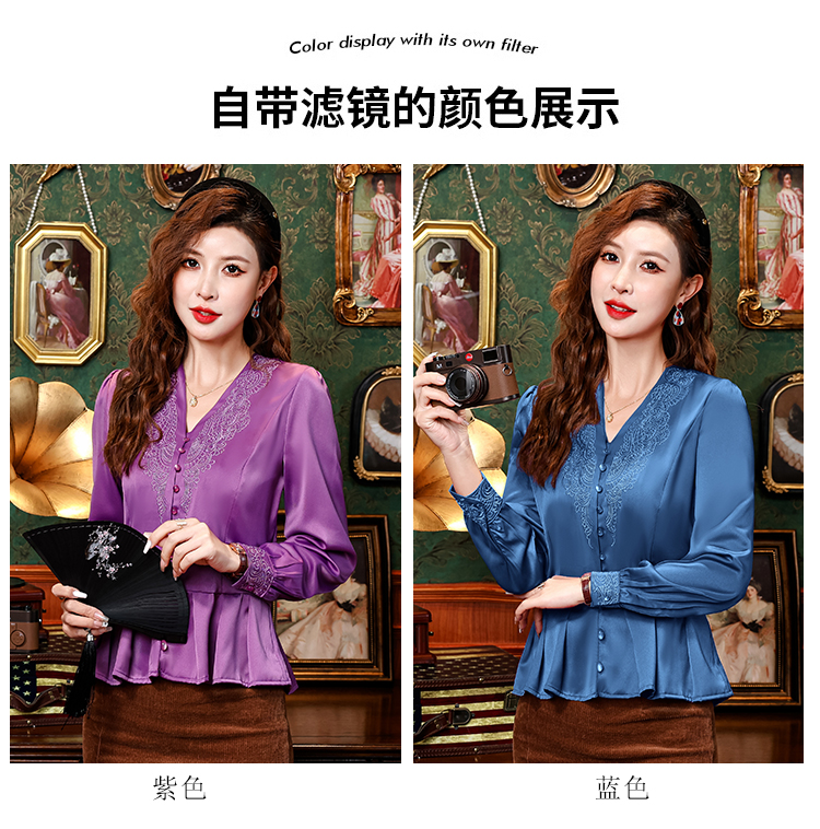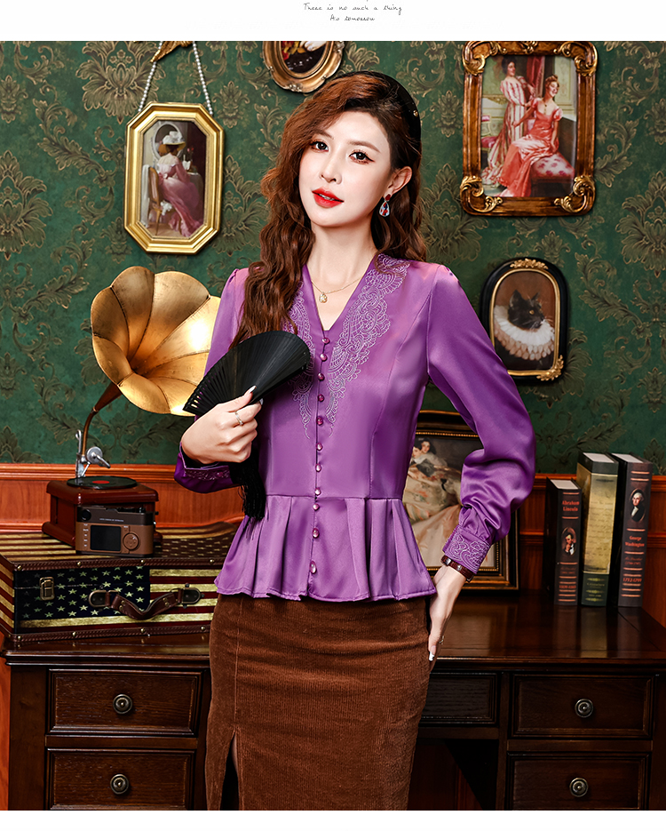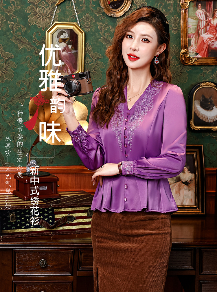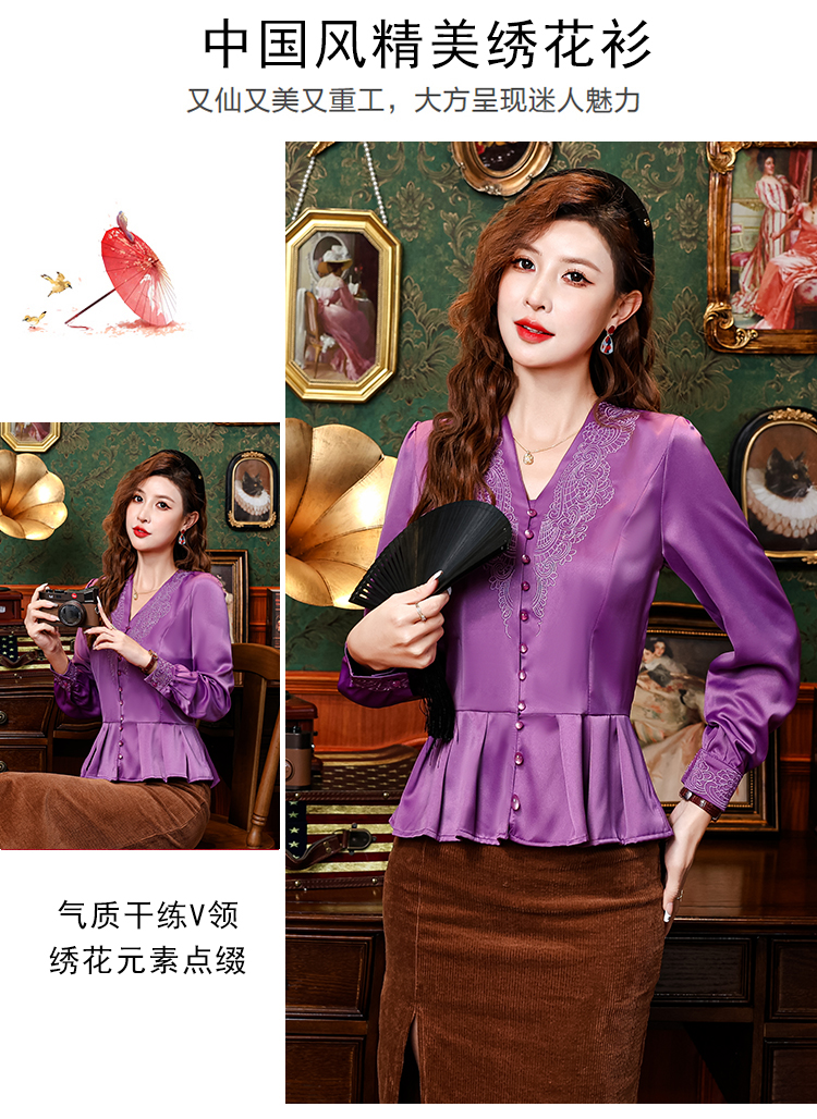 PF2853#中老年刺绣花衬衫女长袖上衣v领衬衣气质遮肚子收腰显瘦